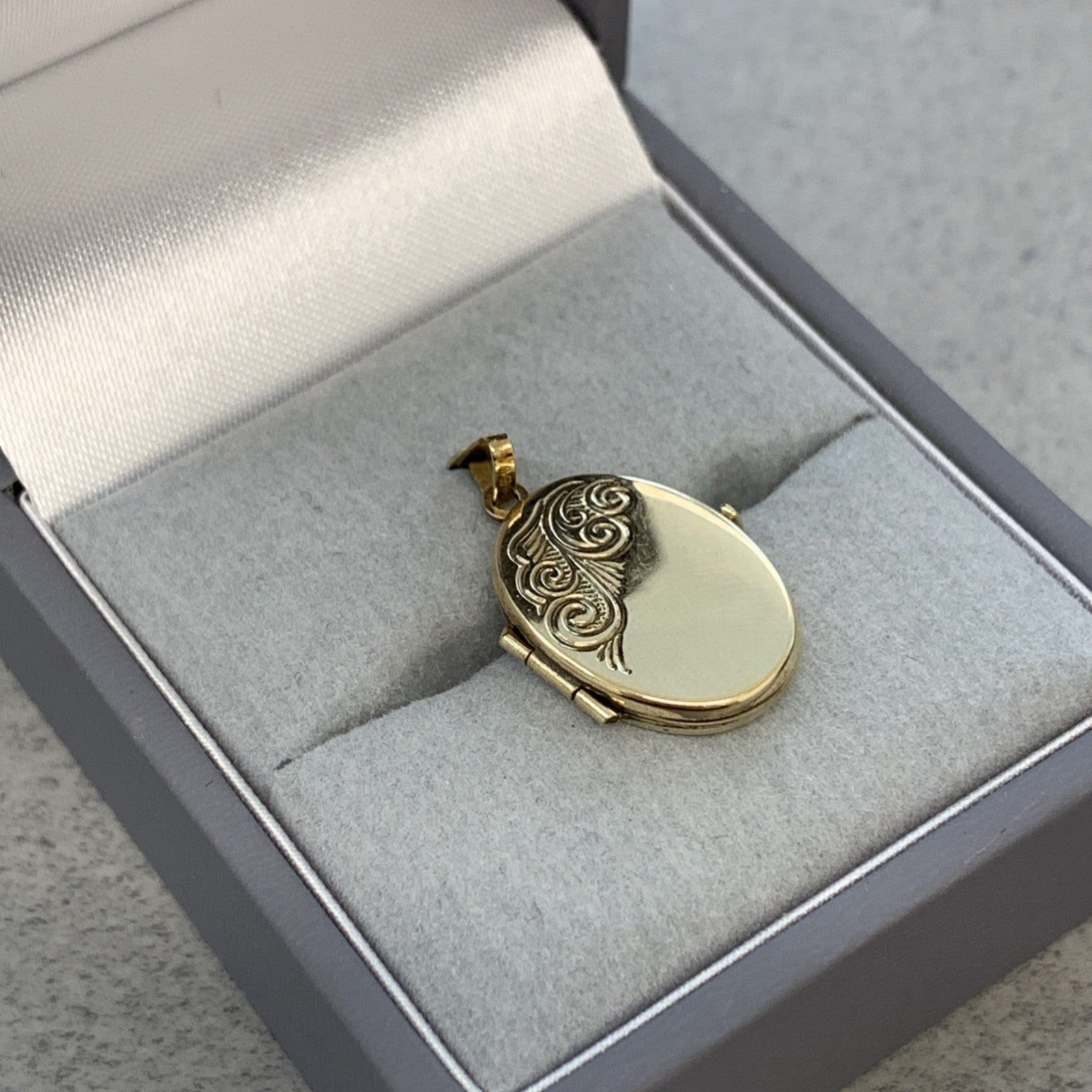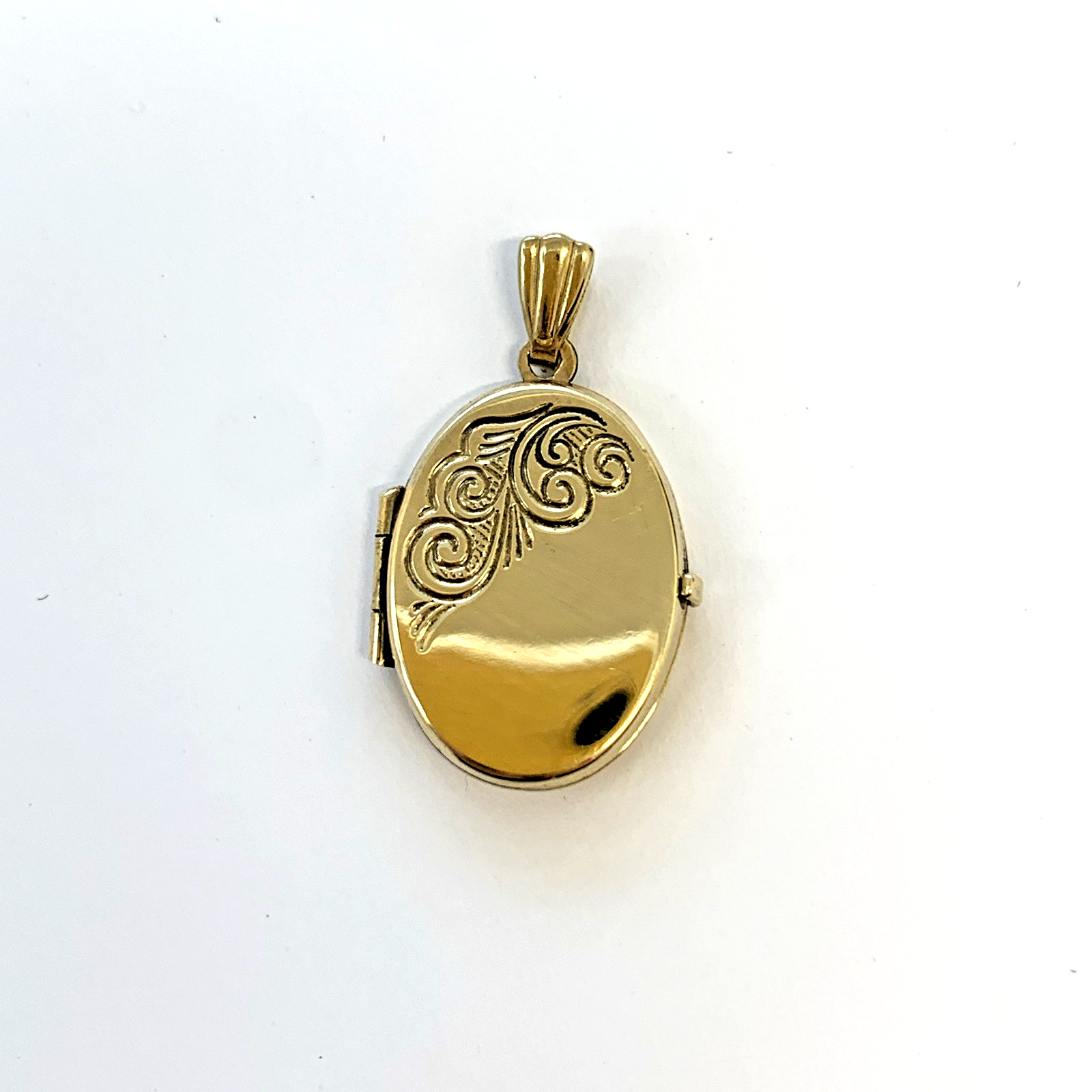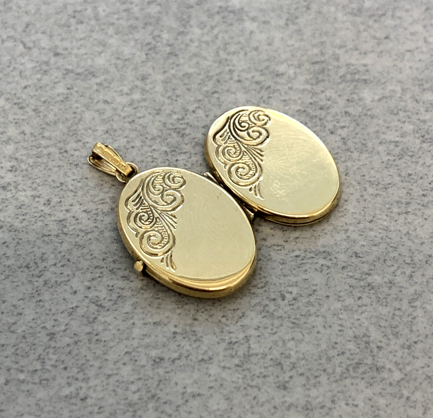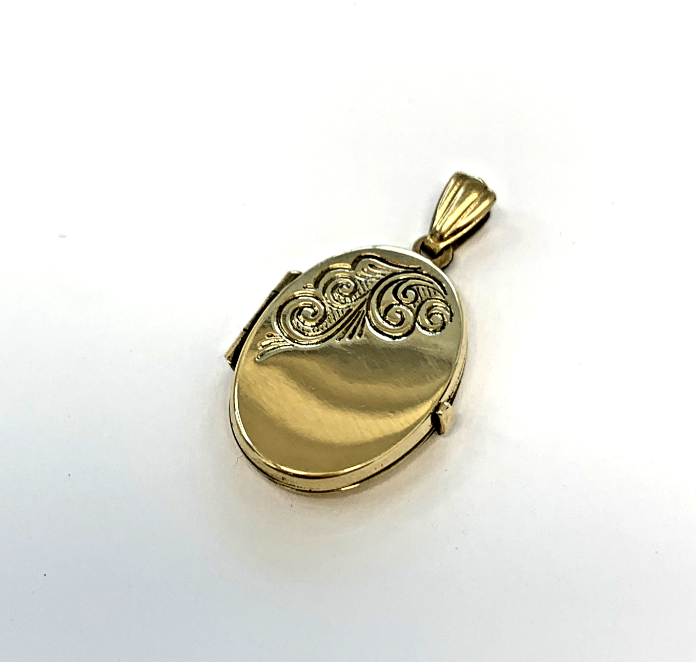 A beautiful petite oval shaped gold locket pendant featuring engraved patterns on both sides.