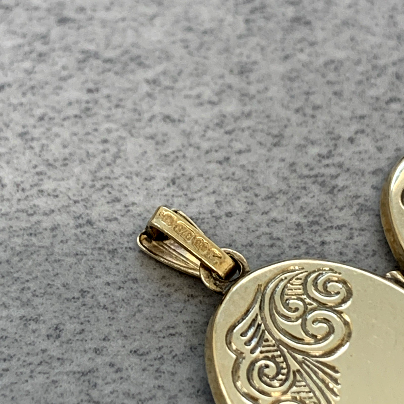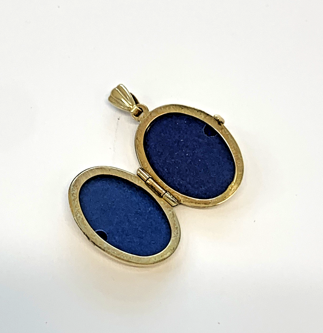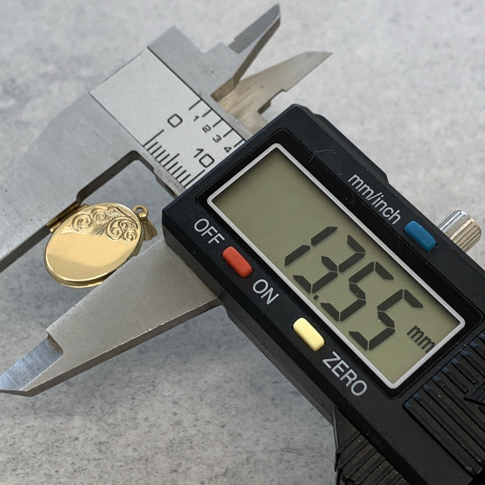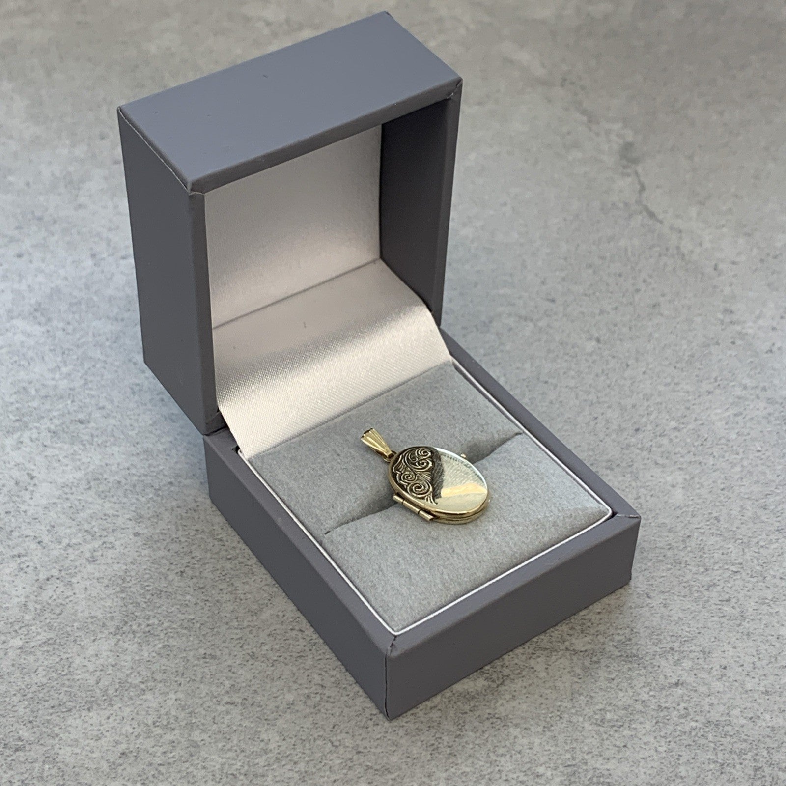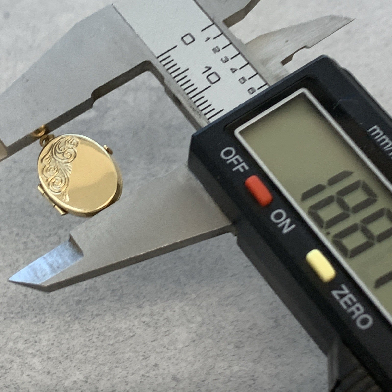 A beautiful petite oval shaped gold locket pendant featuring engraved patterns on both sides.