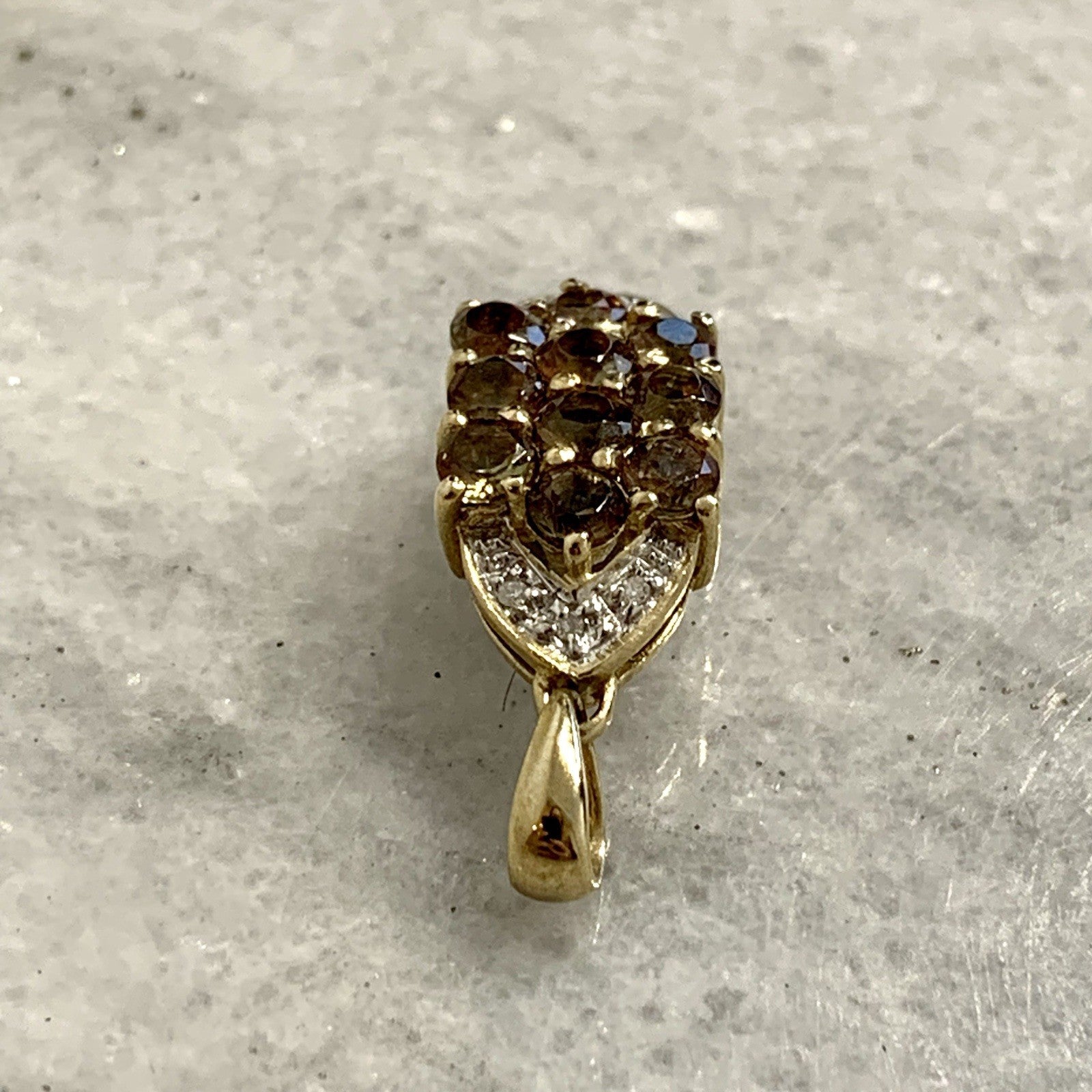 A stunning gold pendant featuring a cluster of round cut andalusite gemstones accented by petite diamonds.