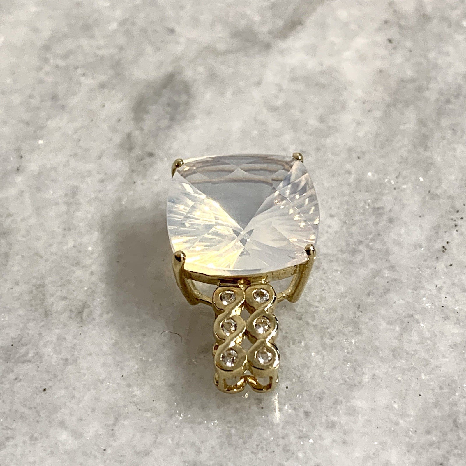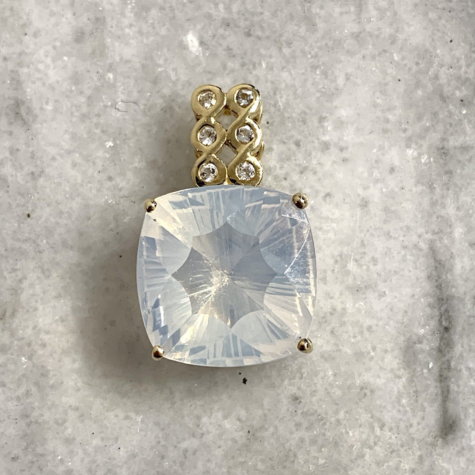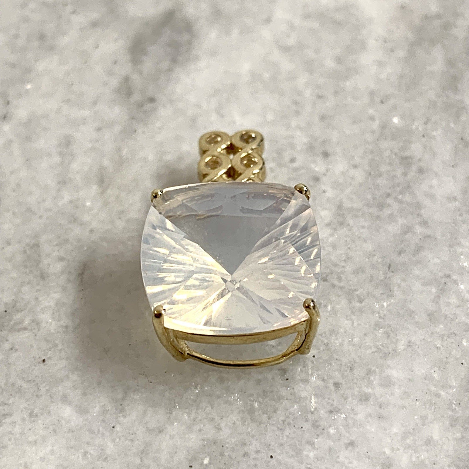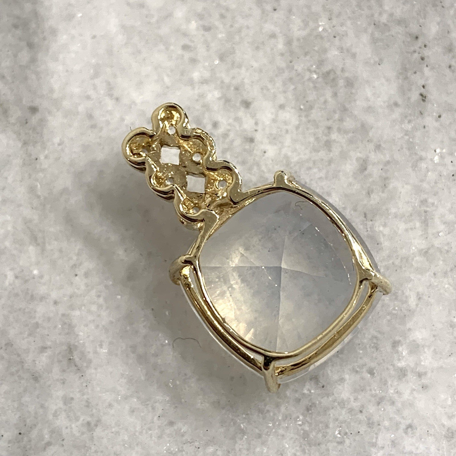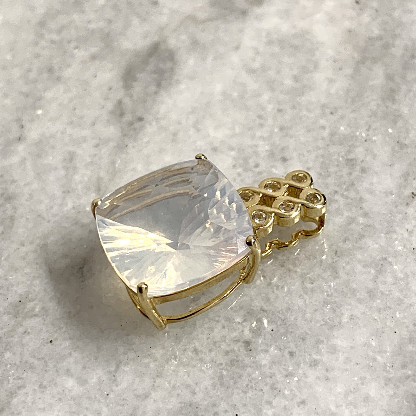 9 ct Gold Pendant Mystic Moon Quartz & White Topaz Cushion Cut Yellow Gold