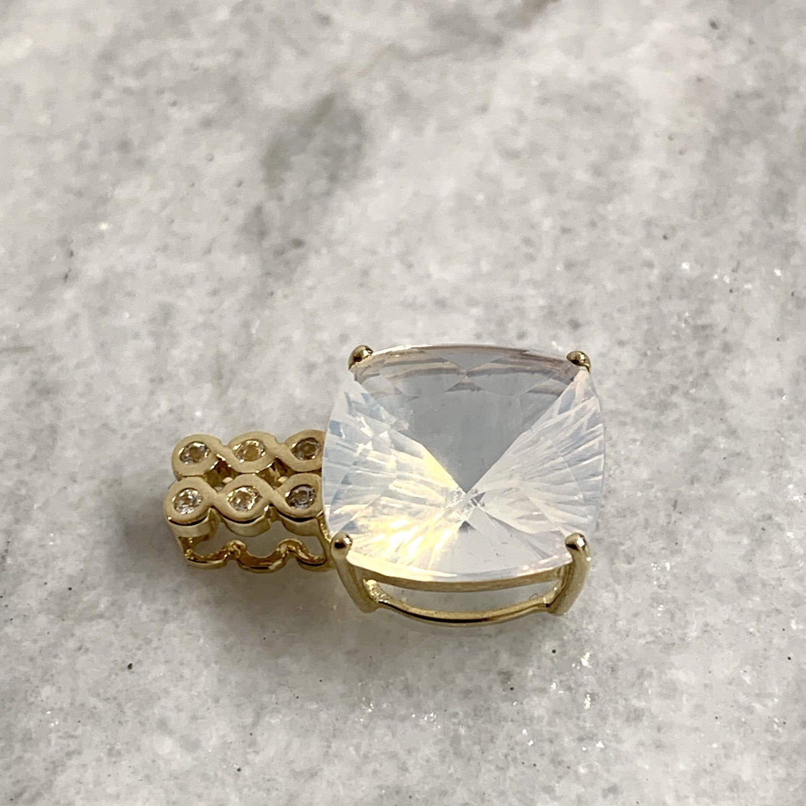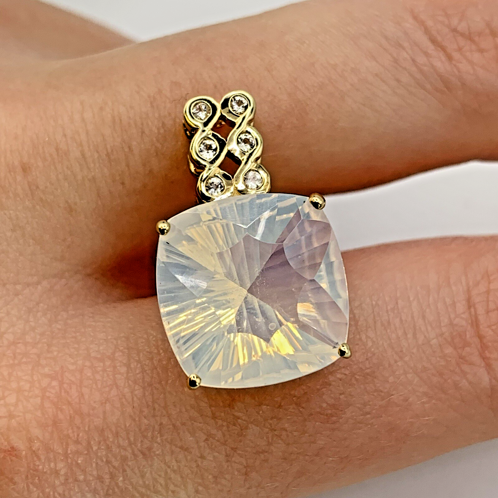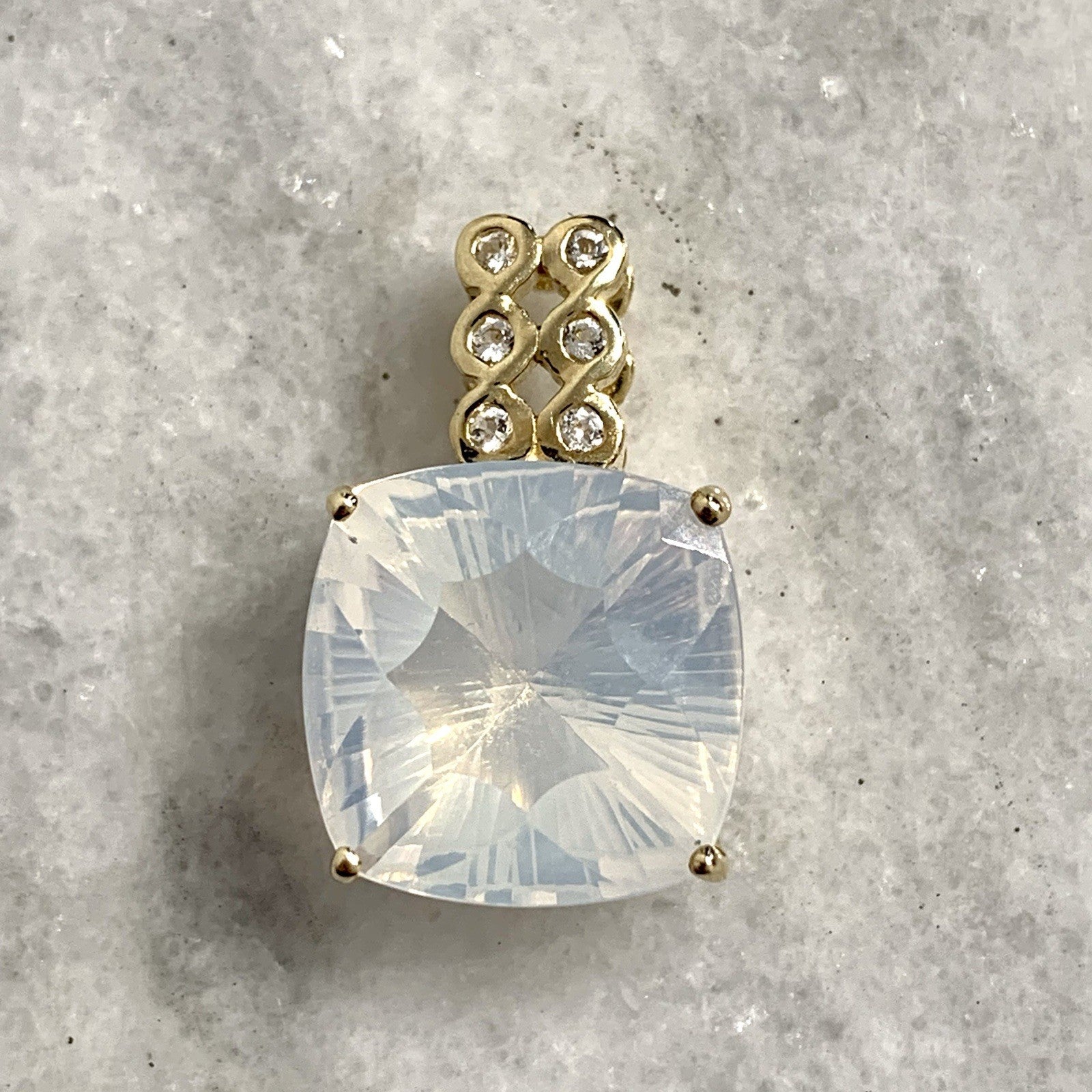 A stunning gold pendant showcasing an ornate cushion cut mystic moon quartz which has a milky colour with flashes, accented by six petite bezel set white topaz gemstones.