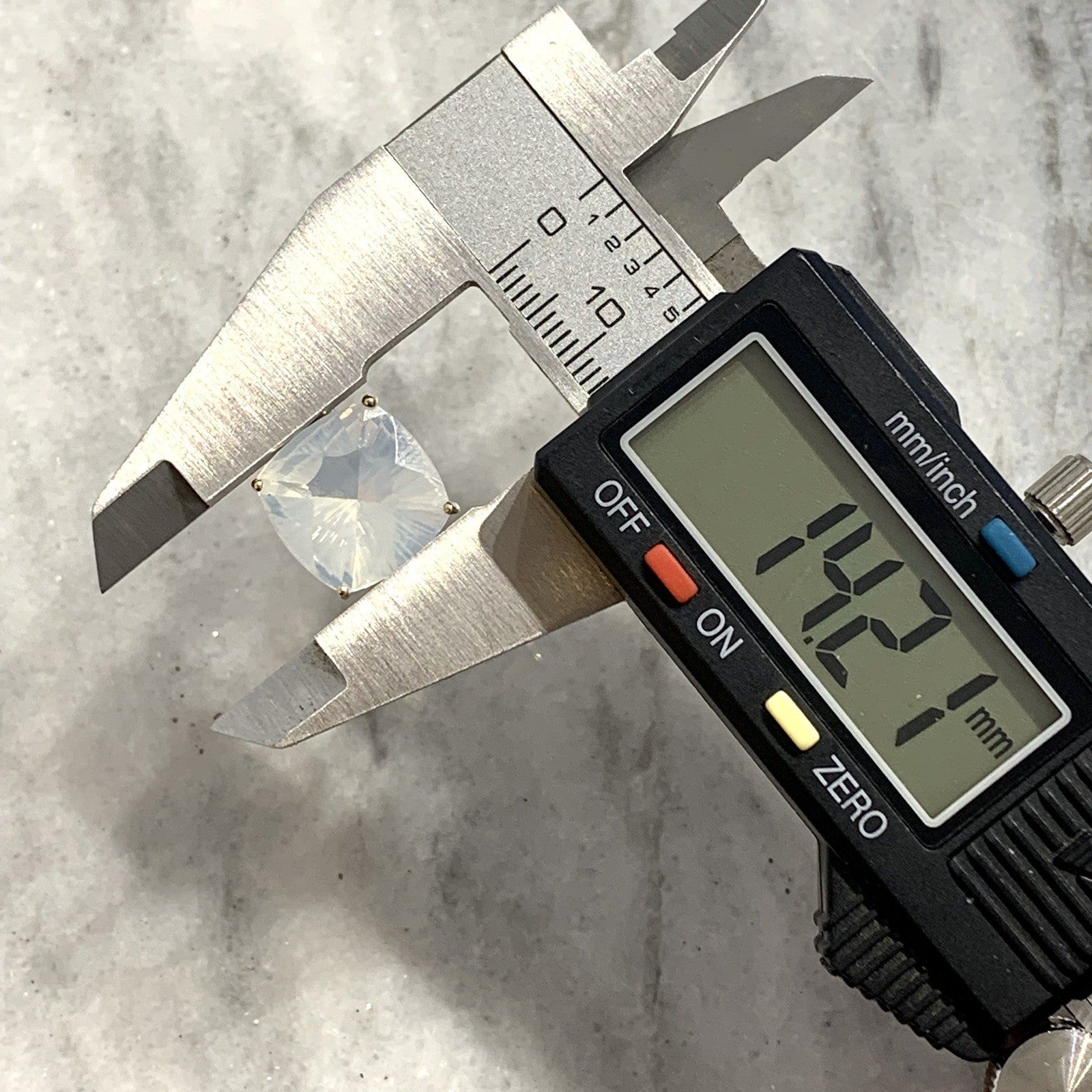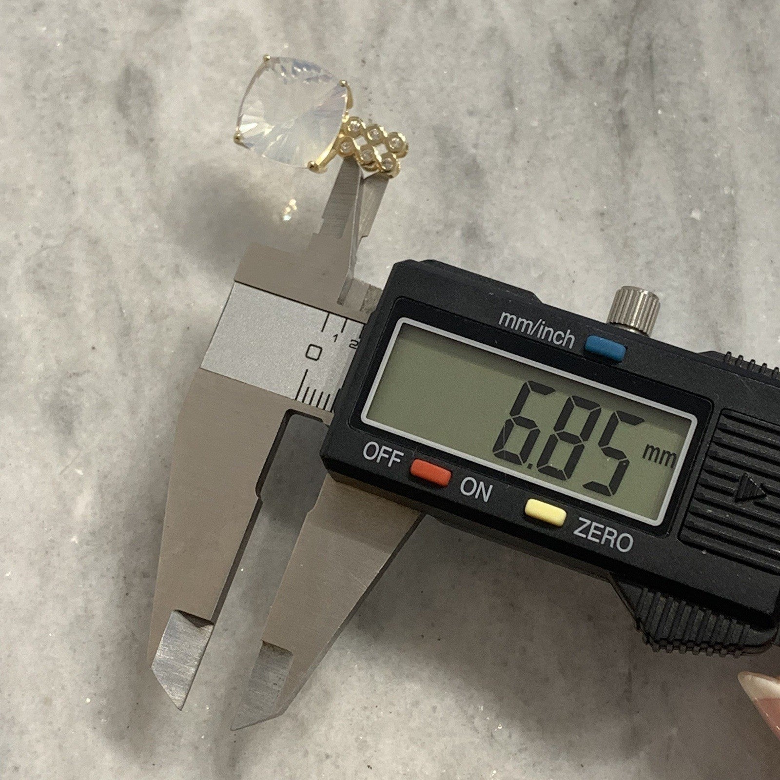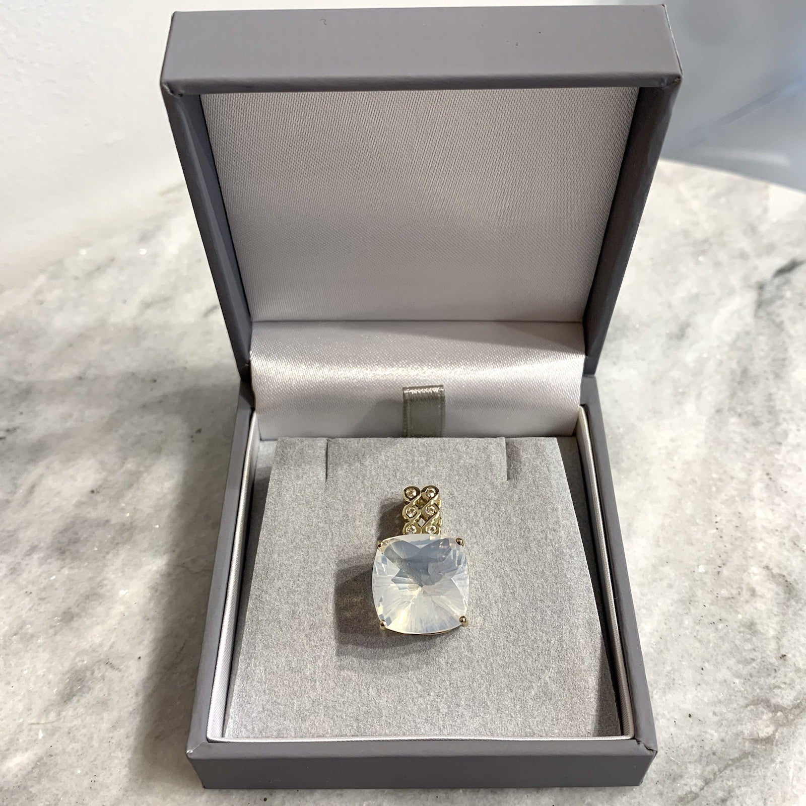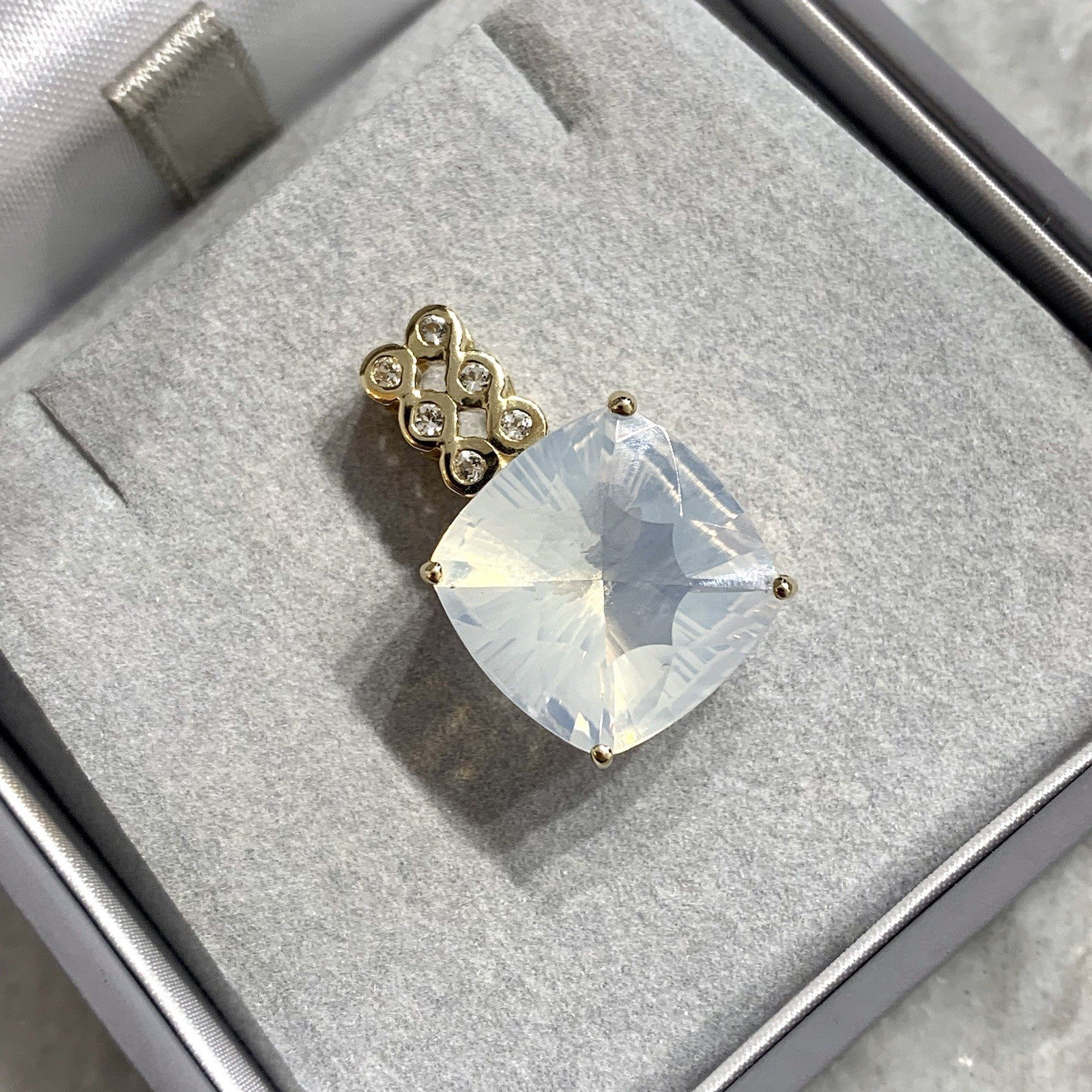 A stunning gold pendant showcasing an ornate cushion cut mystic moon quartz which has a milky colour with flashes, accented by six petite bezel set white topaz gemstones.
