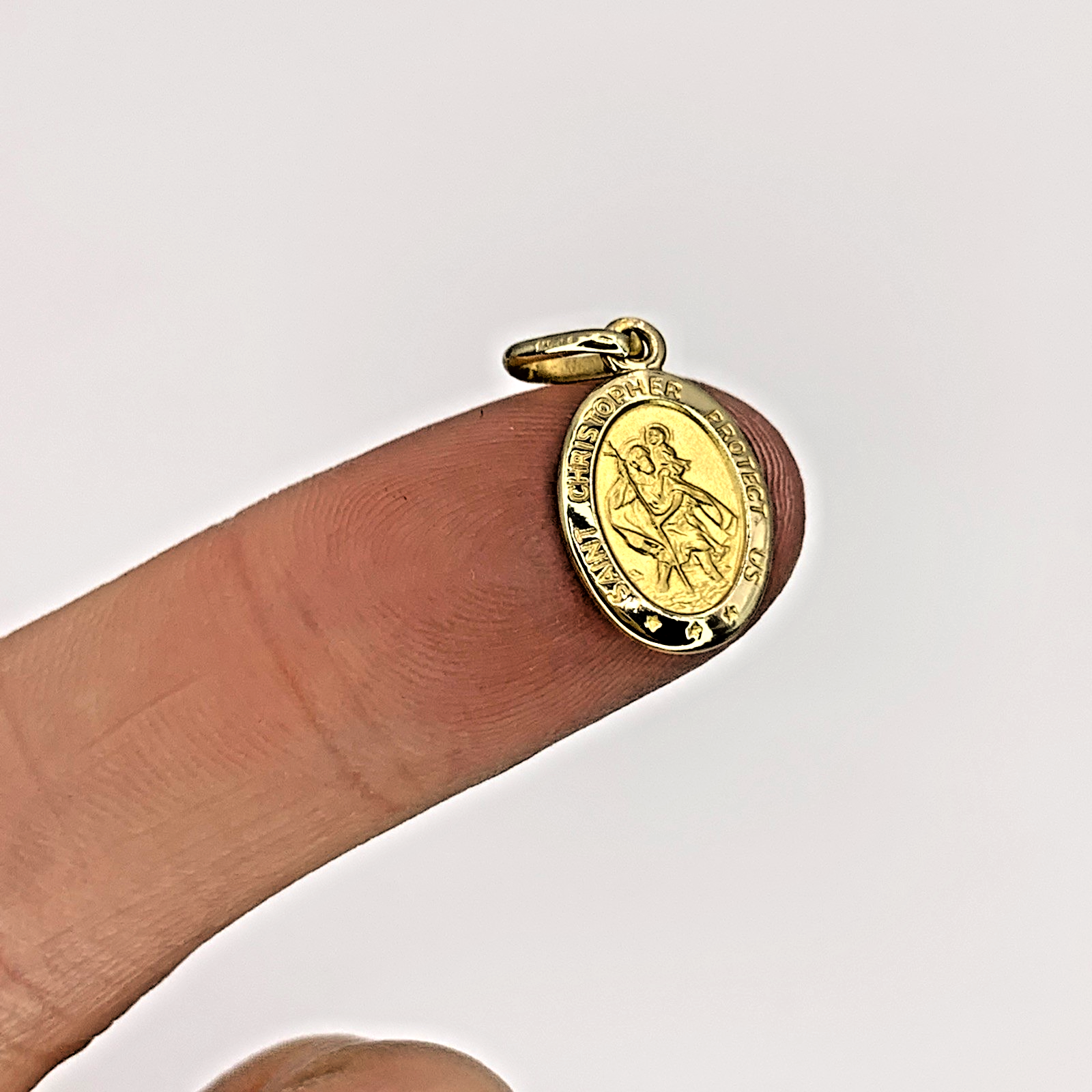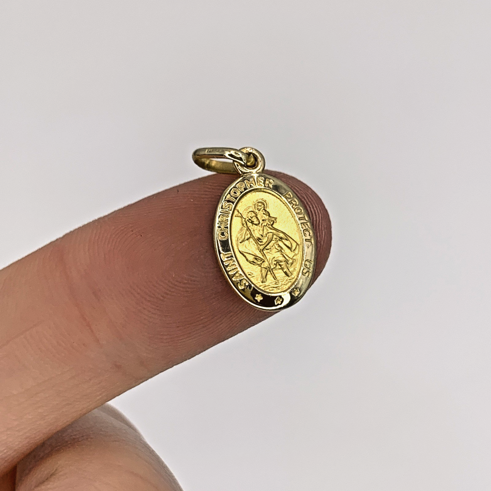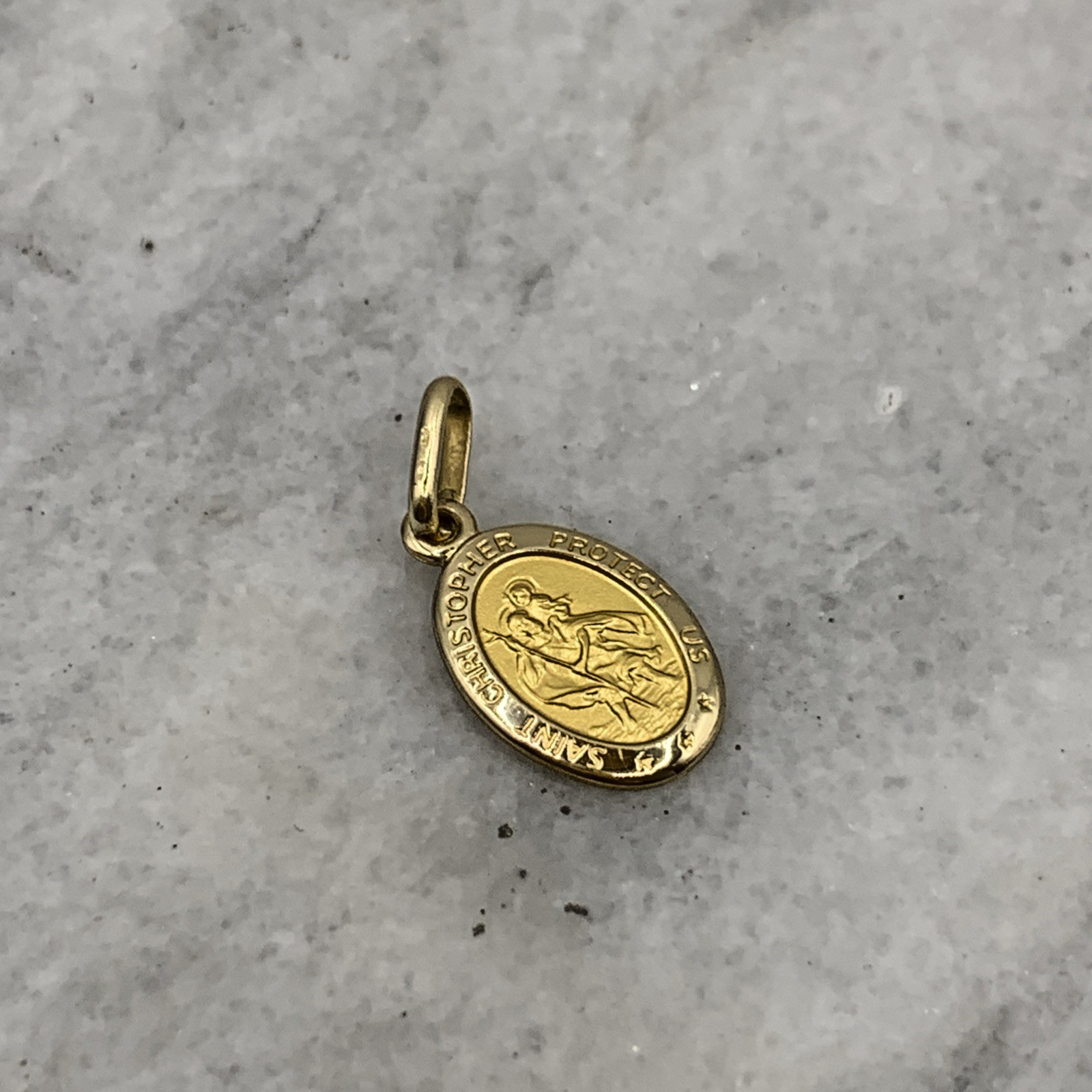 A timeless petite St Christopher oval shaped coin pendant. Perfect for charm bracelets or a dainty chain necklace.