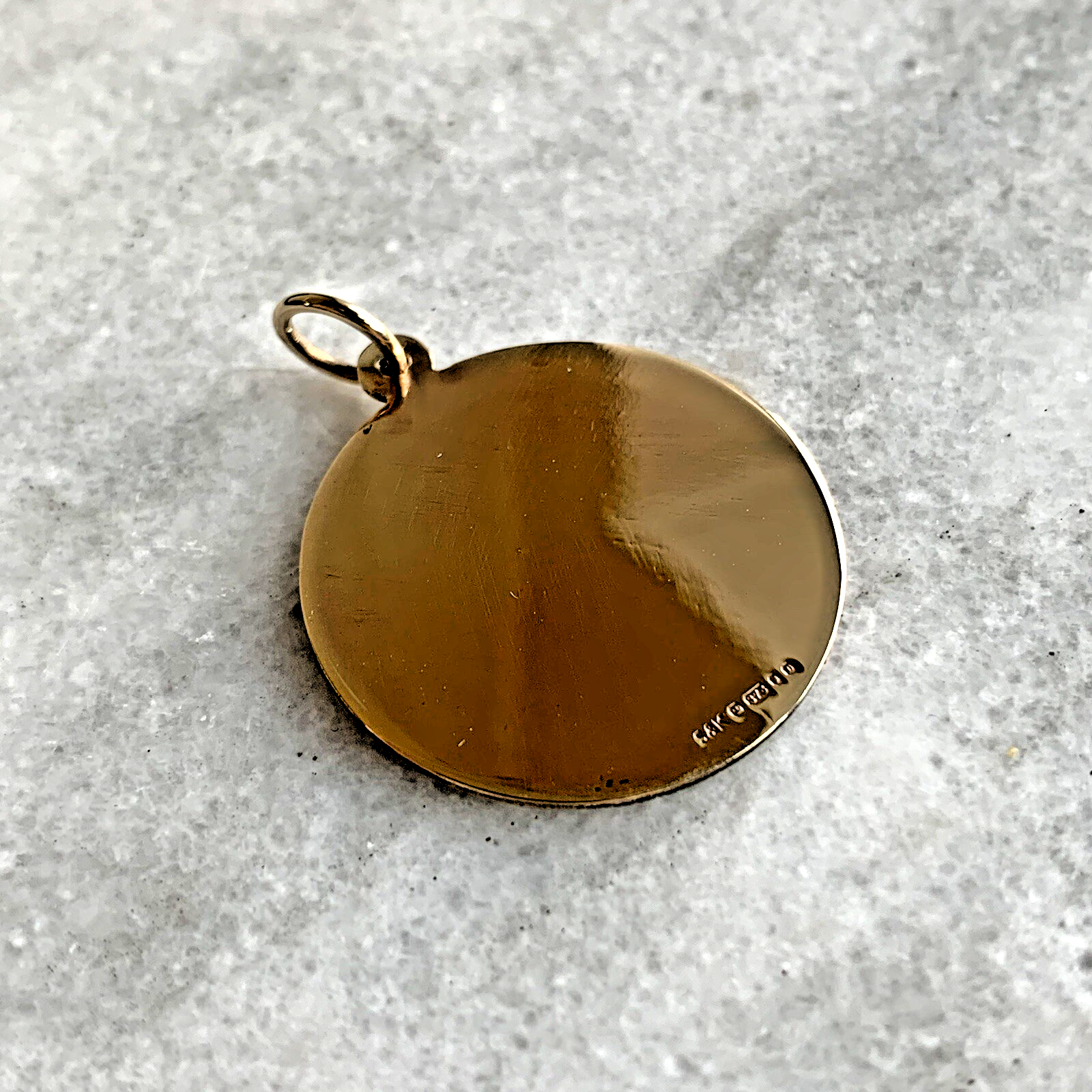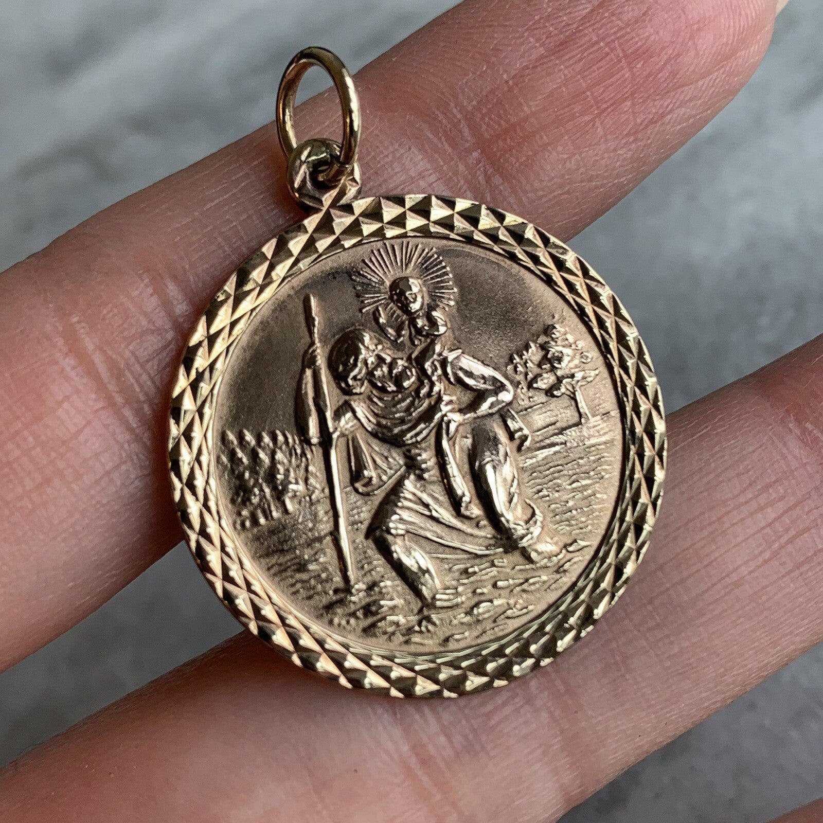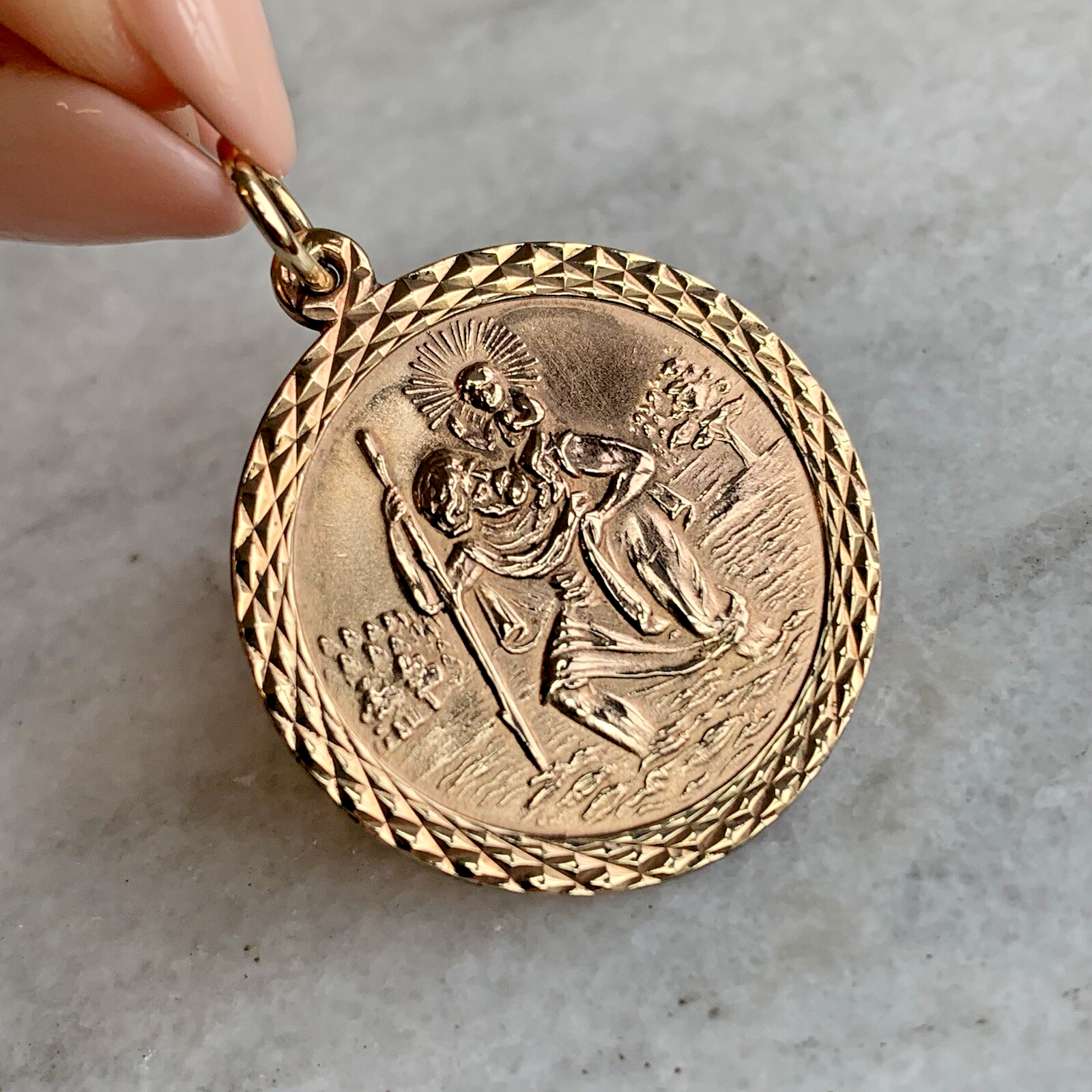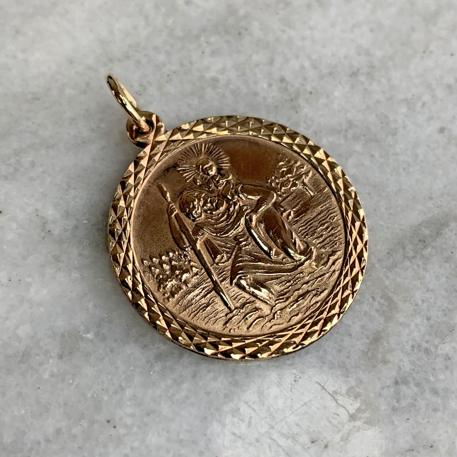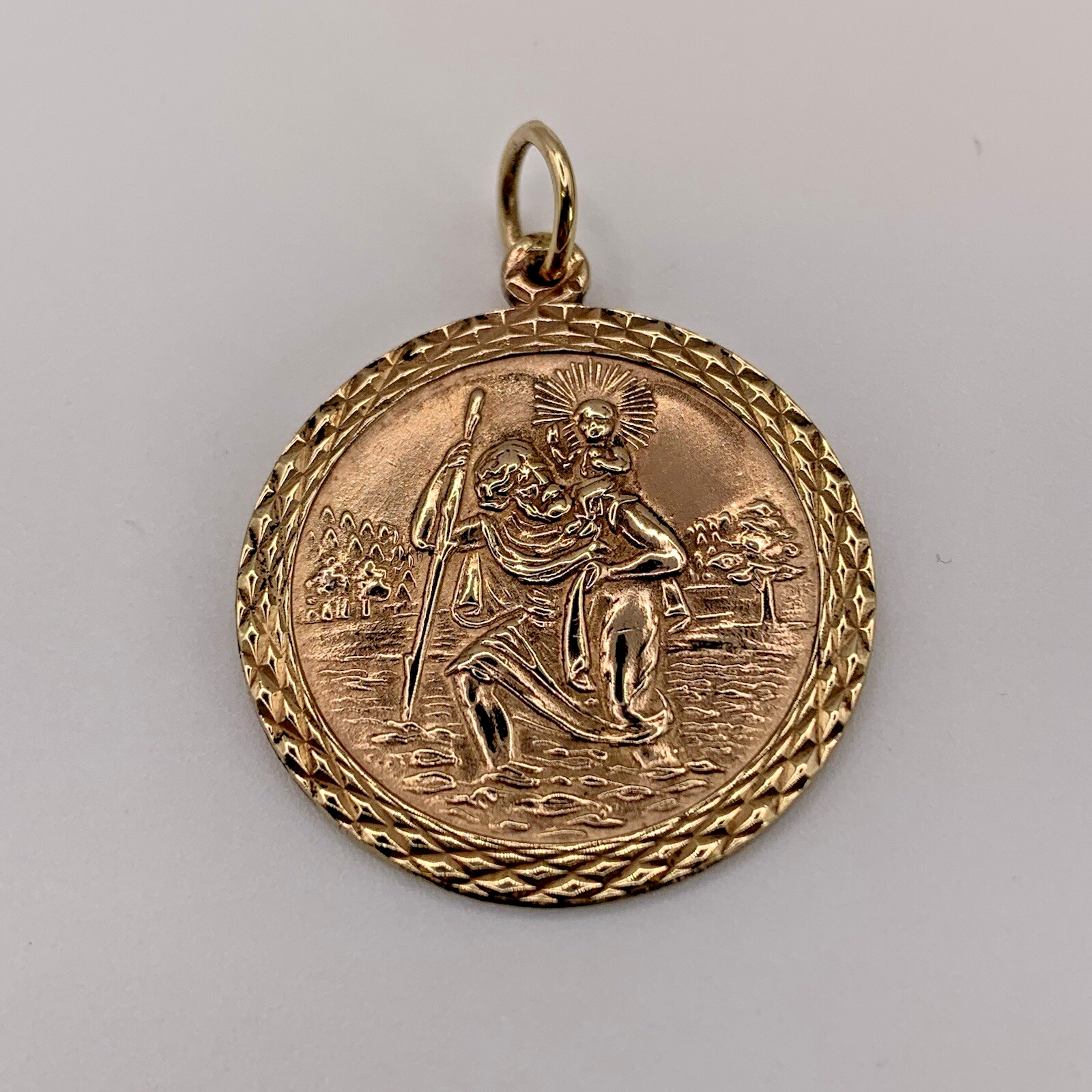 A timeless gold St Christopher medal pendant, with textured embossed edge to accent.