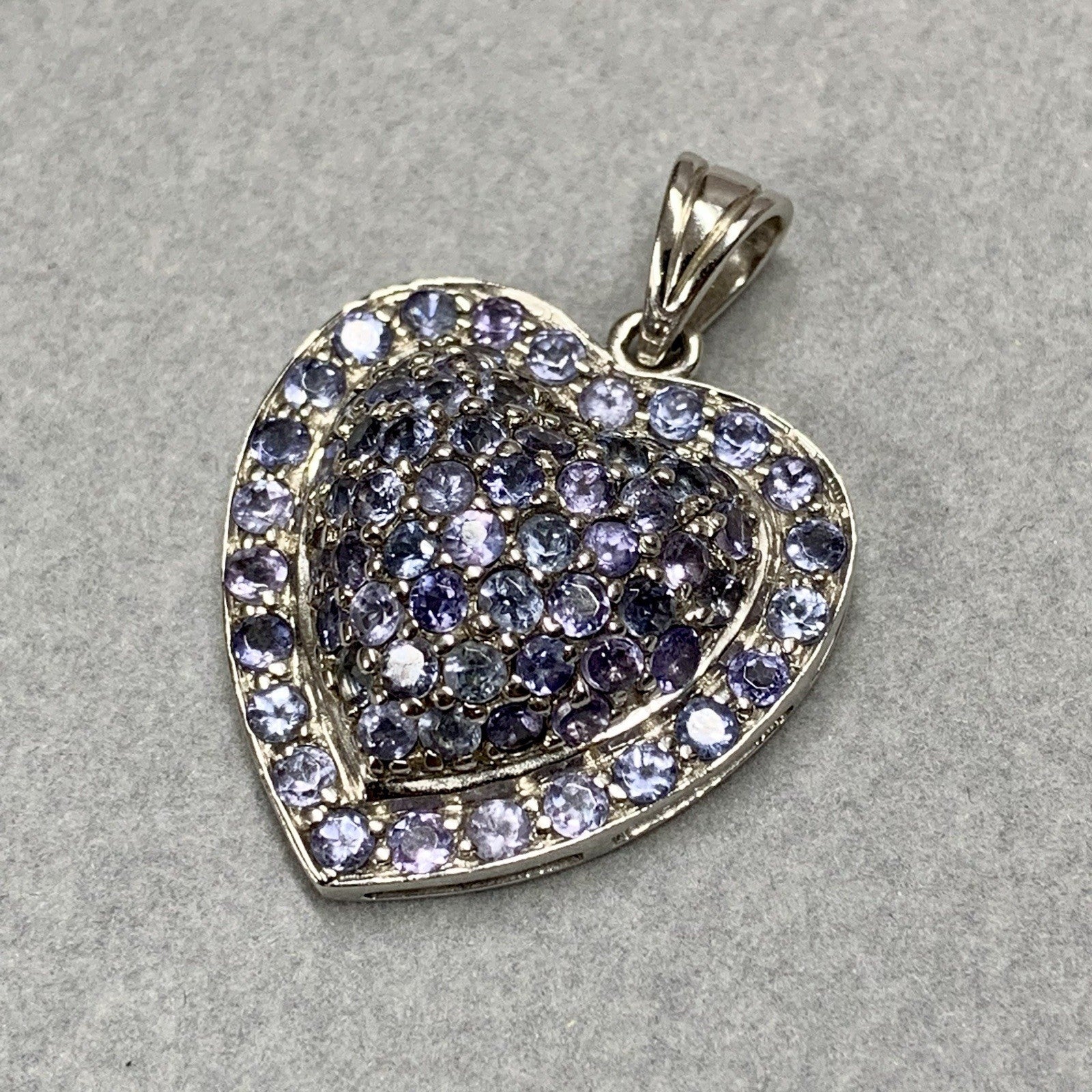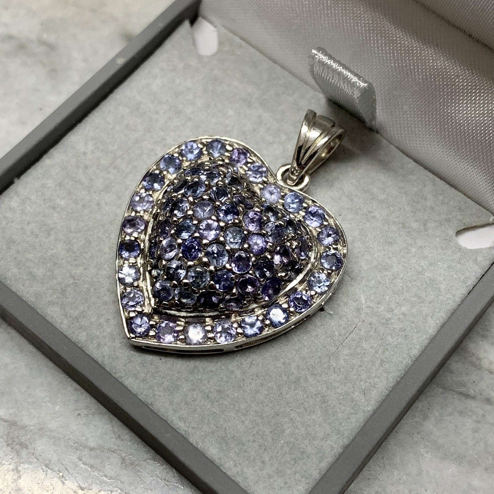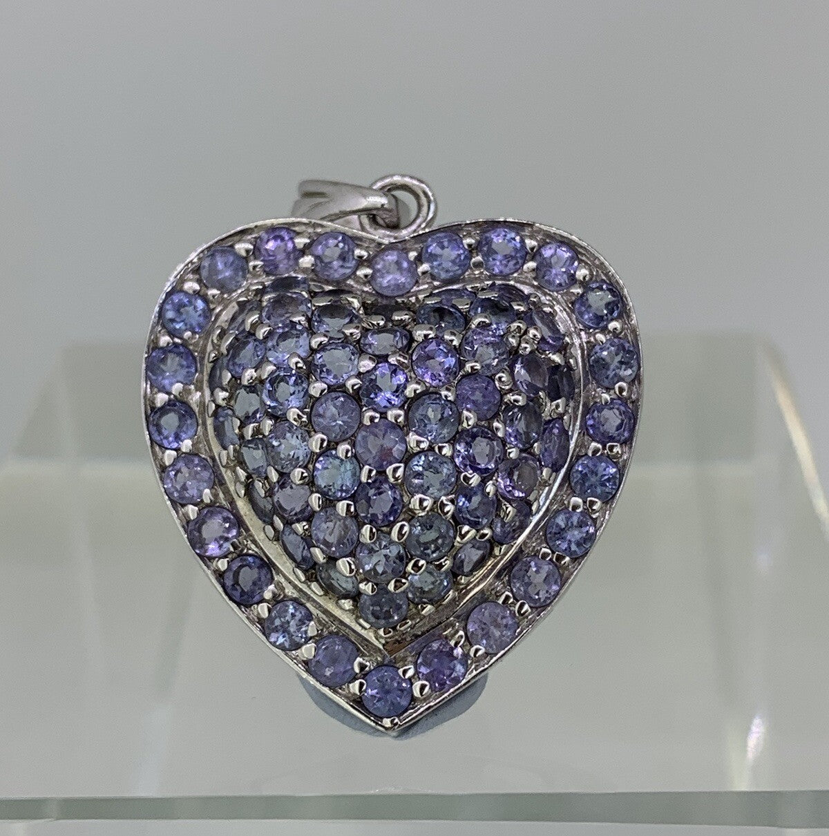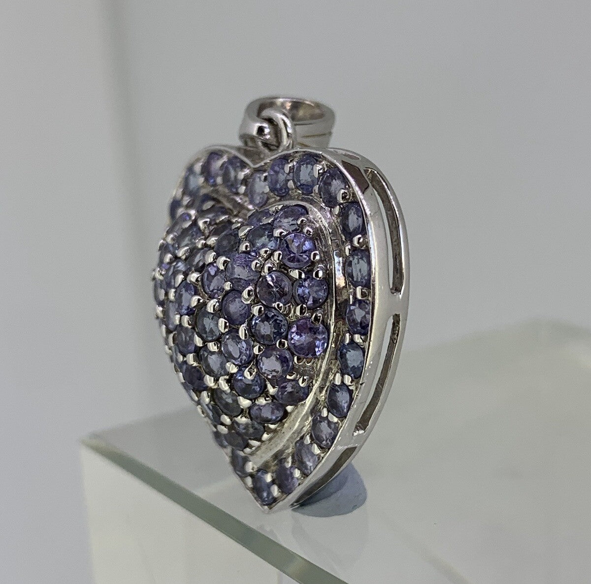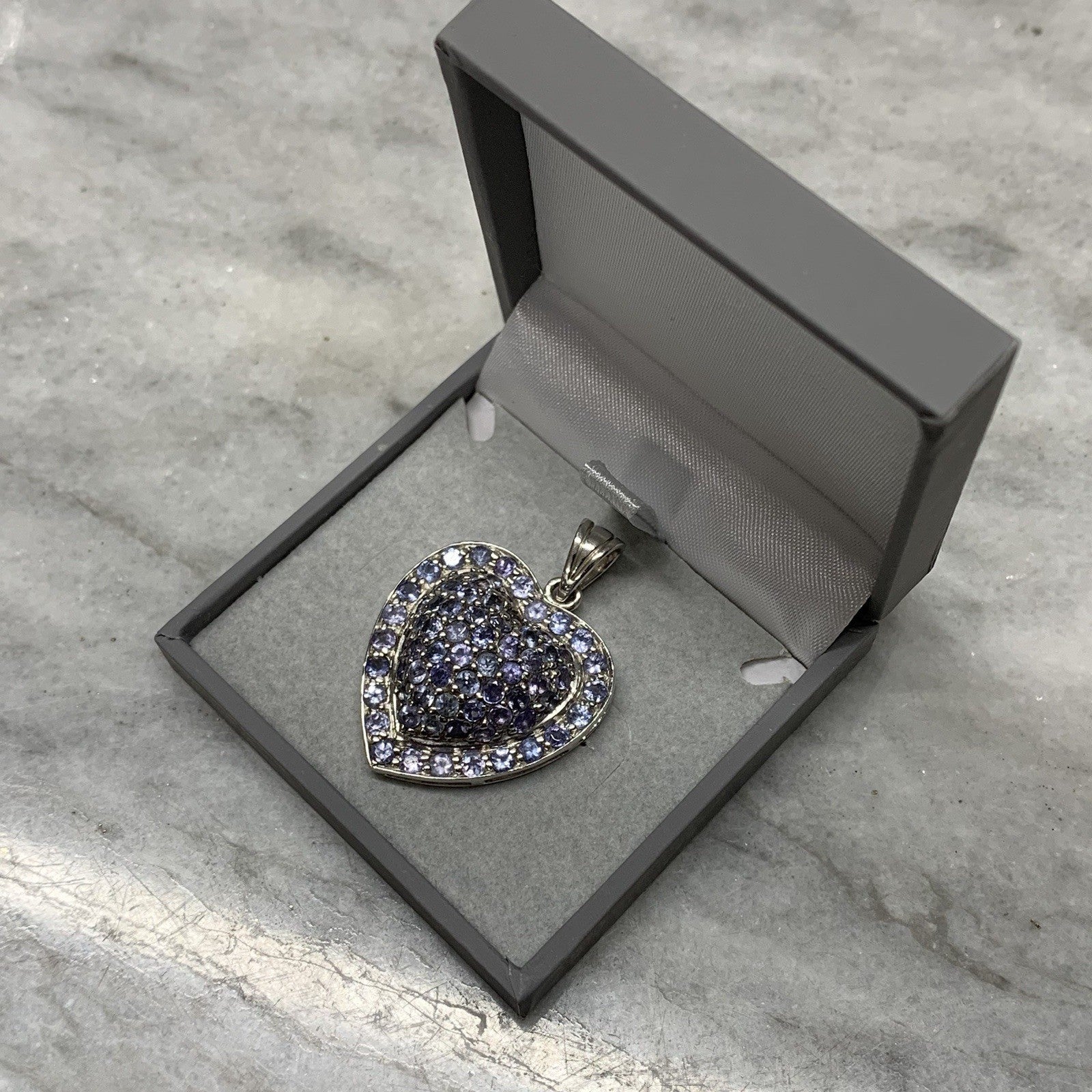 A stunning white gold pendant crafted in the shape of a heart, encrusted with pave set tanzanite stones in its entirety.