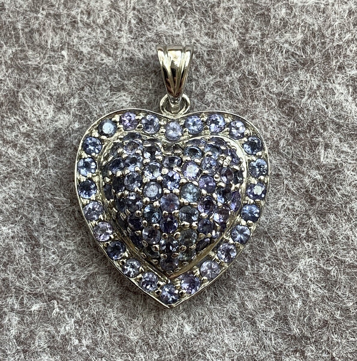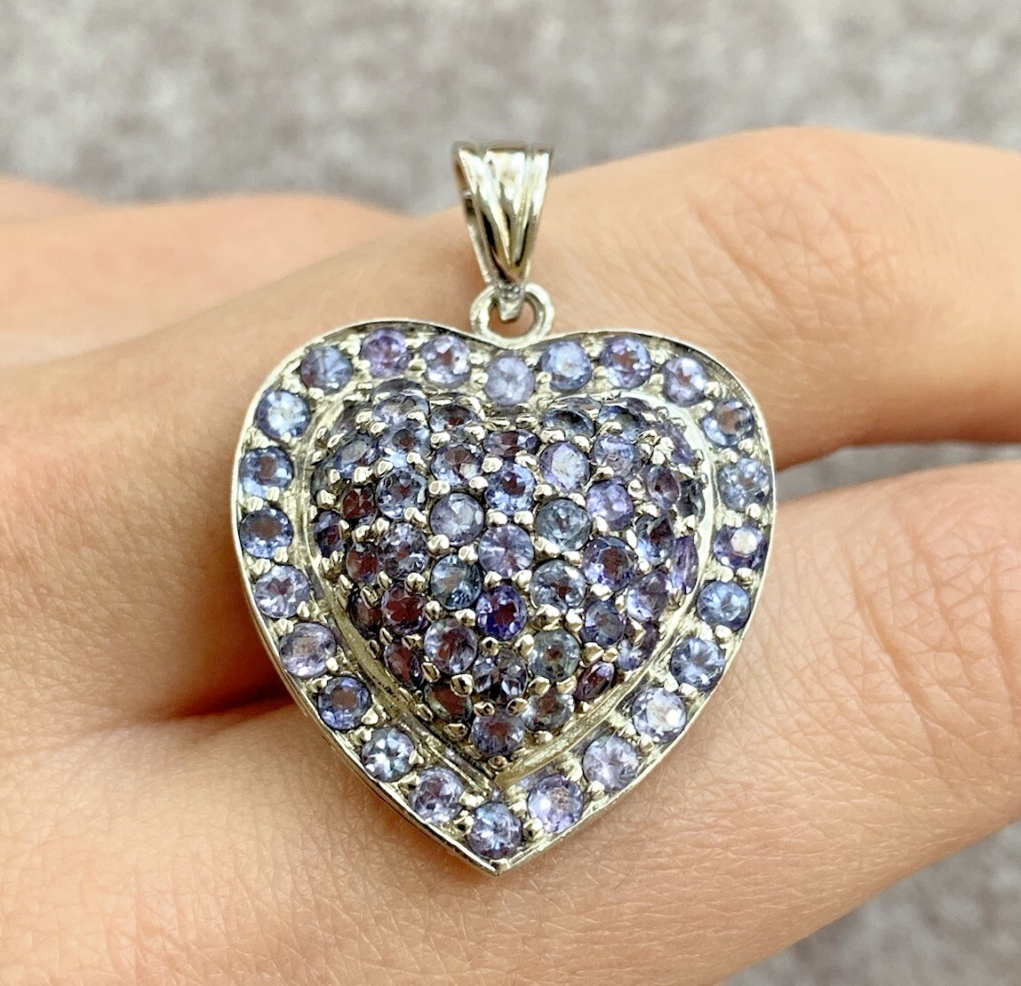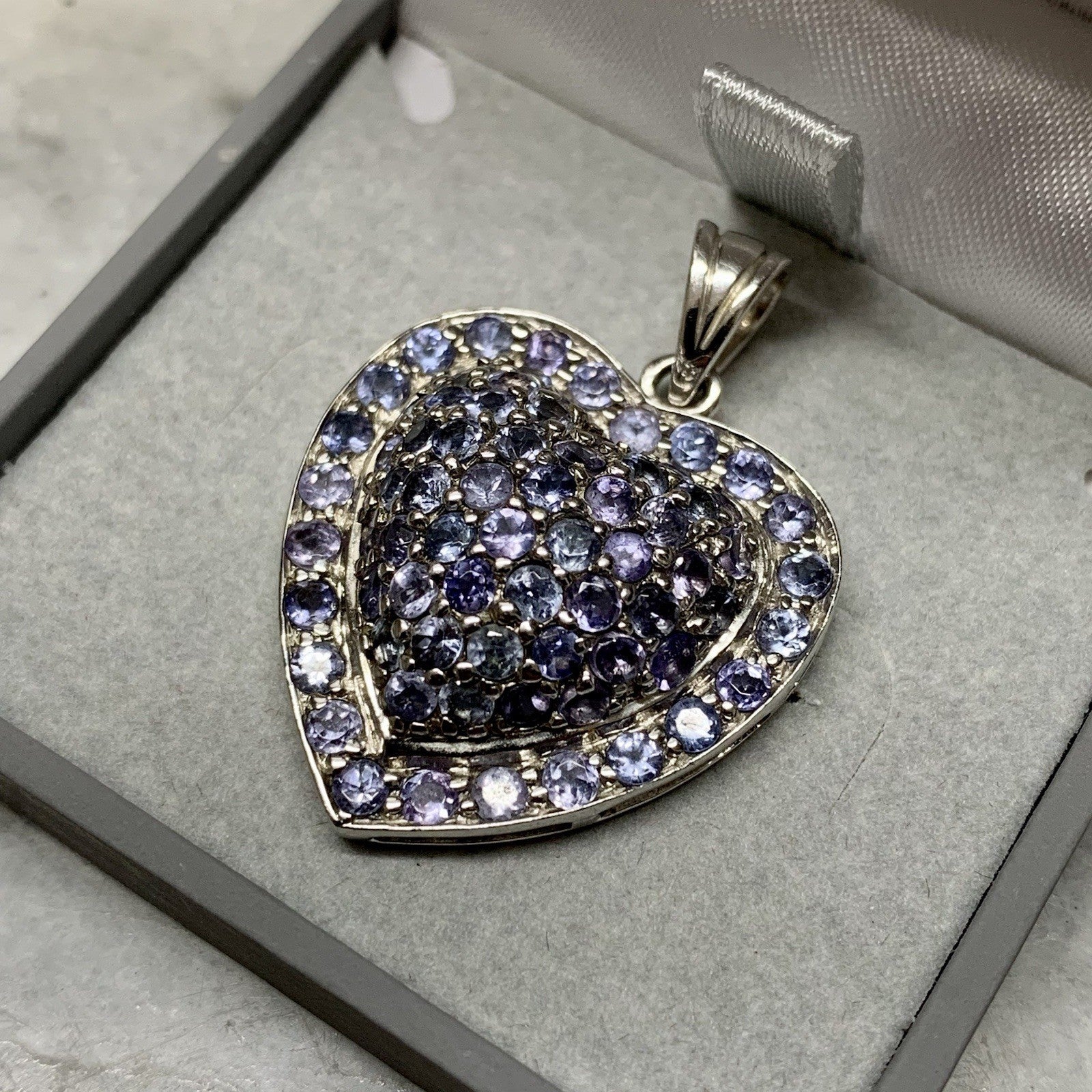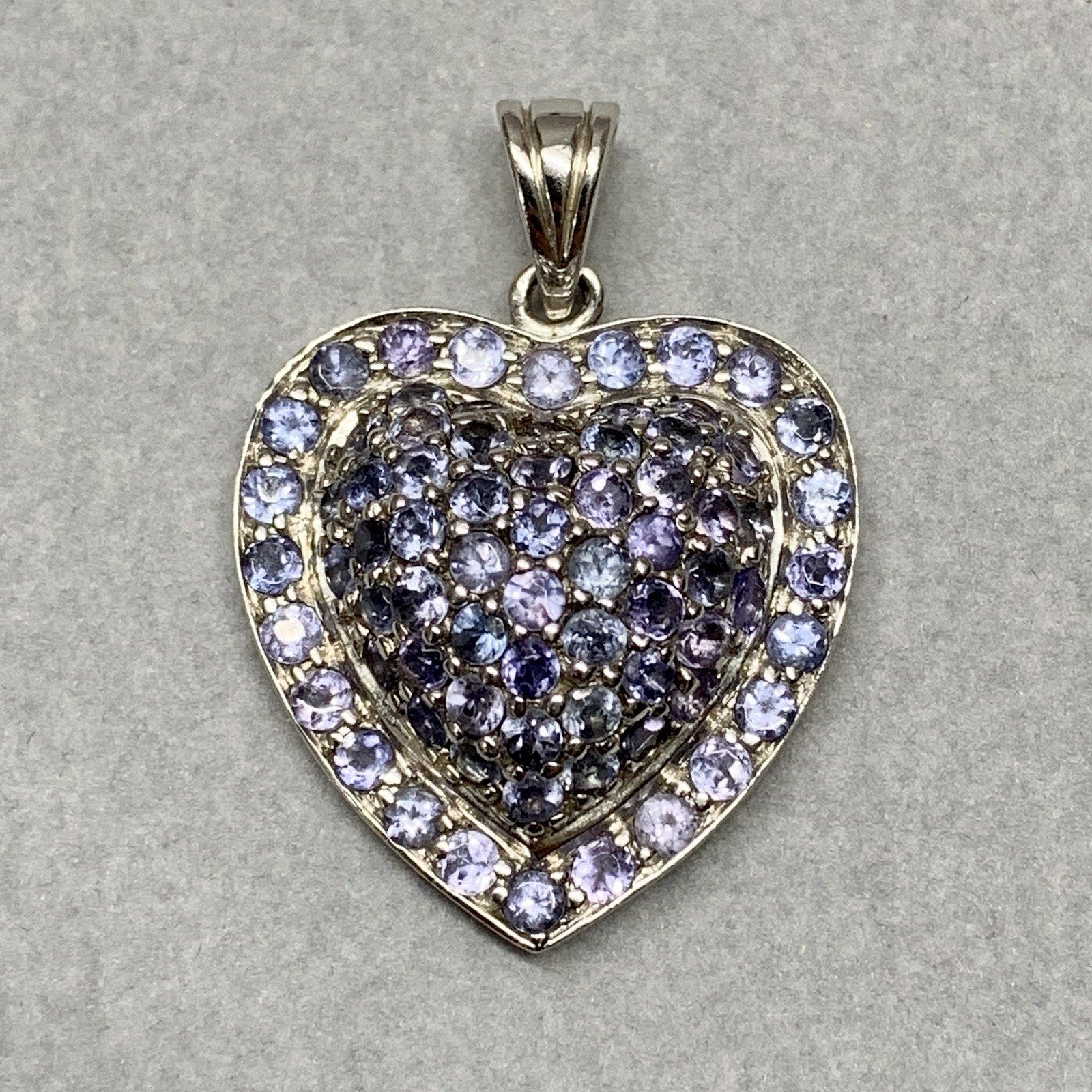 A stunning white gold pendant crafted in the shape of a heart, encrusted with pave set tanzanite stones in its entirety.