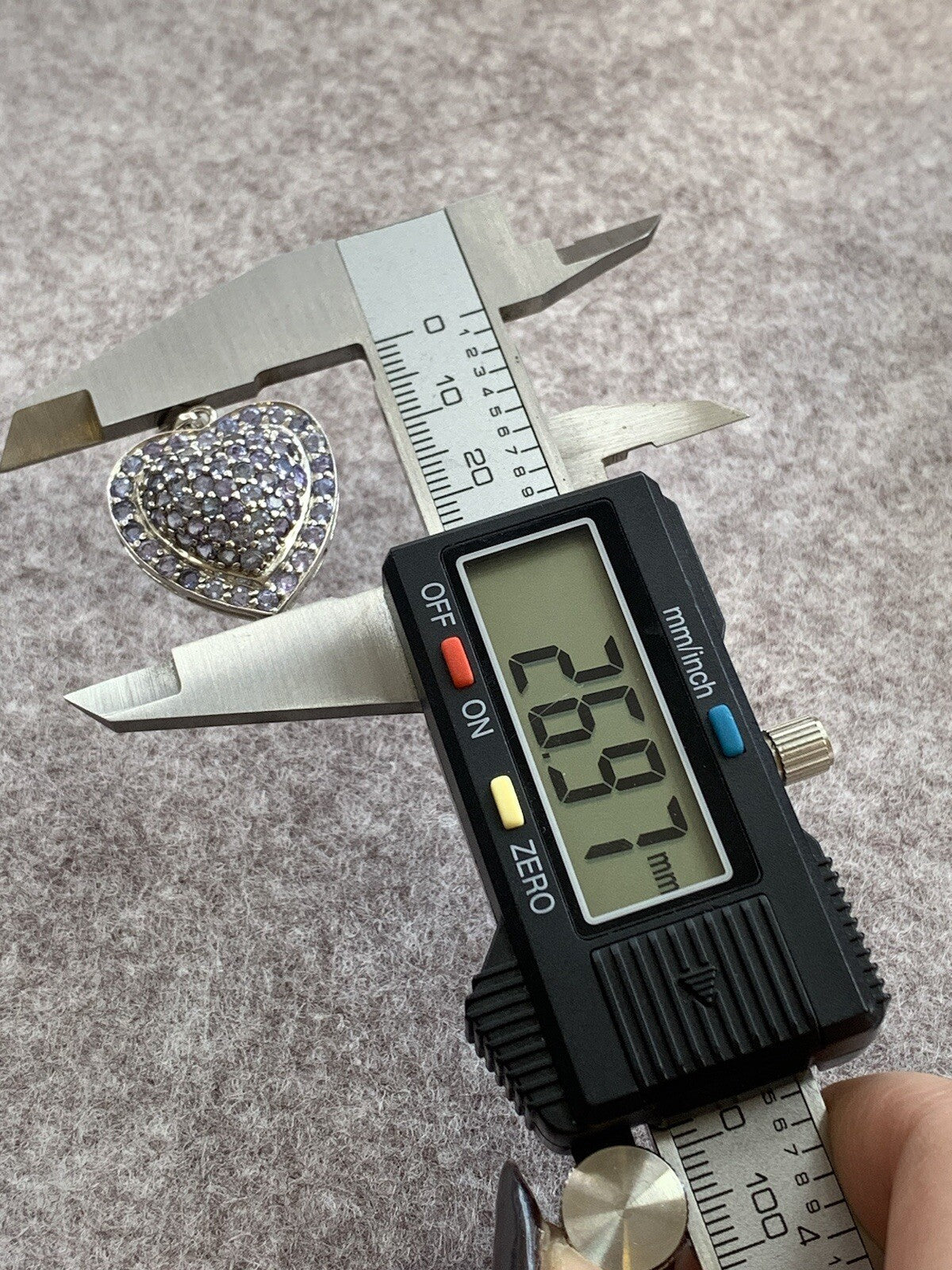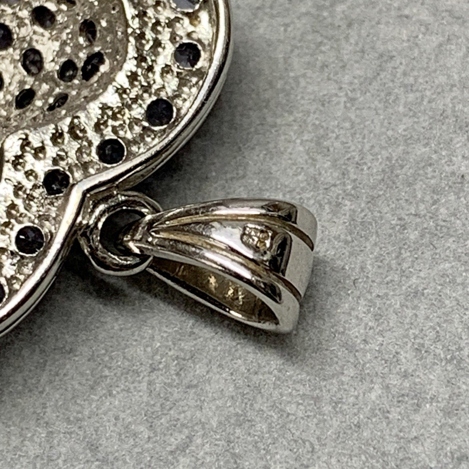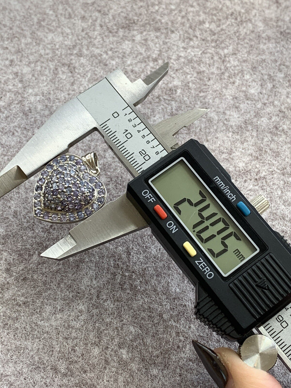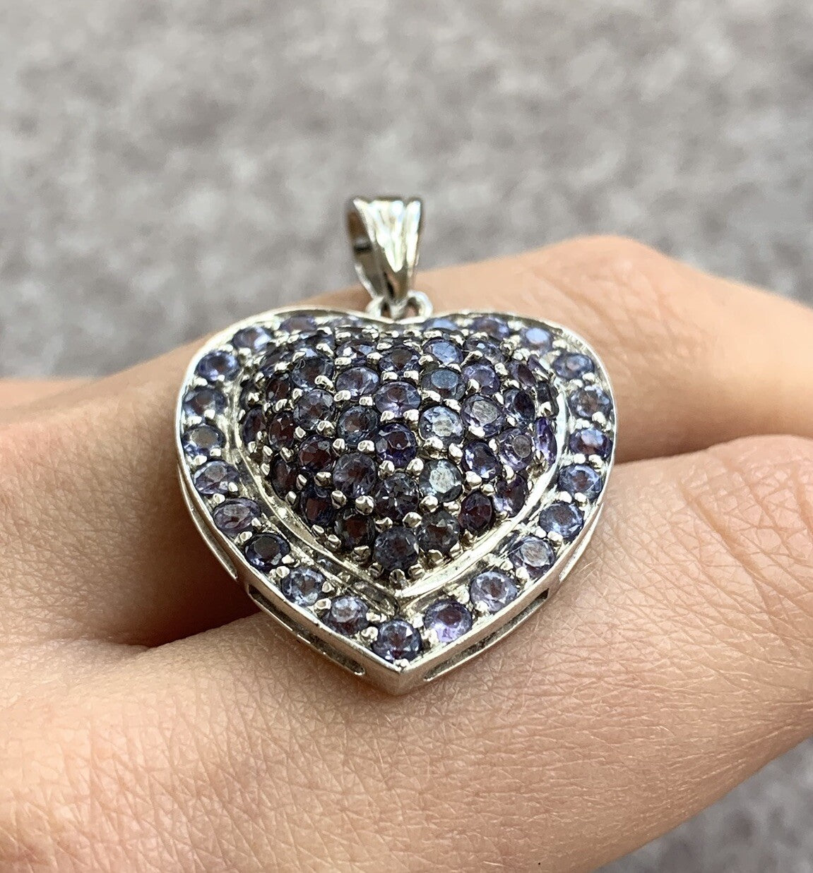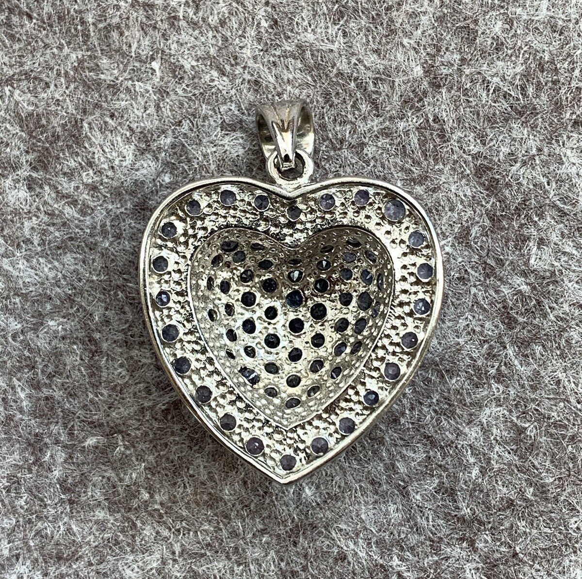 A stunning white gold pendant crafted in the shape of a heart, encrusted with pave set tanzanite stones in its entirety.