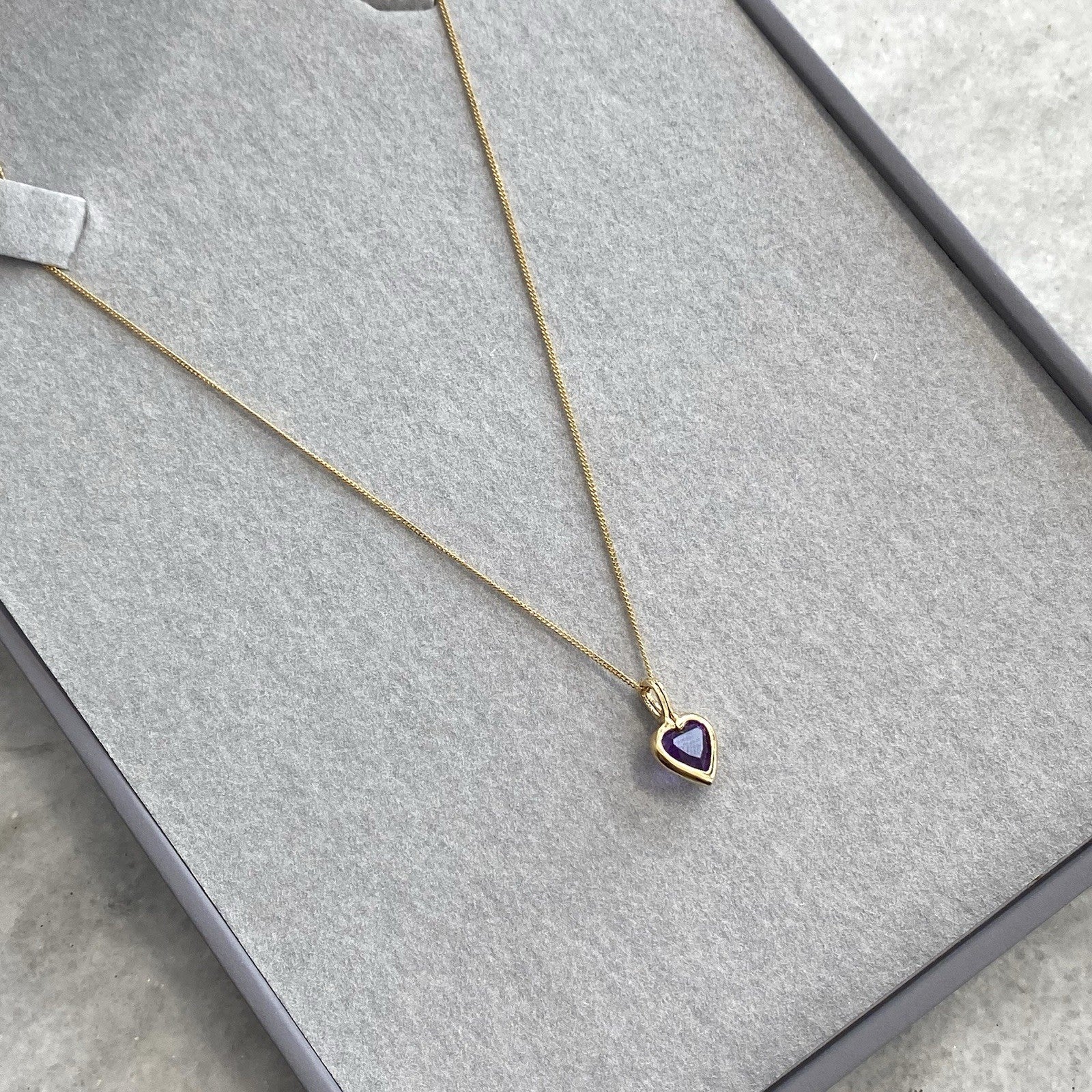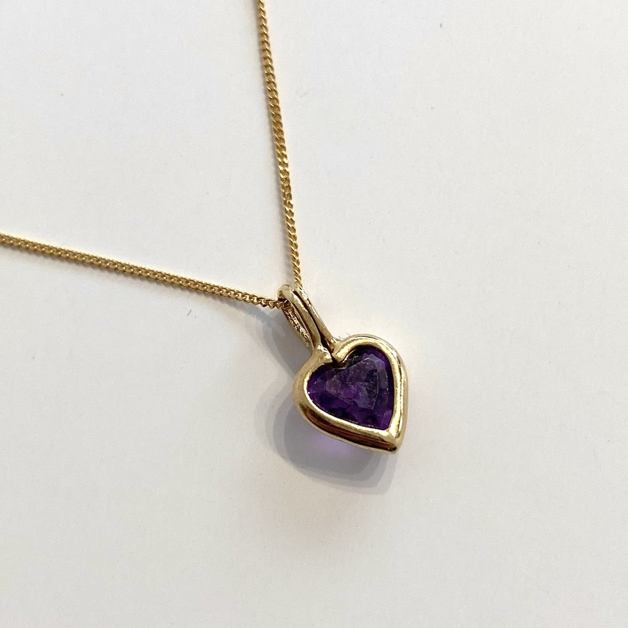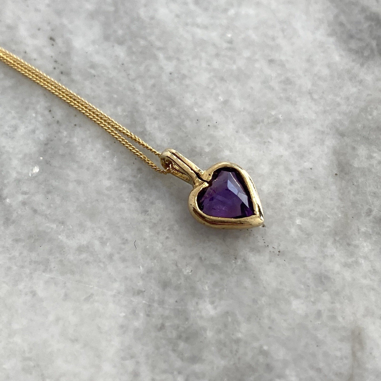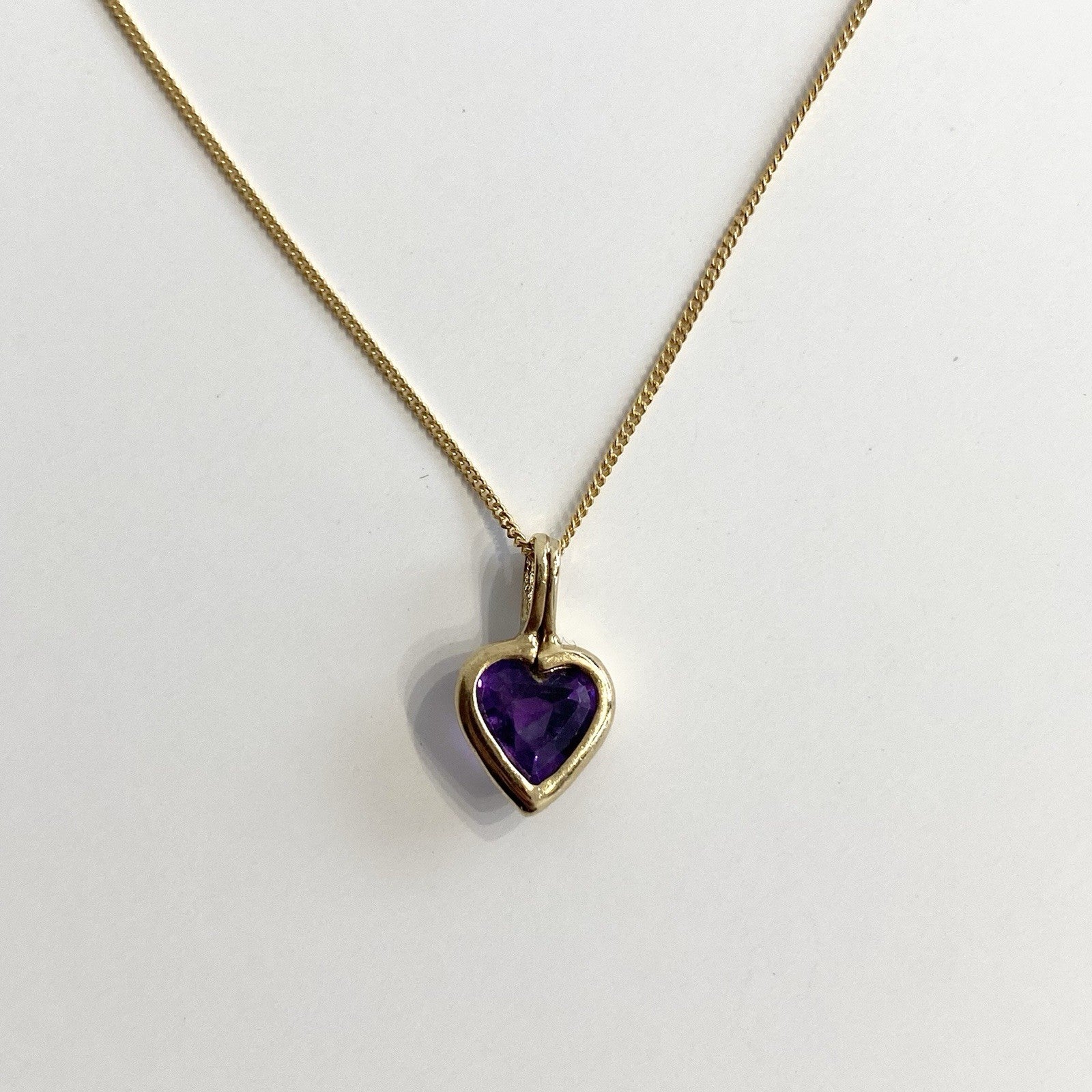 A gold Amethyst heart pendant, held on a dainty curb link chain.