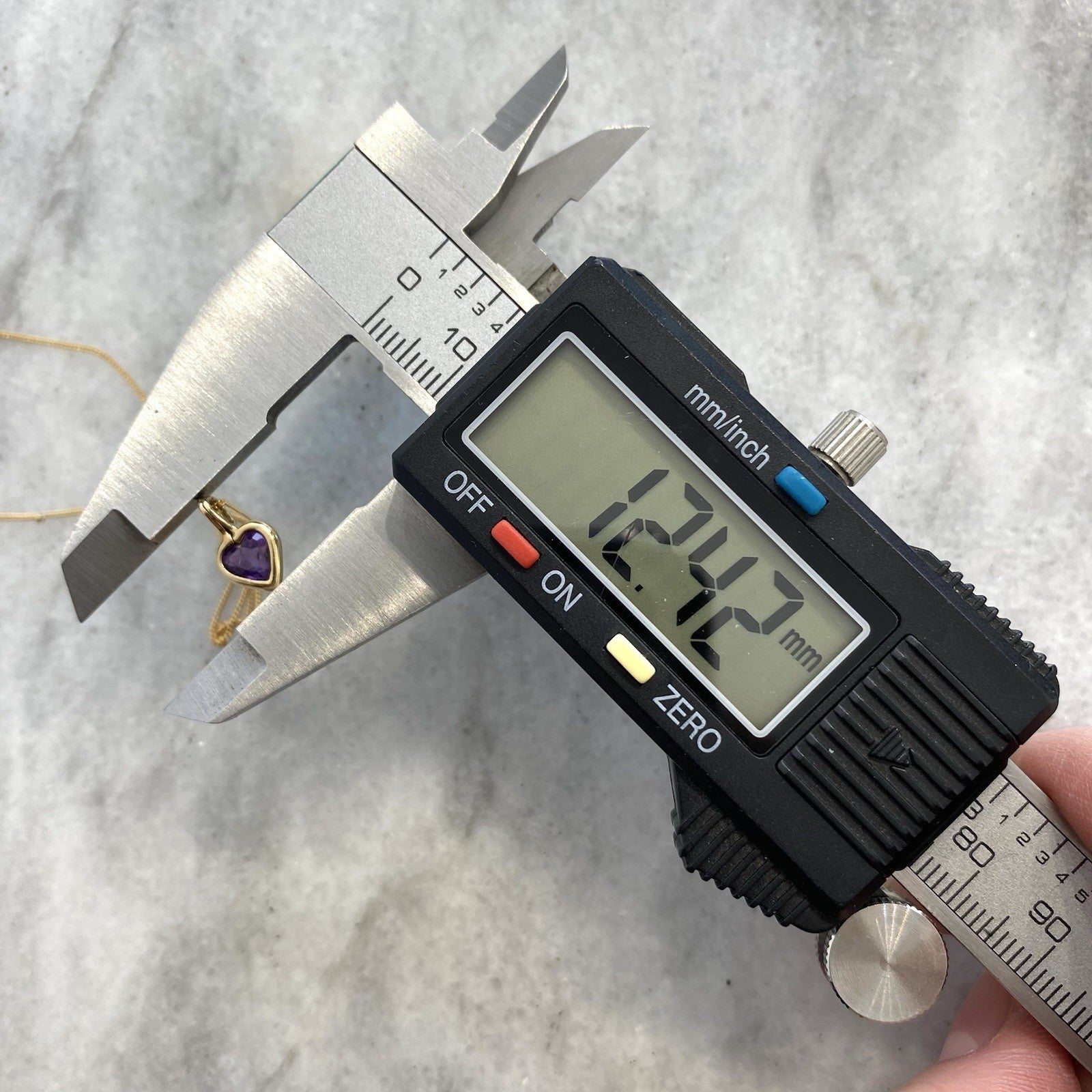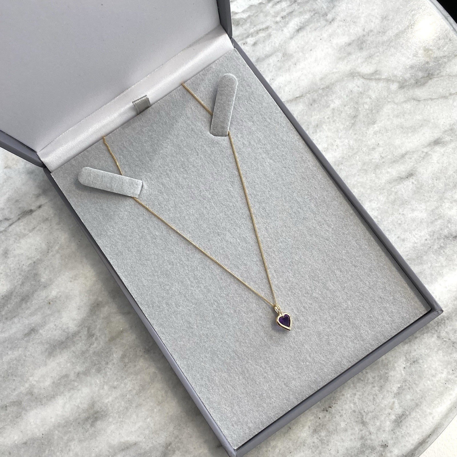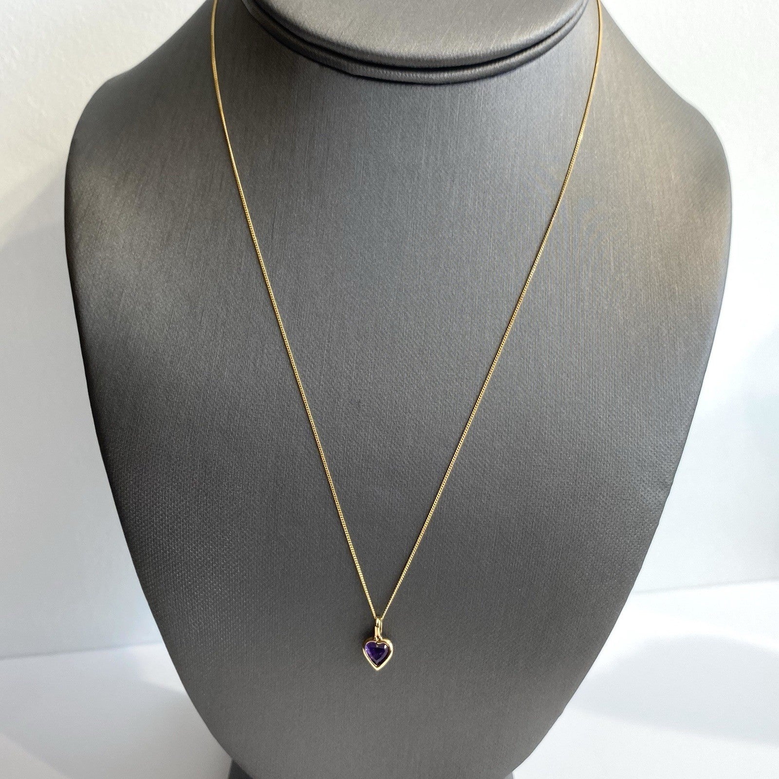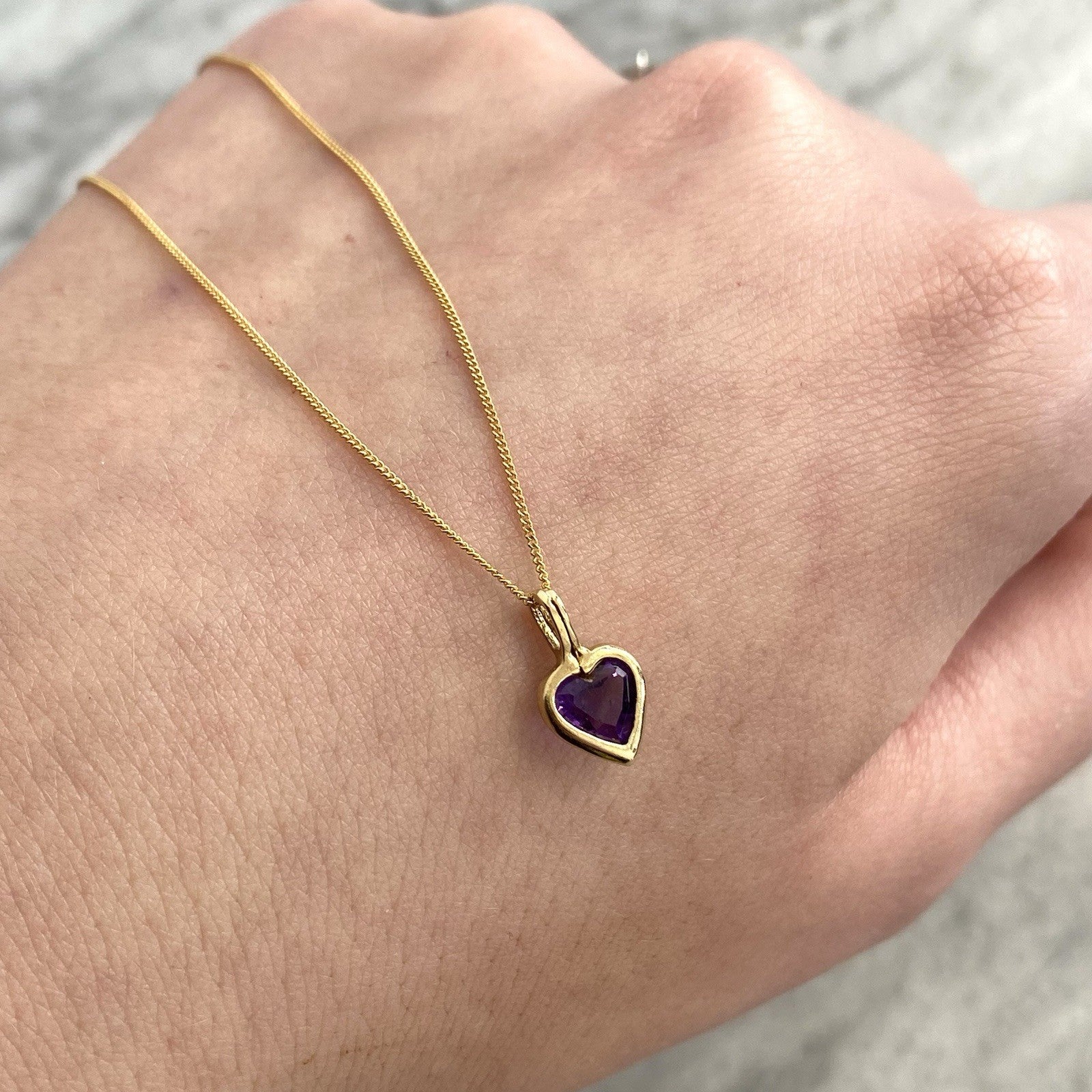 A gold Amethyst heart pendant, held on a dainty curb link chain.