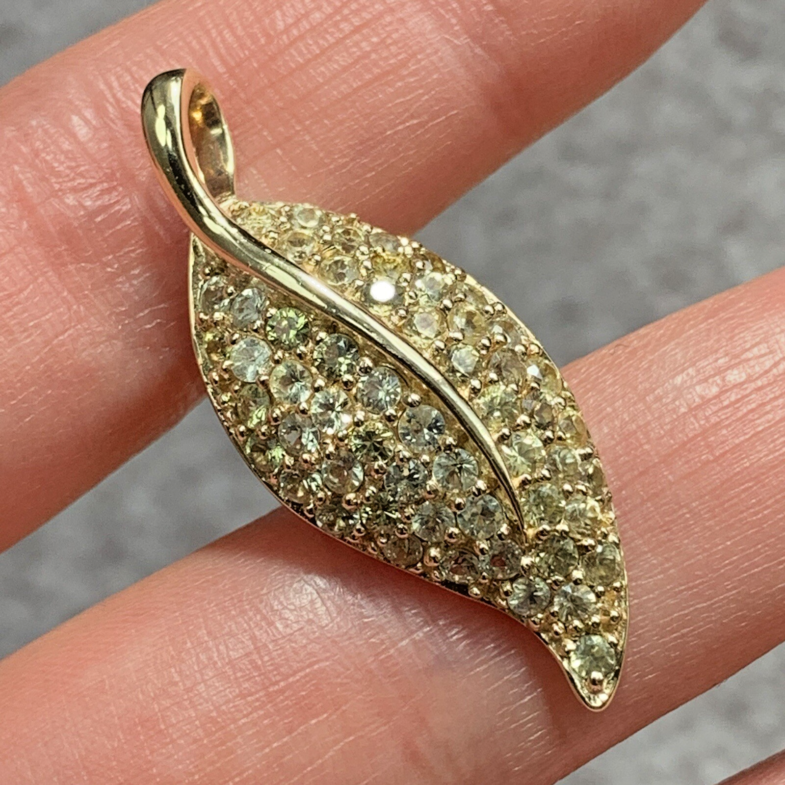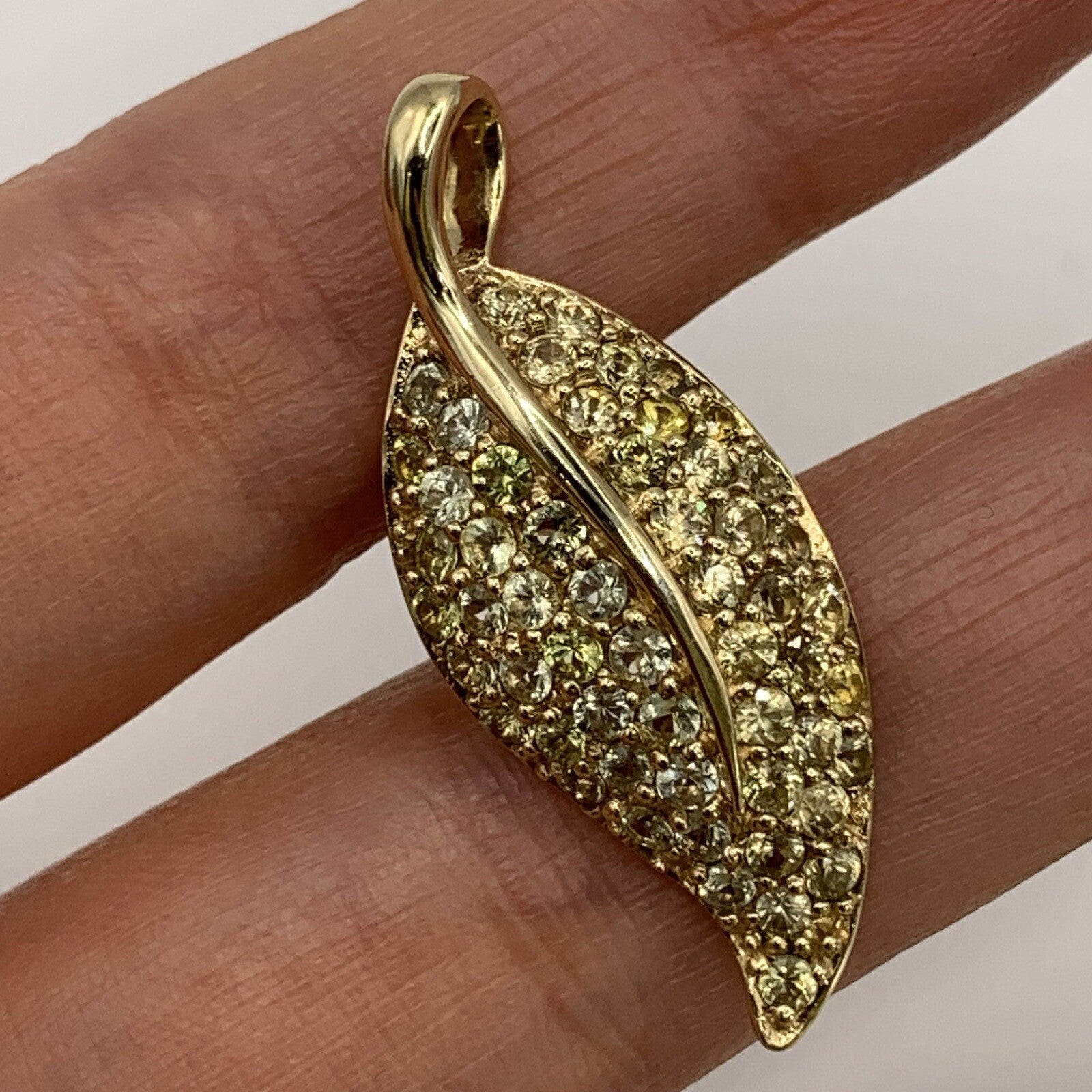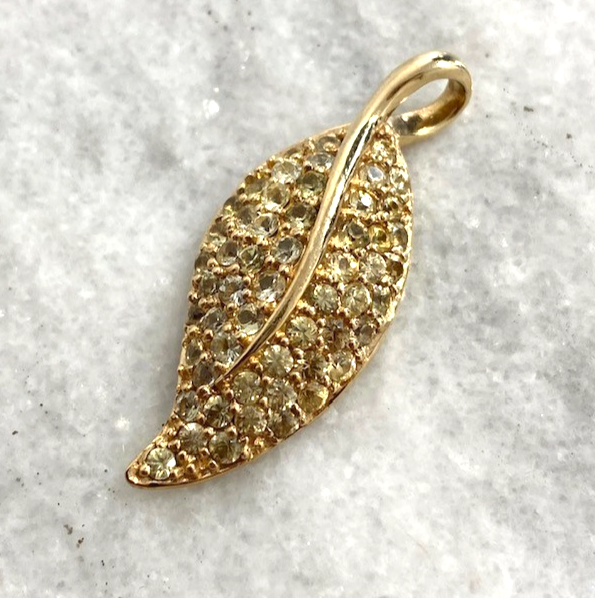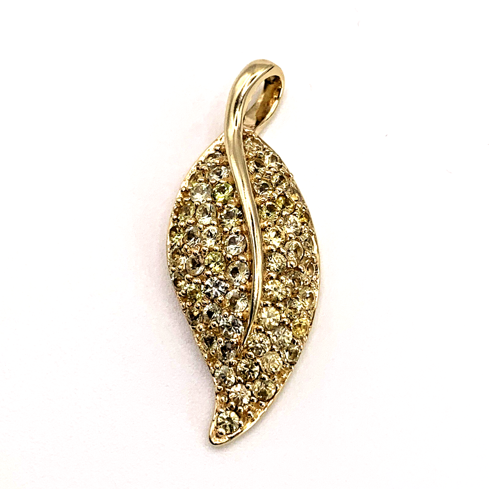 - A stunning leaf shaped pendant adorned with pave set yellow-green hued beryl gemstones. This is a beautiful well made piece of fine jewellery with plenty of lustre and sparkle.