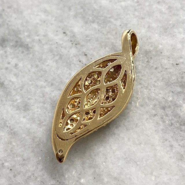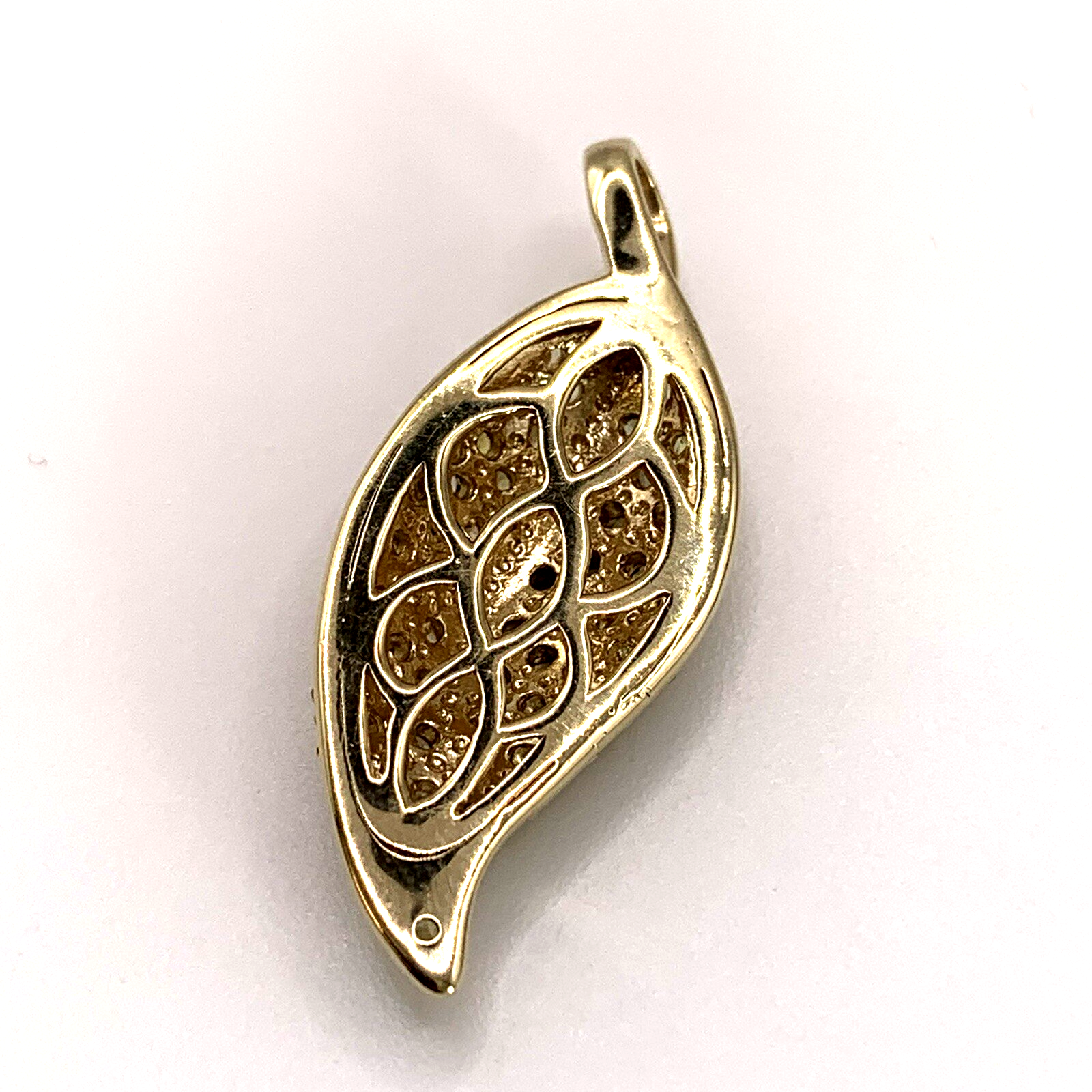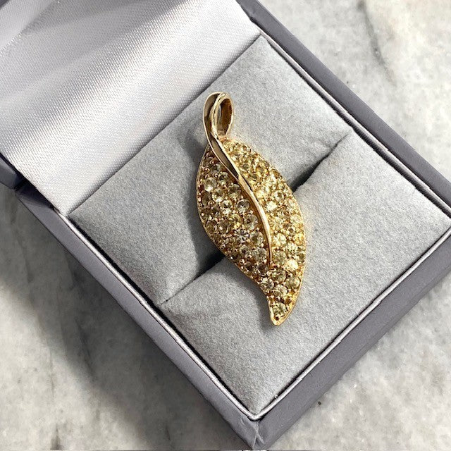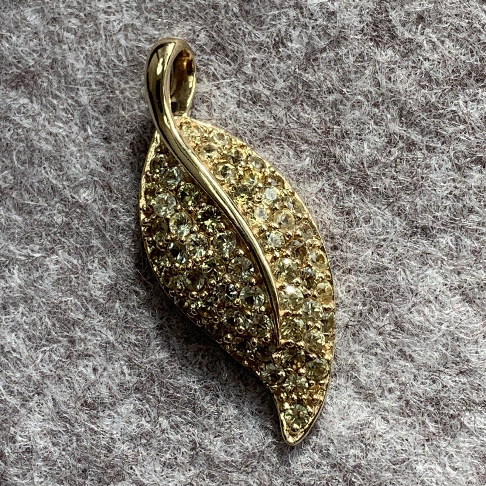 - A stunning leaf shaped pendant adorned with pave set yellow-green hued beryl gemstones. This is a beautiful well made piece of fine jewellery with plenty of lustre and sparkle.