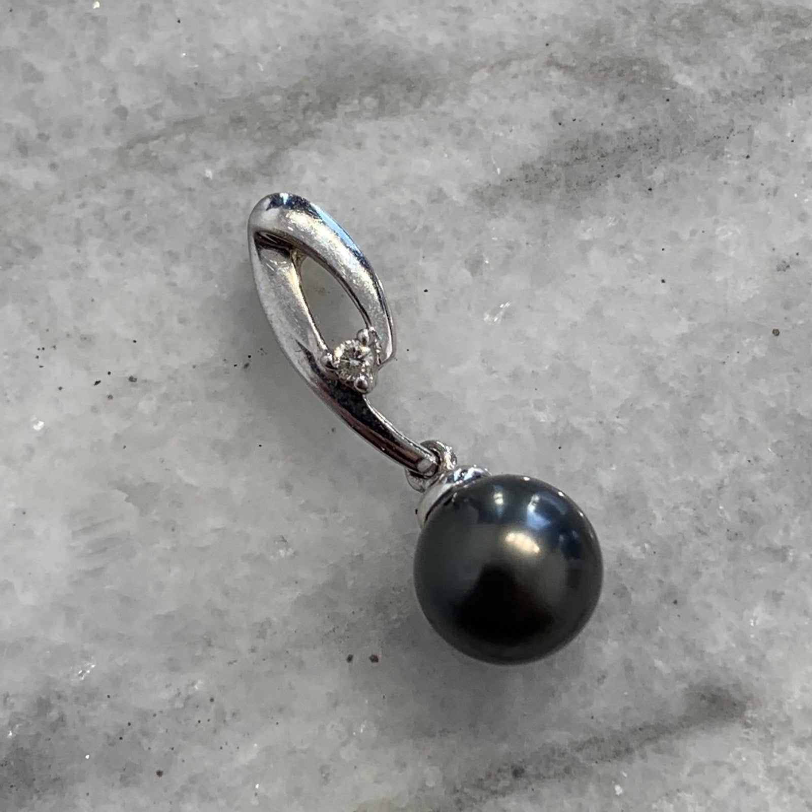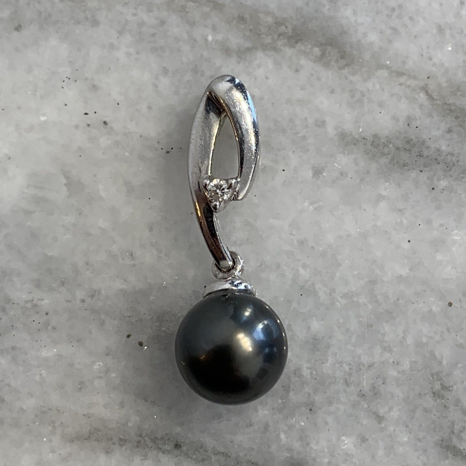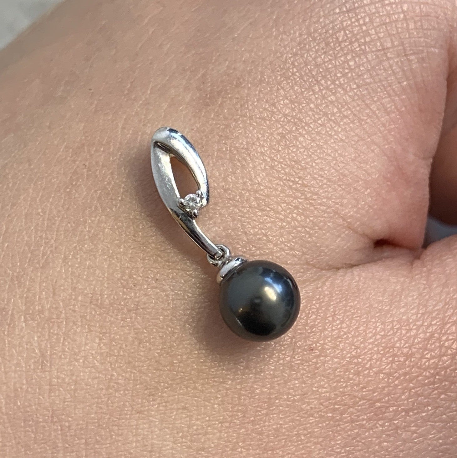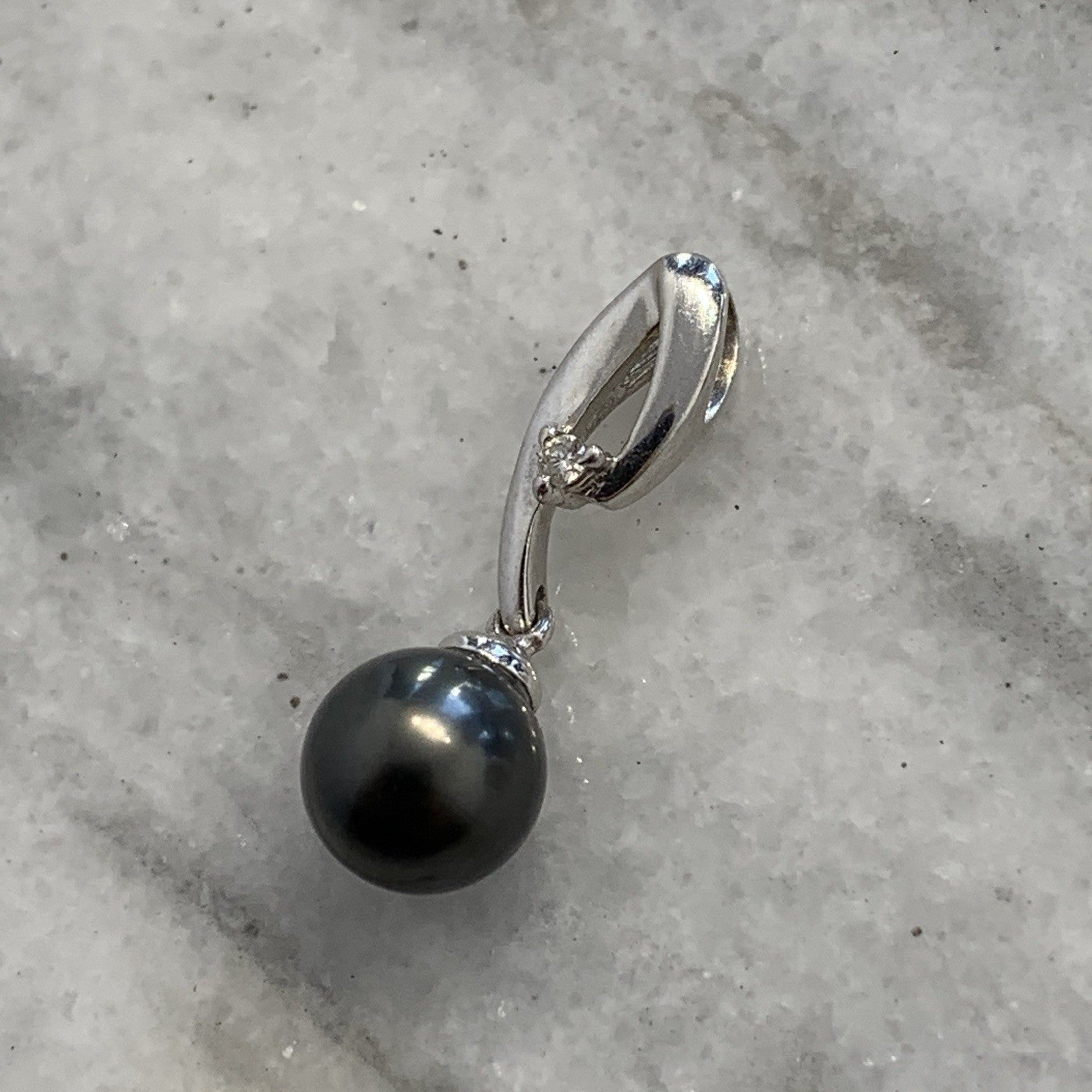 A charming white gold drop pendant showcasing a single black pearl, accented by a petite diamond.