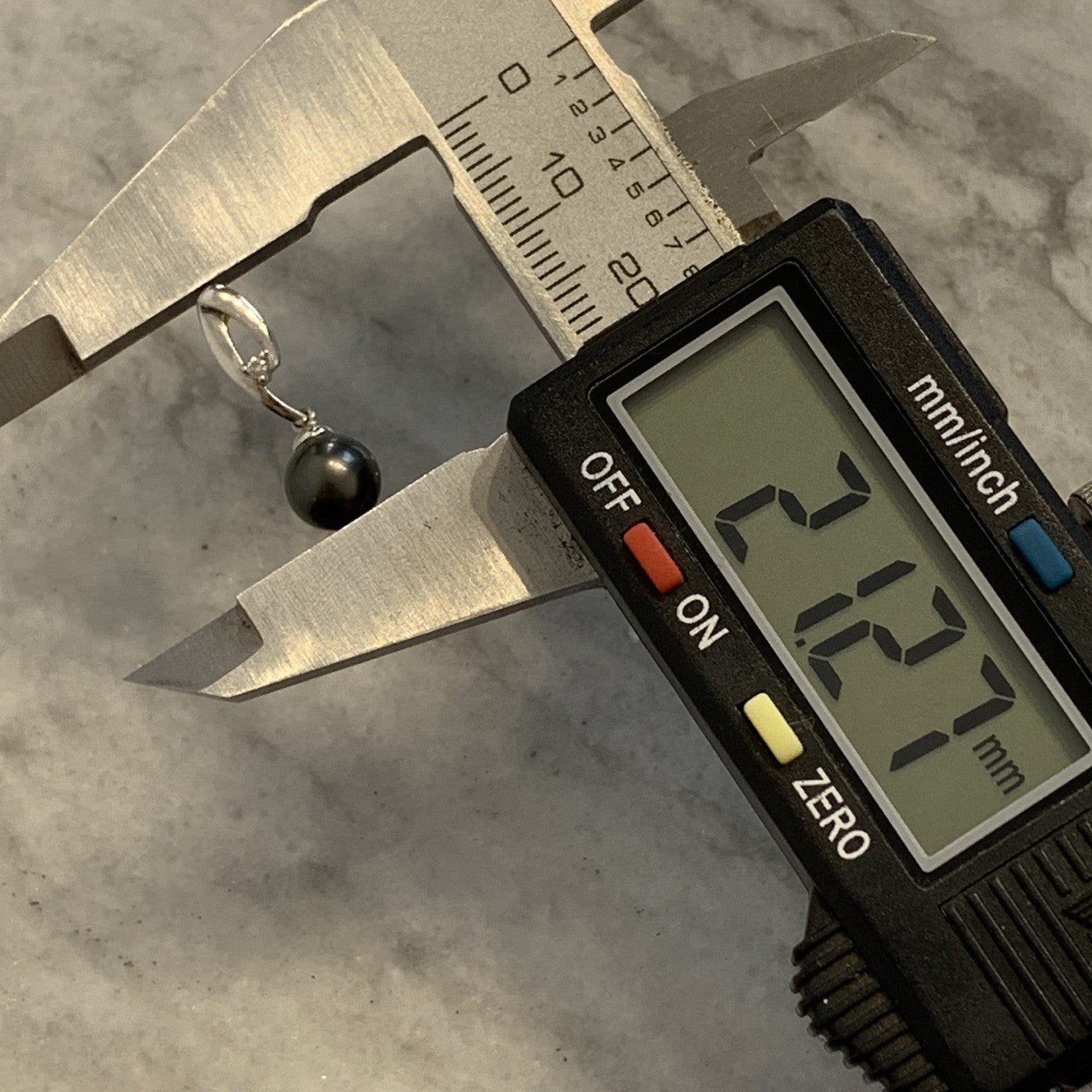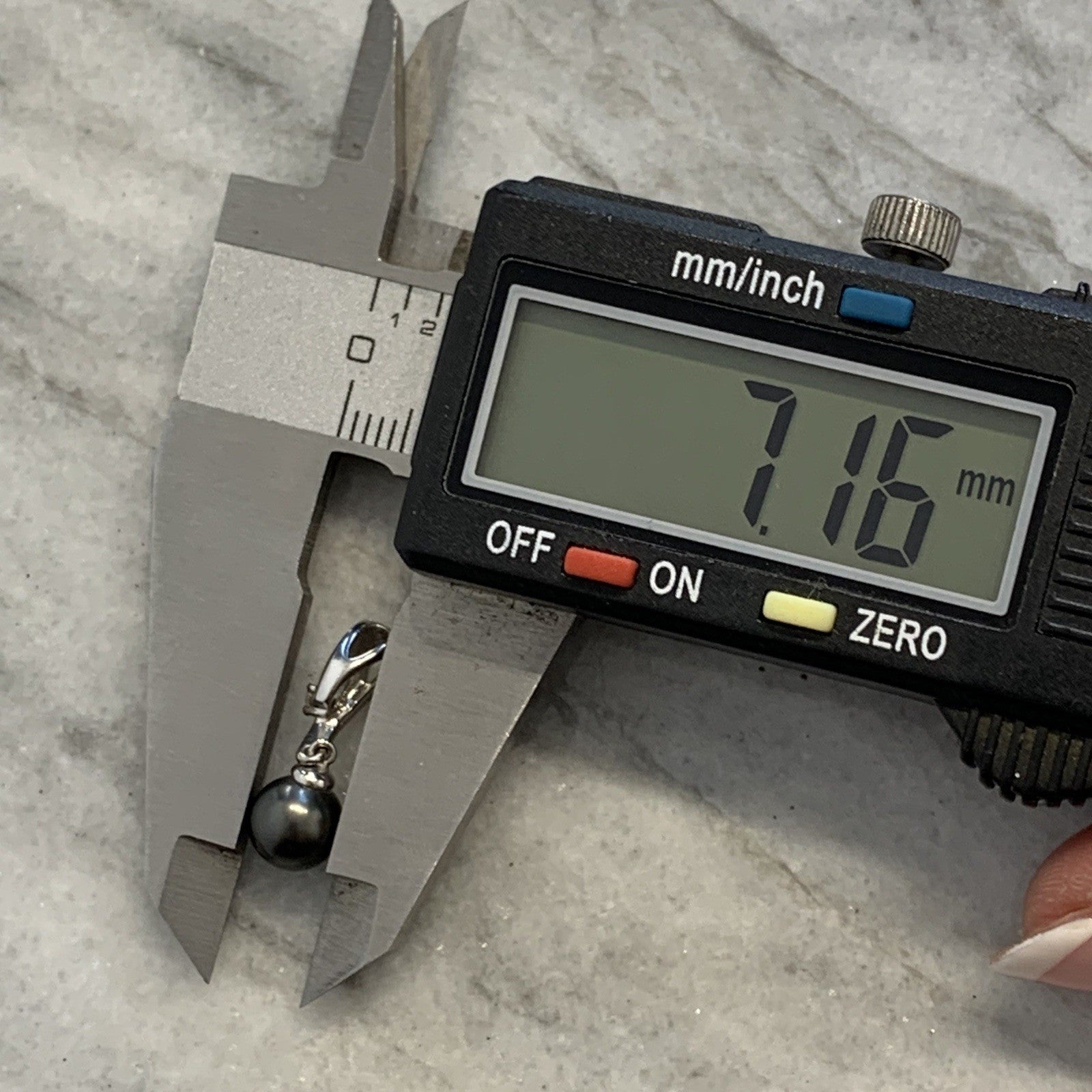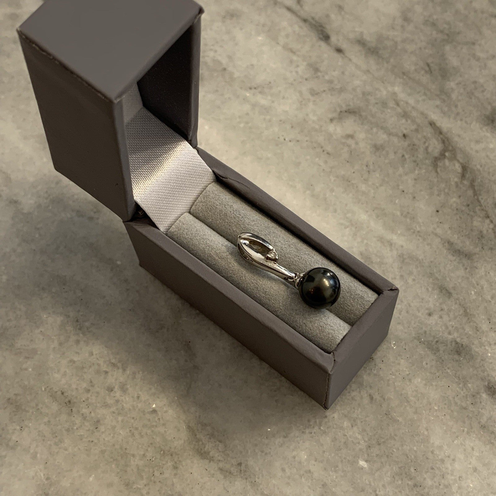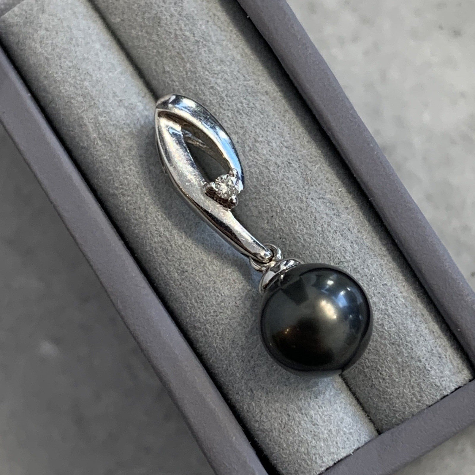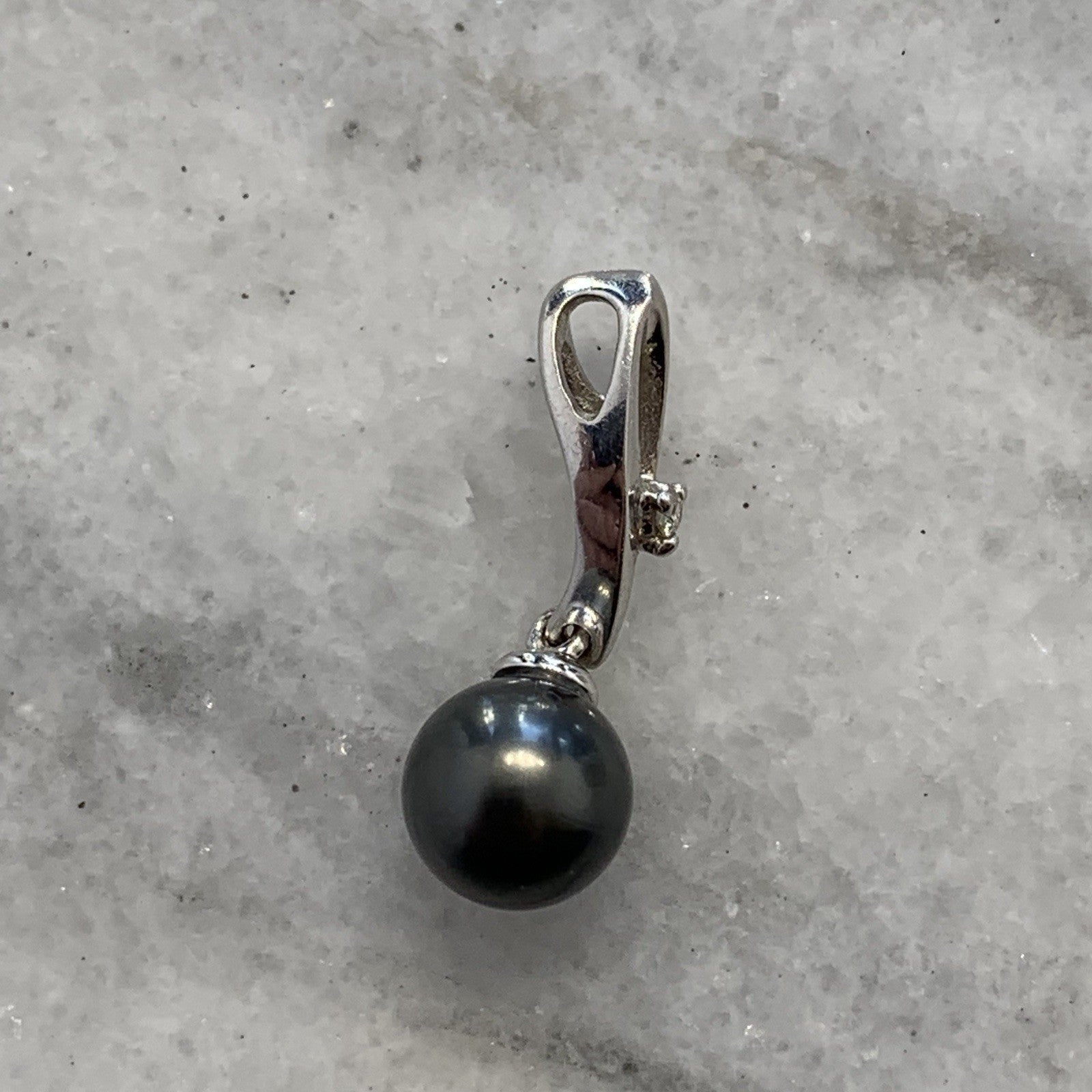 A charming white gold drop pendant showcasing a single black pearl, accented by a petite diamond.