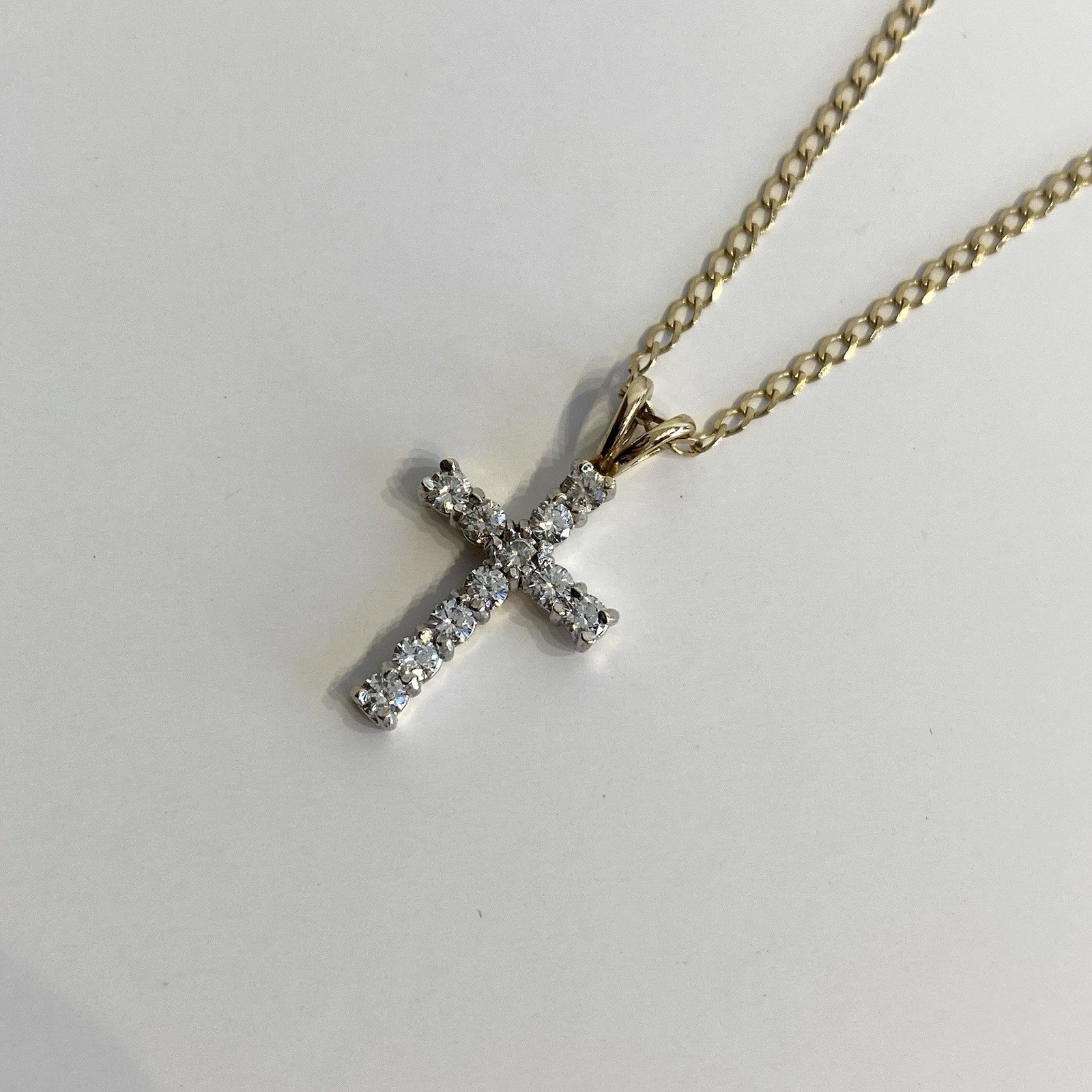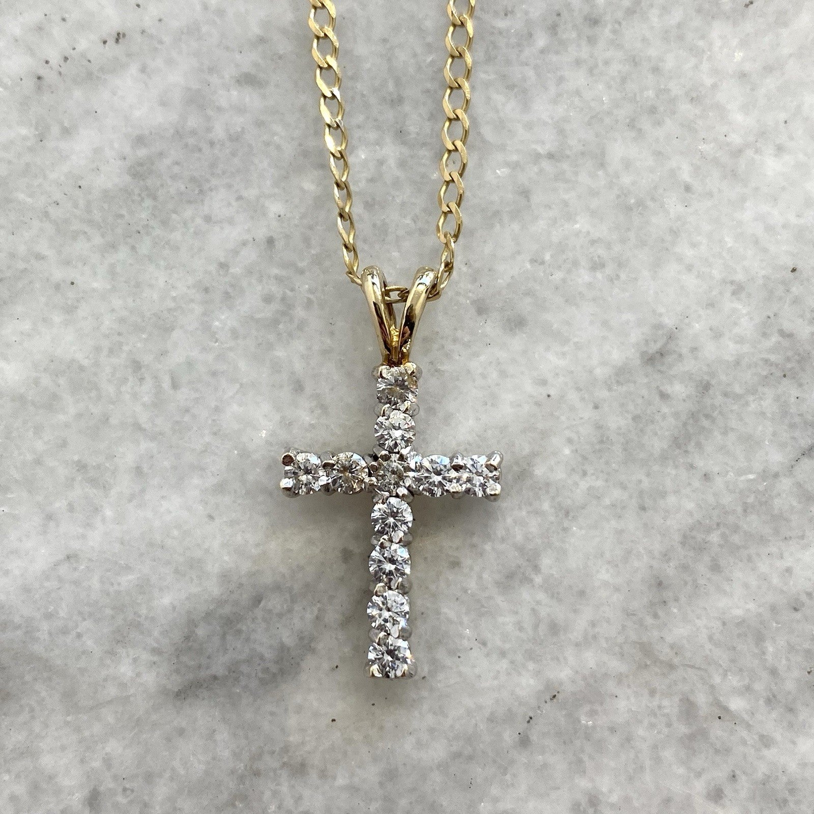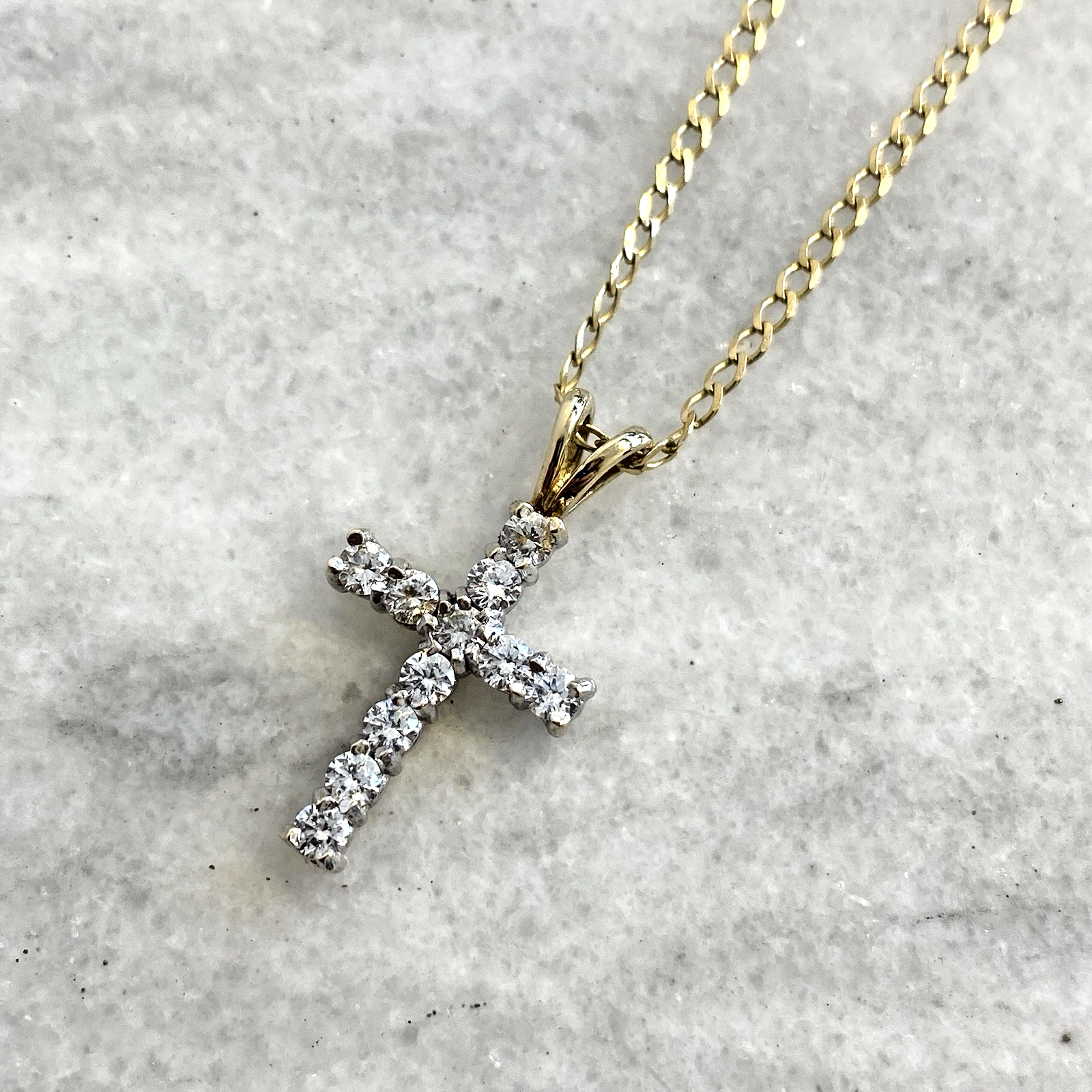 A stunning gold crucifix pendant showcasing round cut cubic zirconia upon a curb chain.