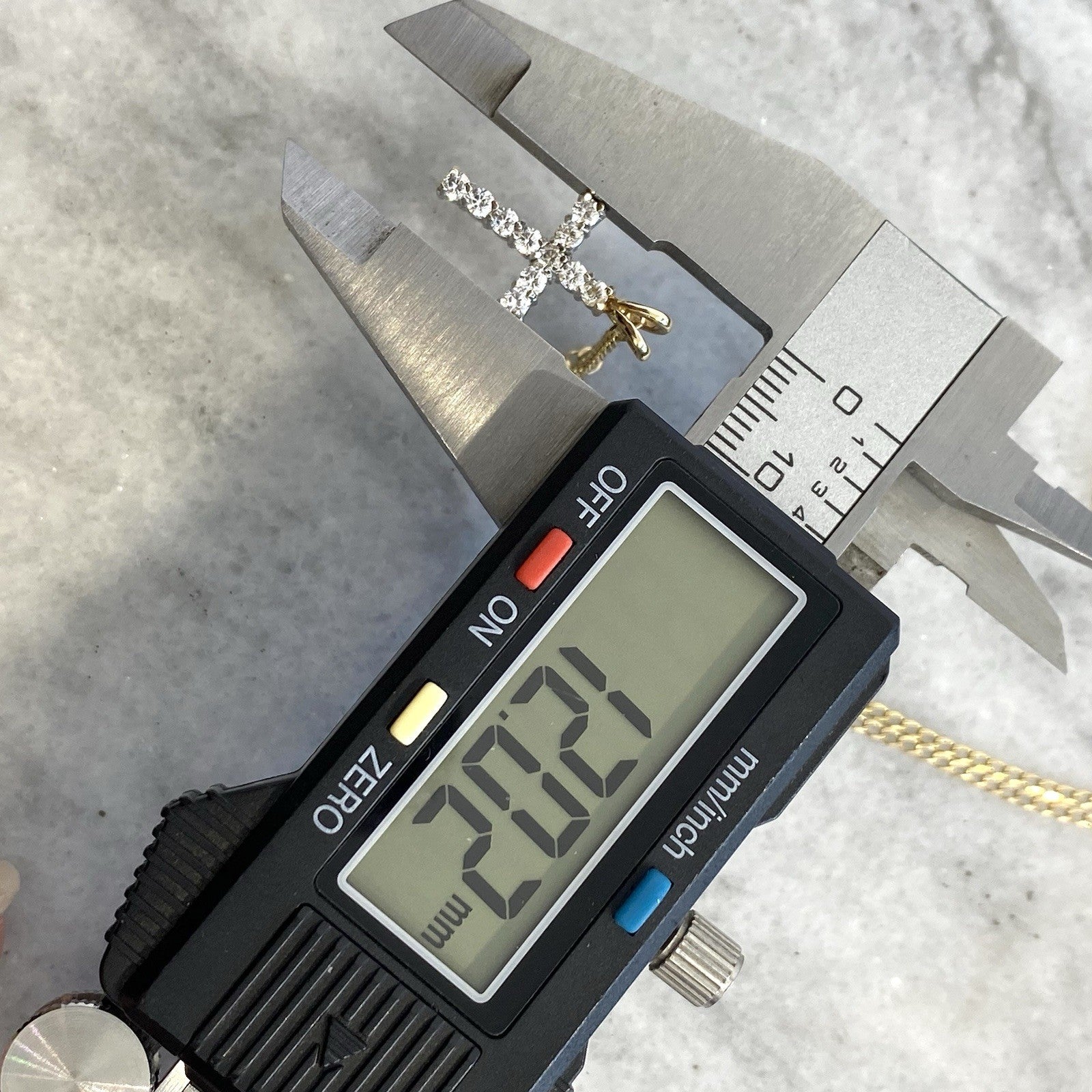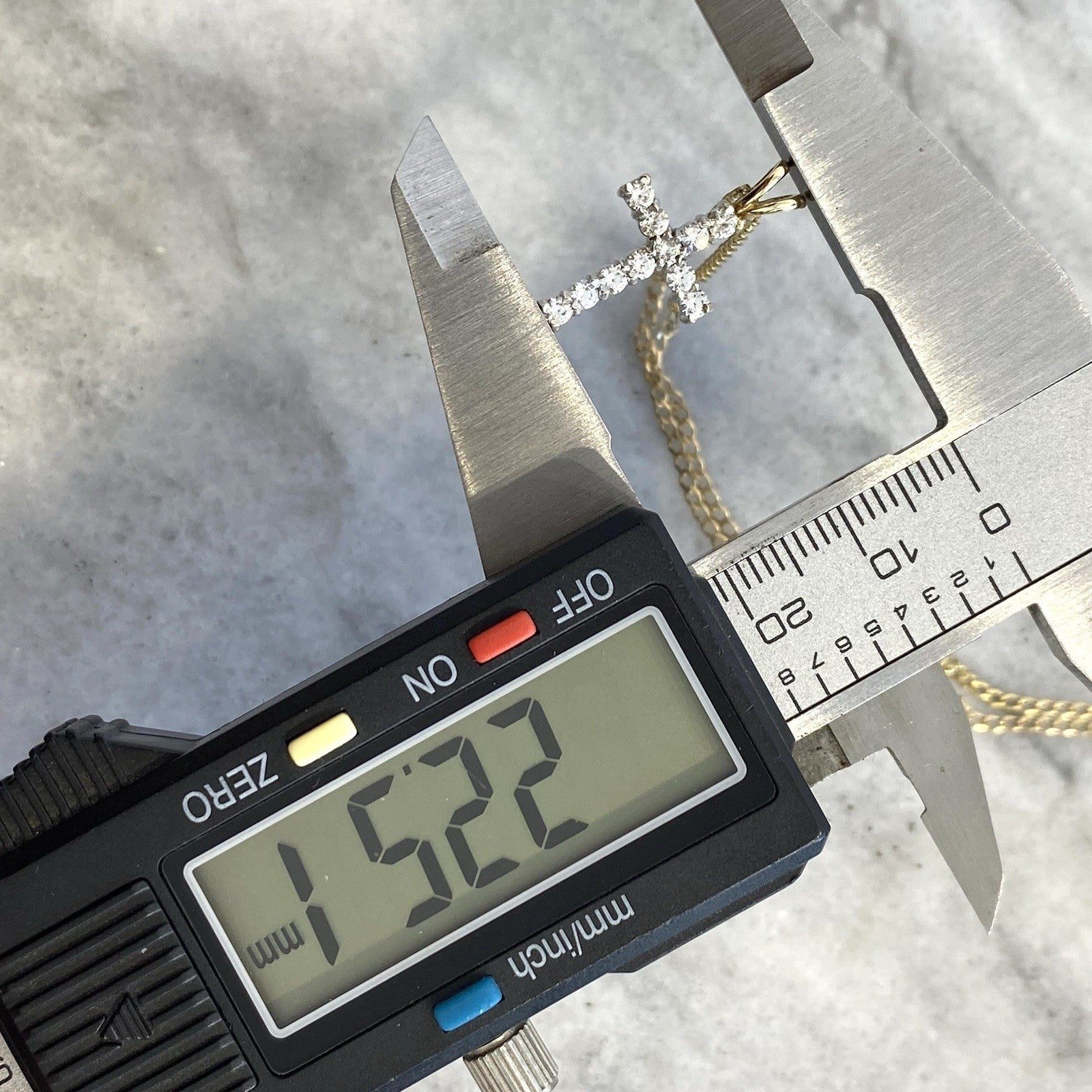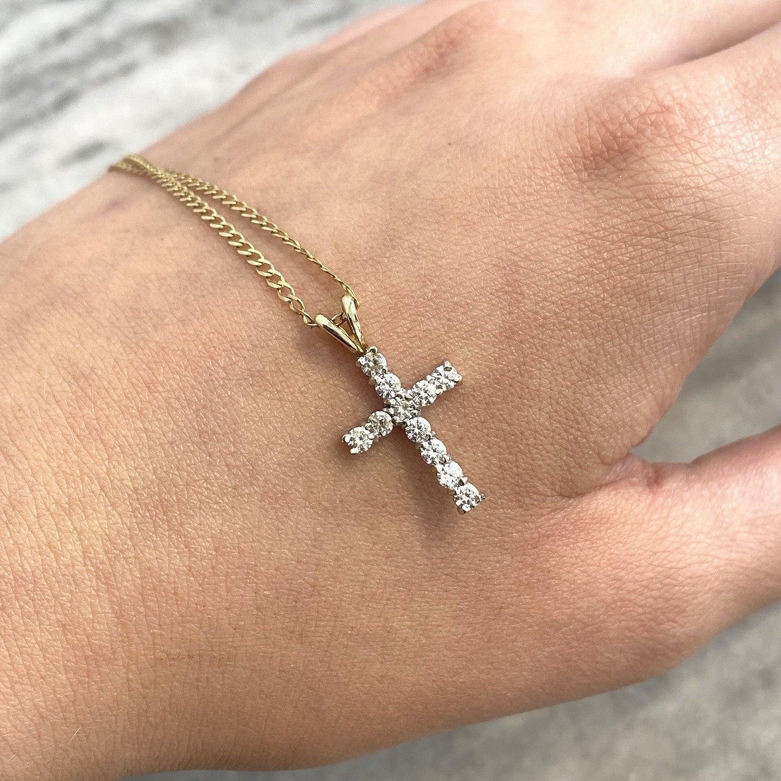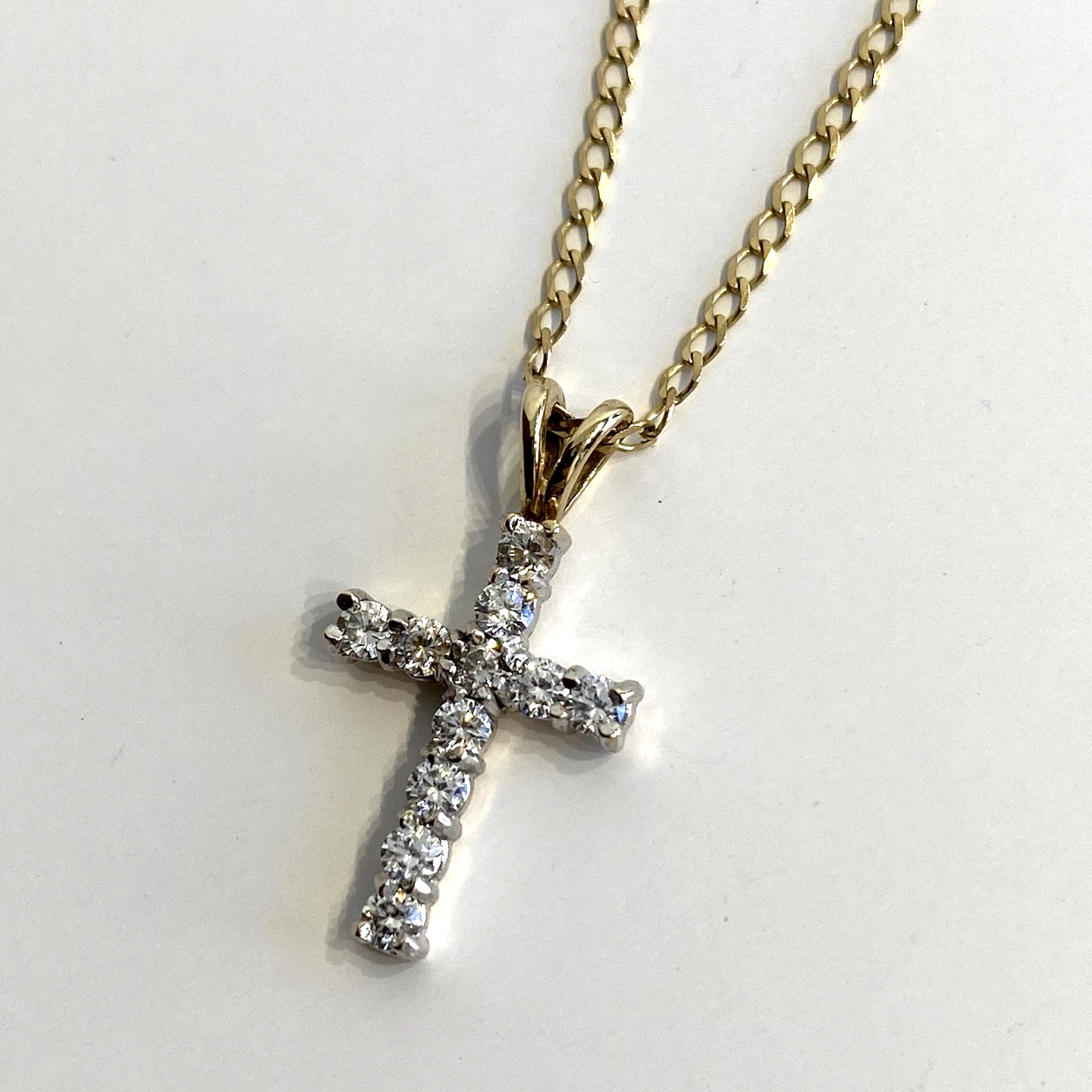 A stunning gold crucifix pendant showcasing round cut cubic zirconia upon a curb chain.