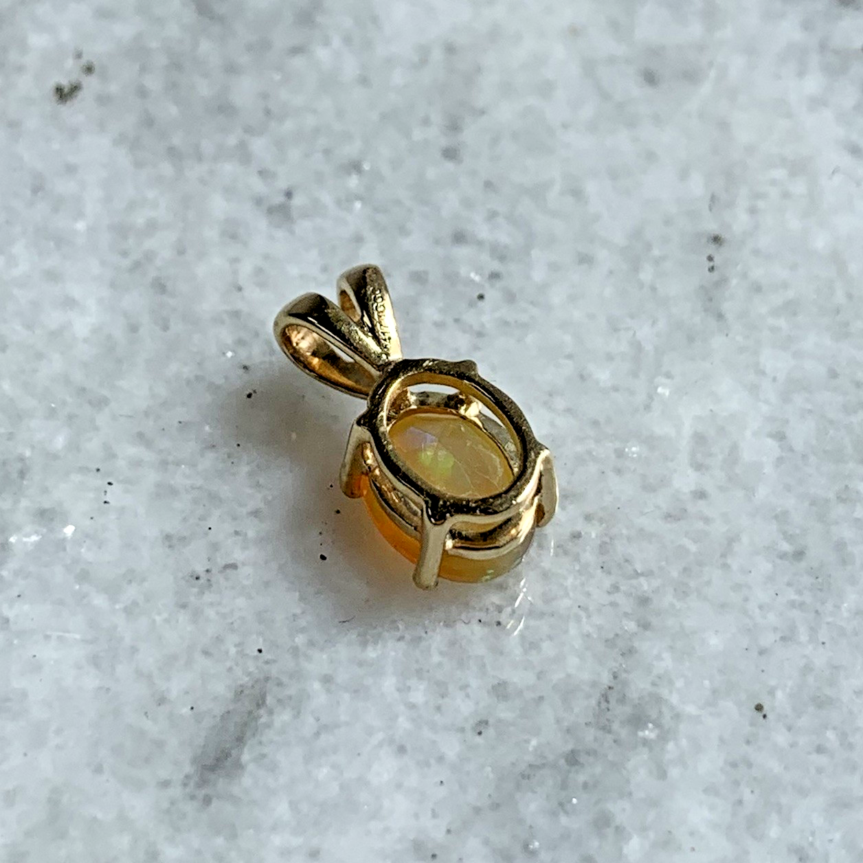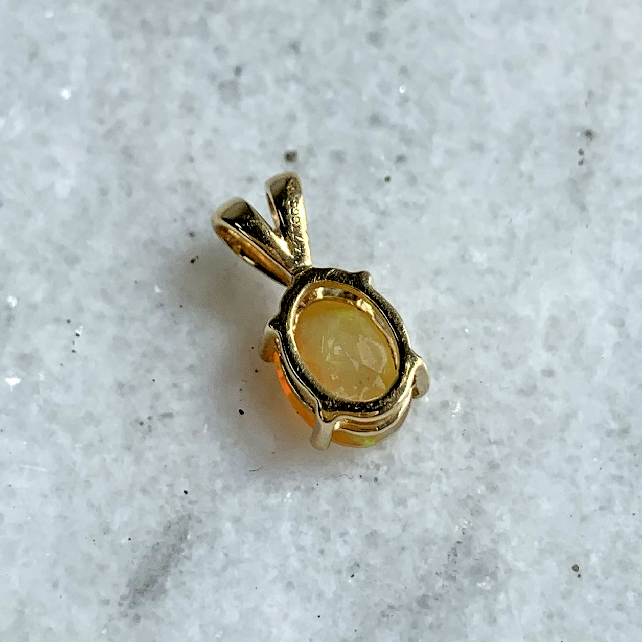 A beautiful gold pendant showcasing an oval cut fire opal gemstone.