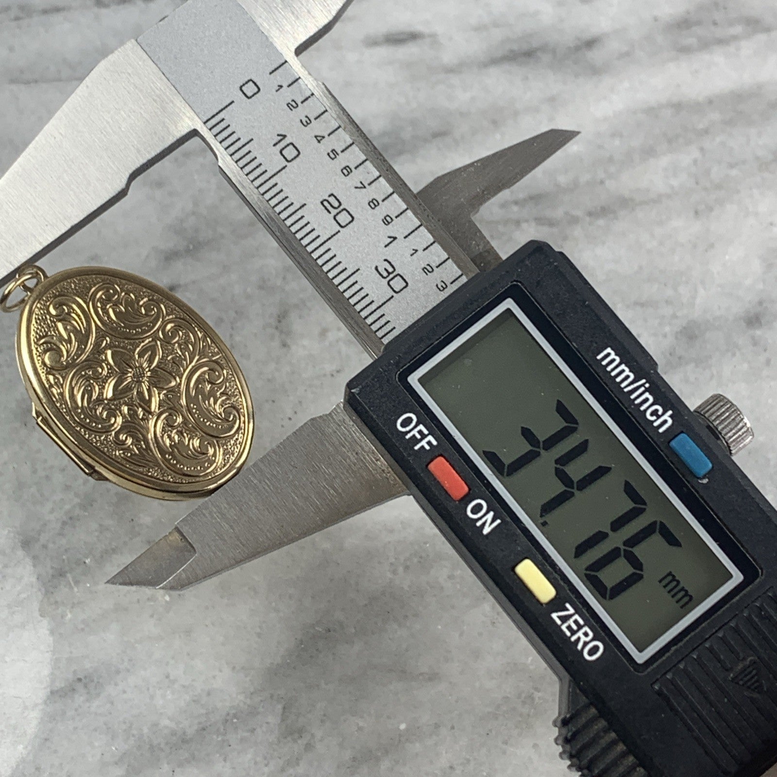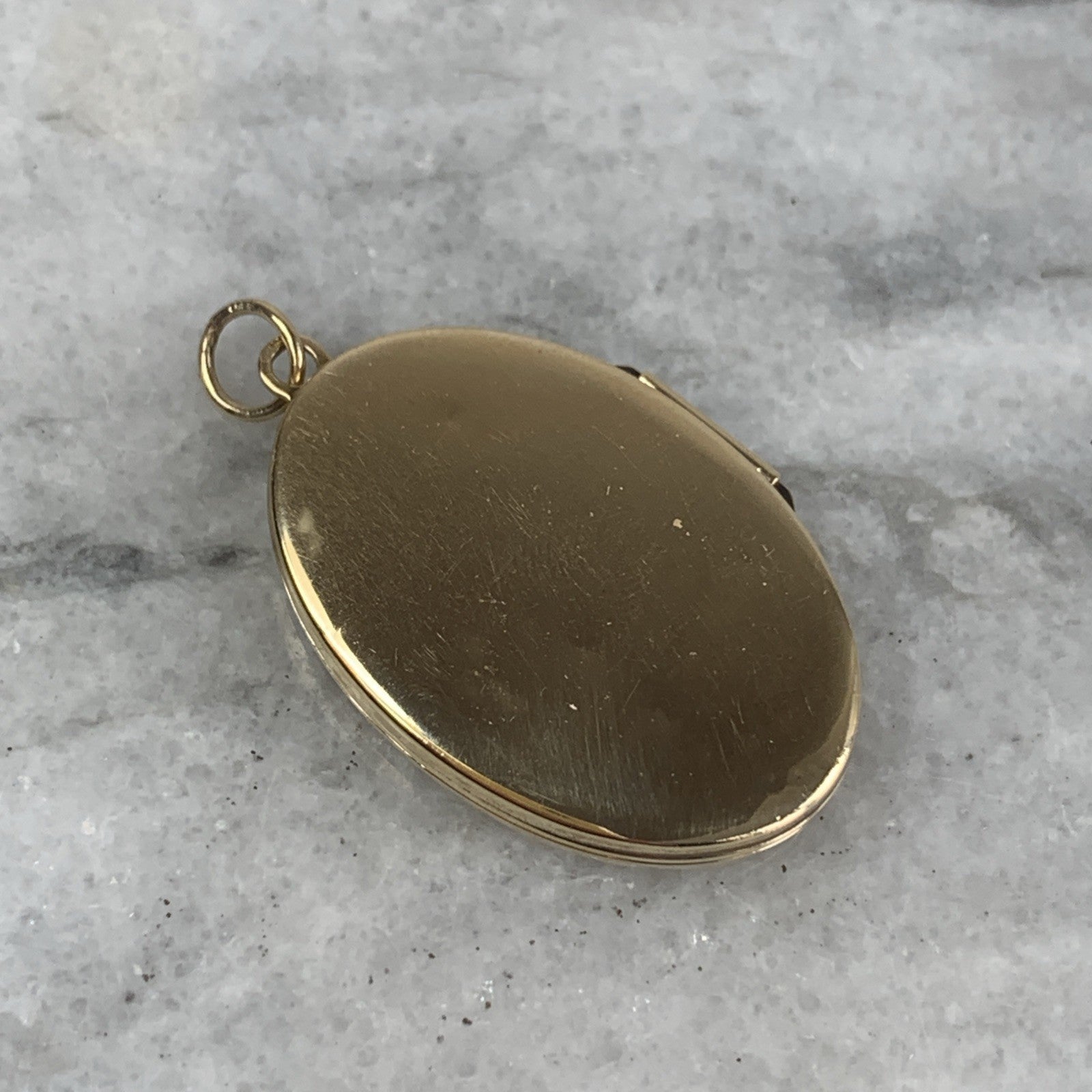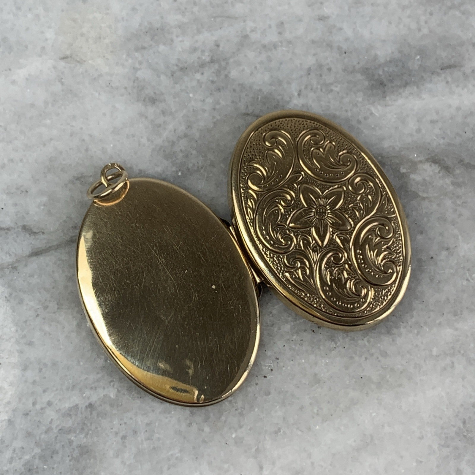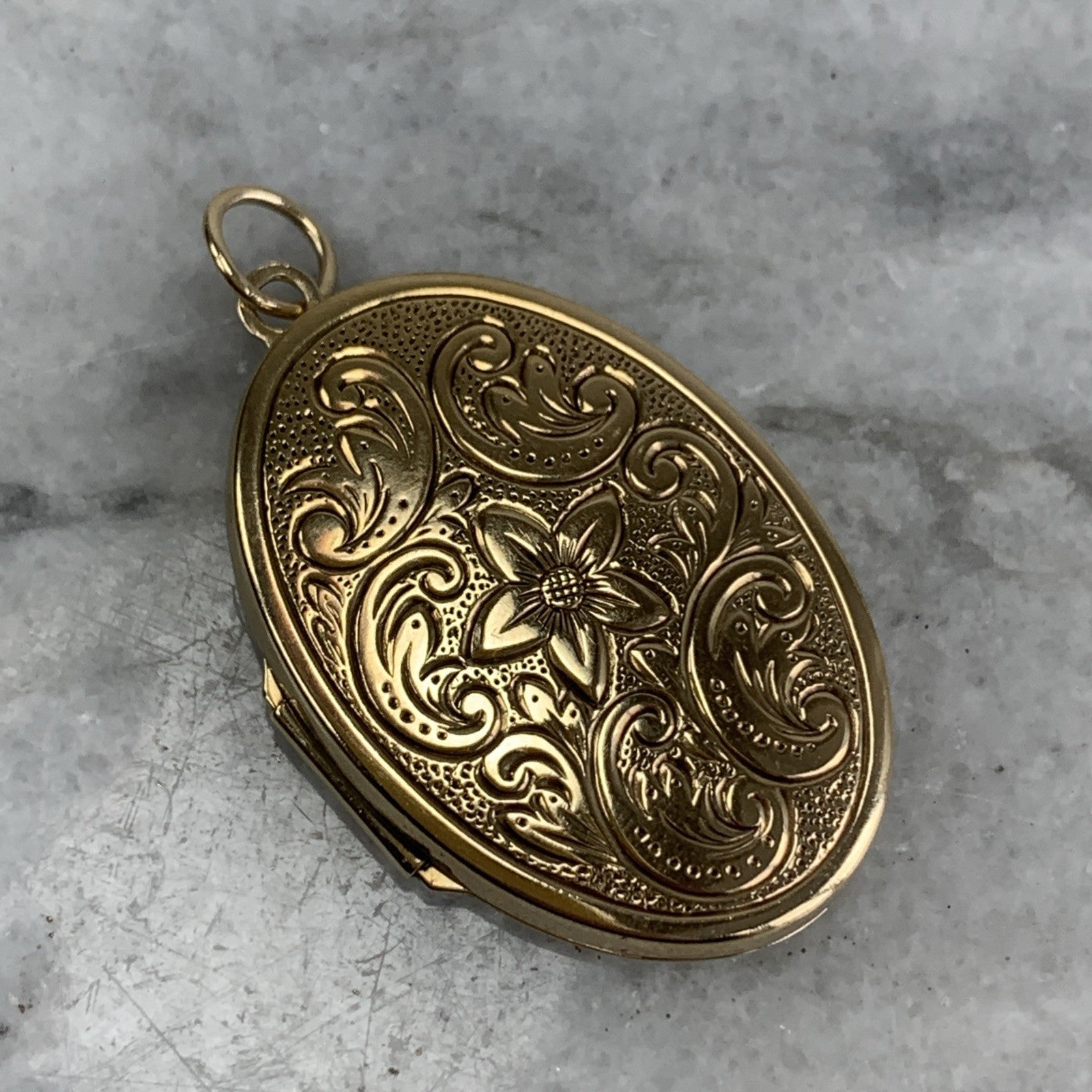A beautiful oval shaped gold locket pendant featuring floral engraved patterns.