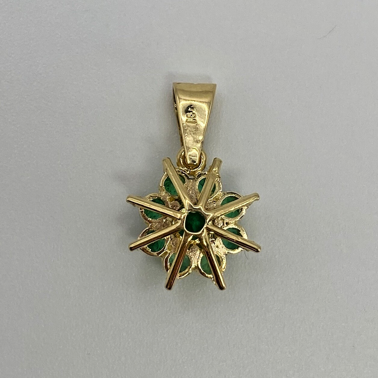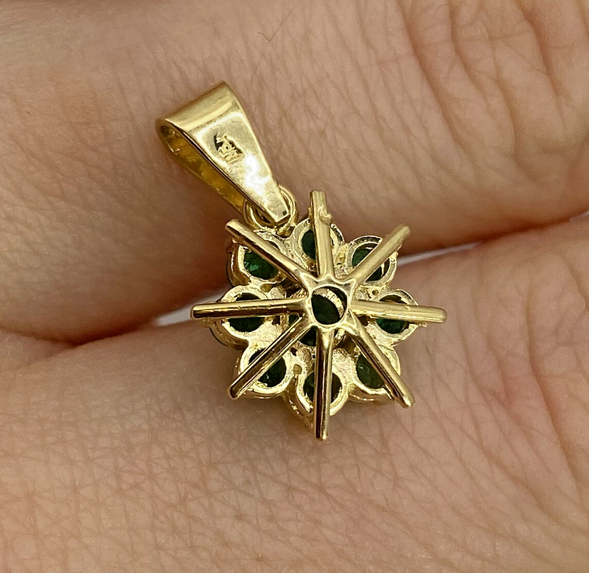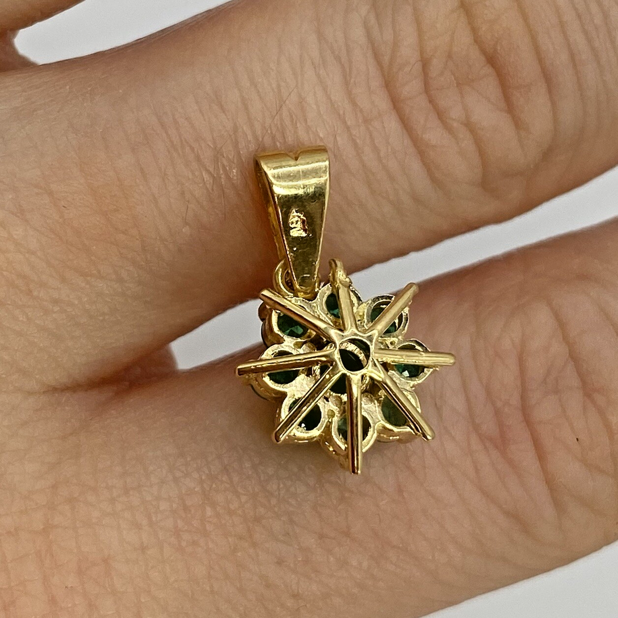A beautiful gold pendant showcasing a daisy flower style cluster of vibrant green cubic zirconia stones.