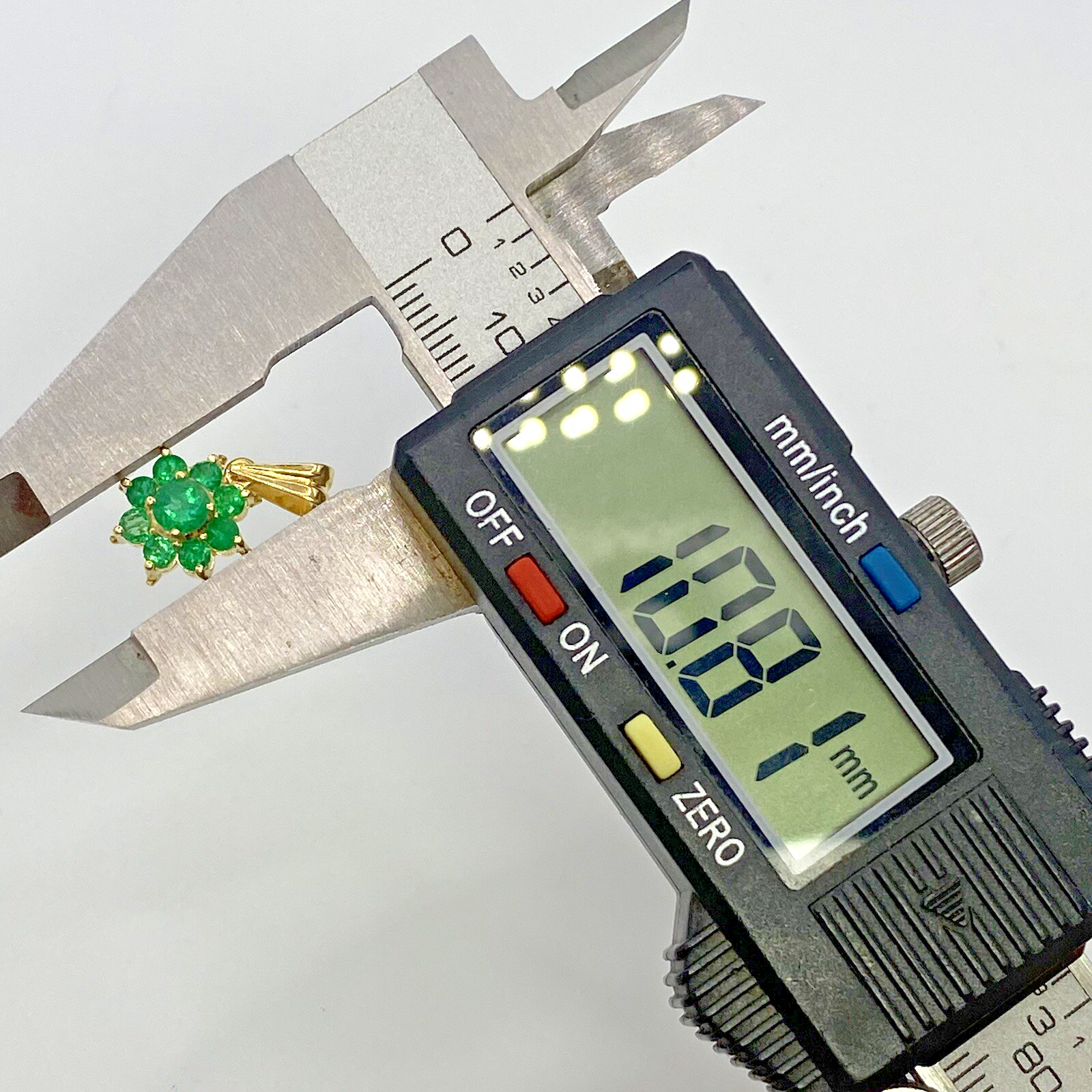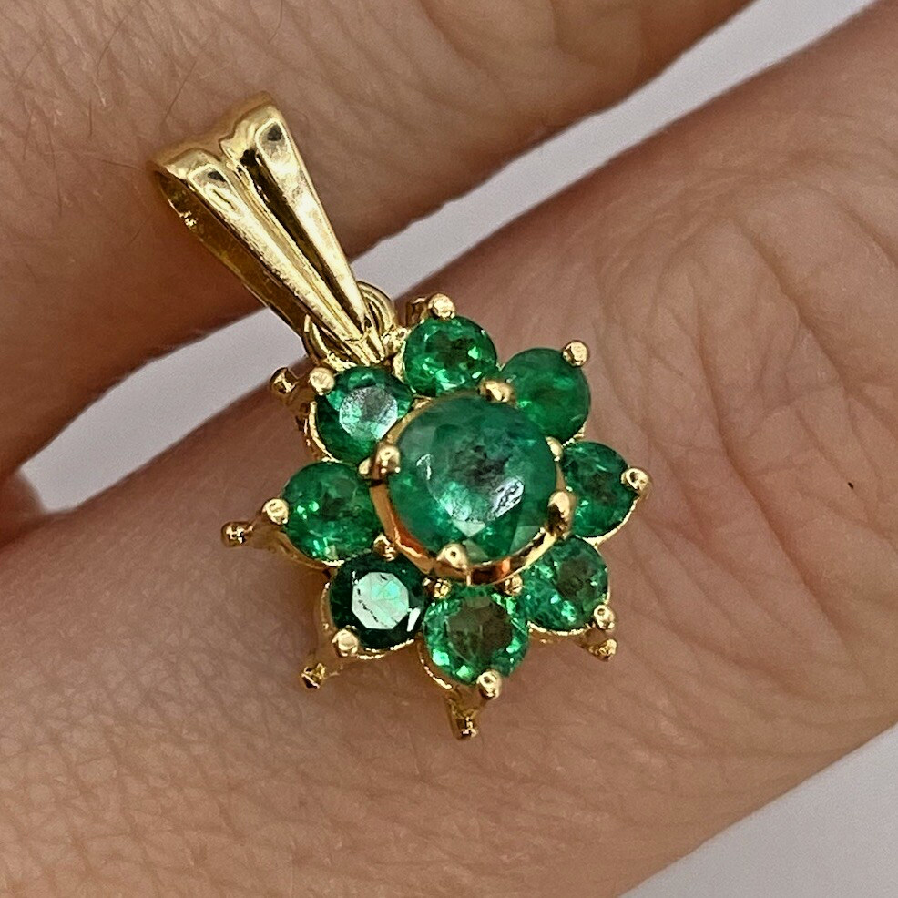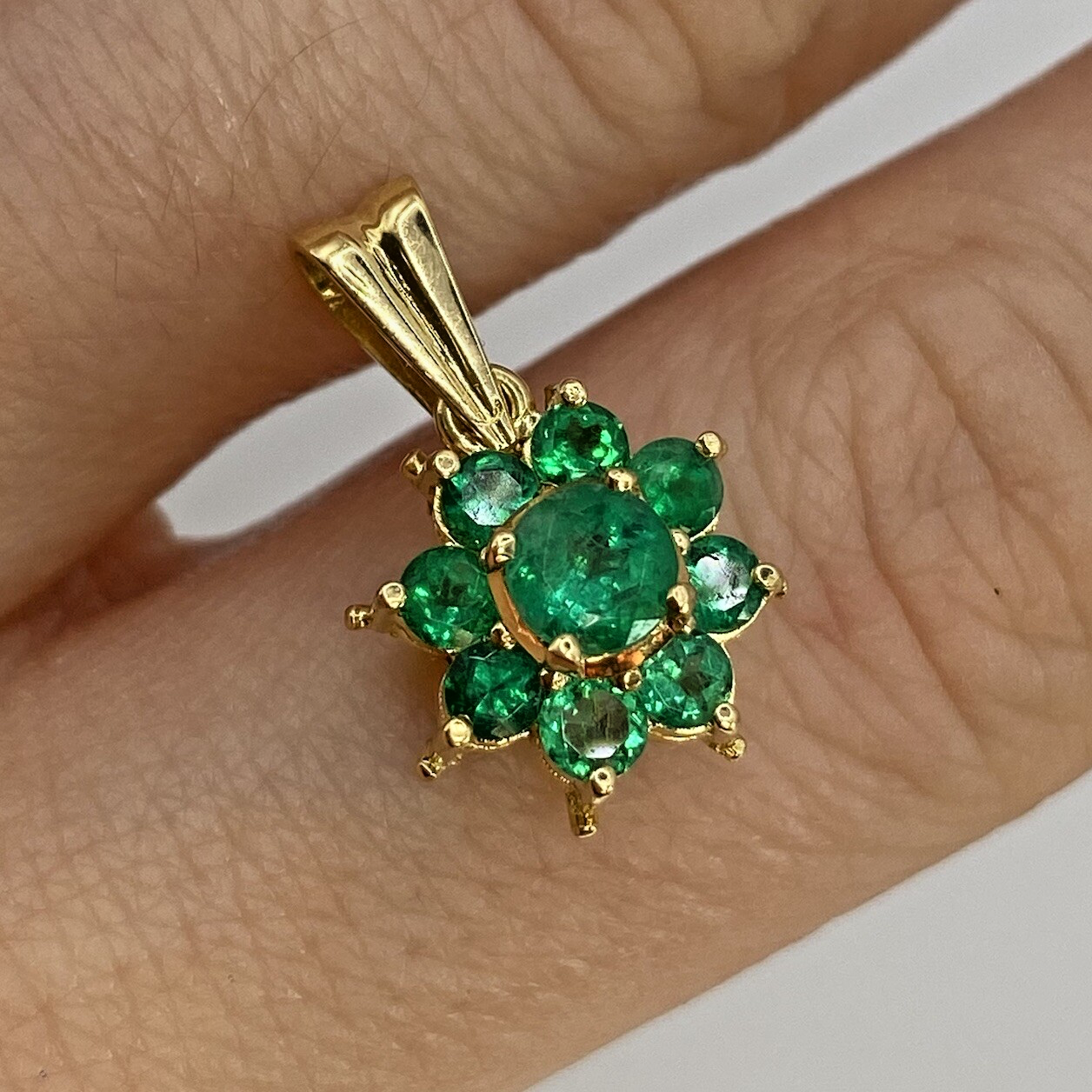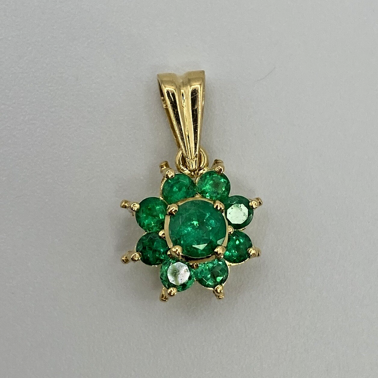 A beautiful gold pendant showcasing a daisy flower style cluster of vibrant green cubic zirconia stones.