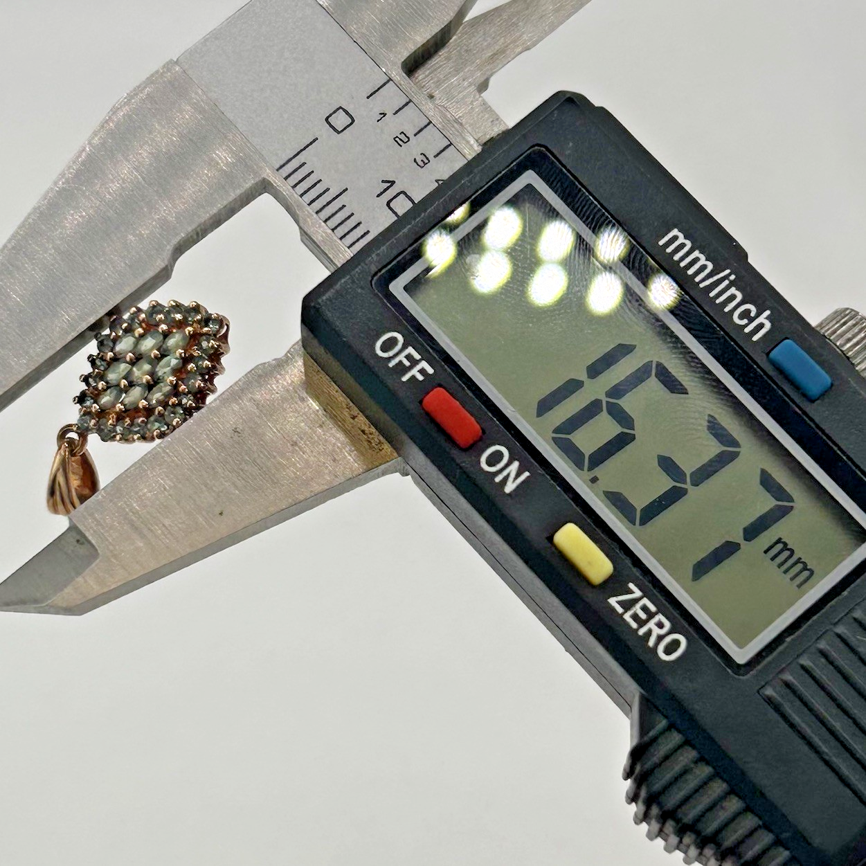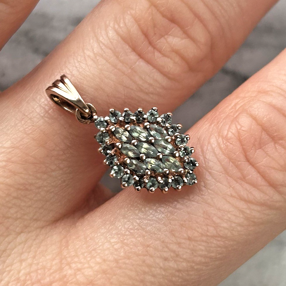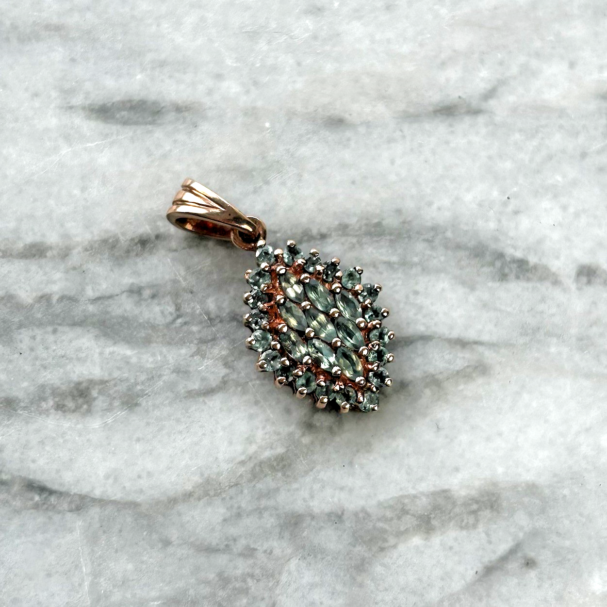 A stunning rose gold pendant featuring a collection of both marquise and round cut green spinel gemstones.