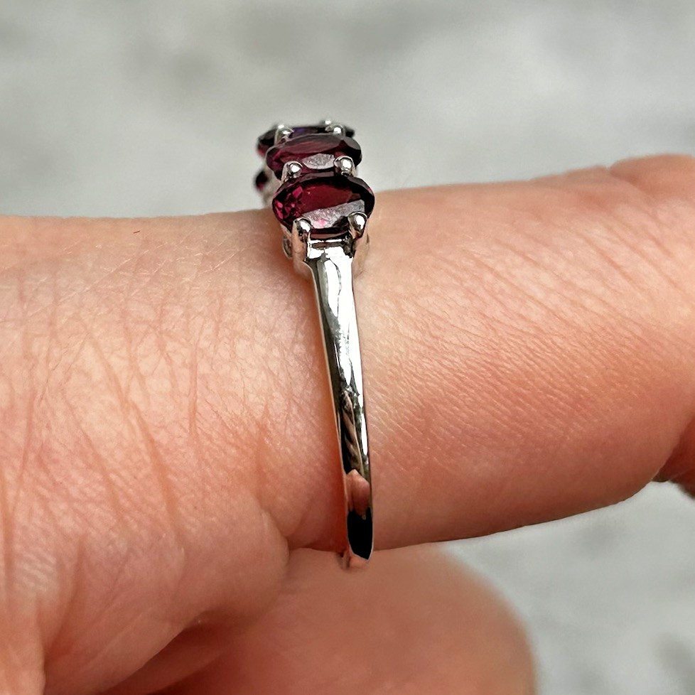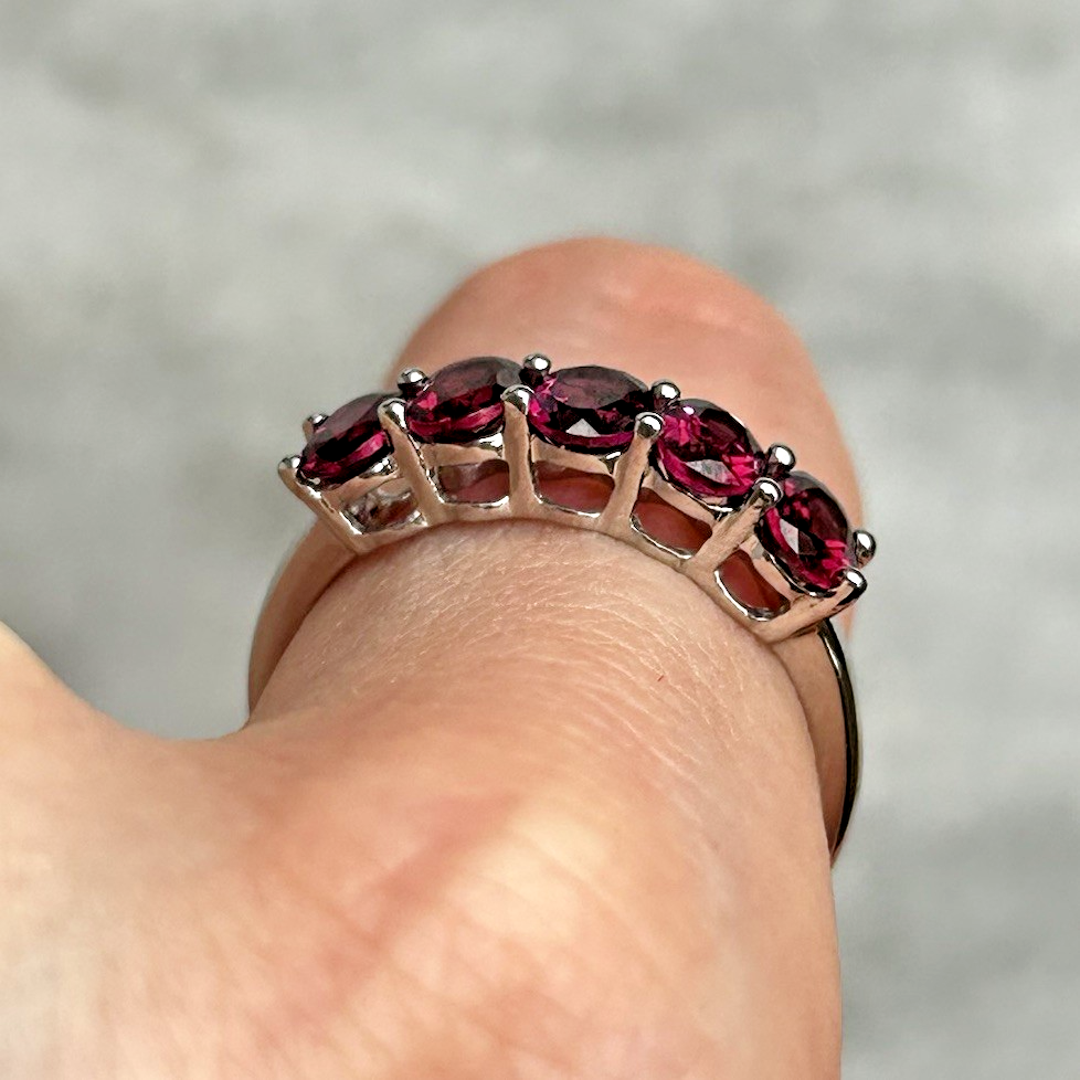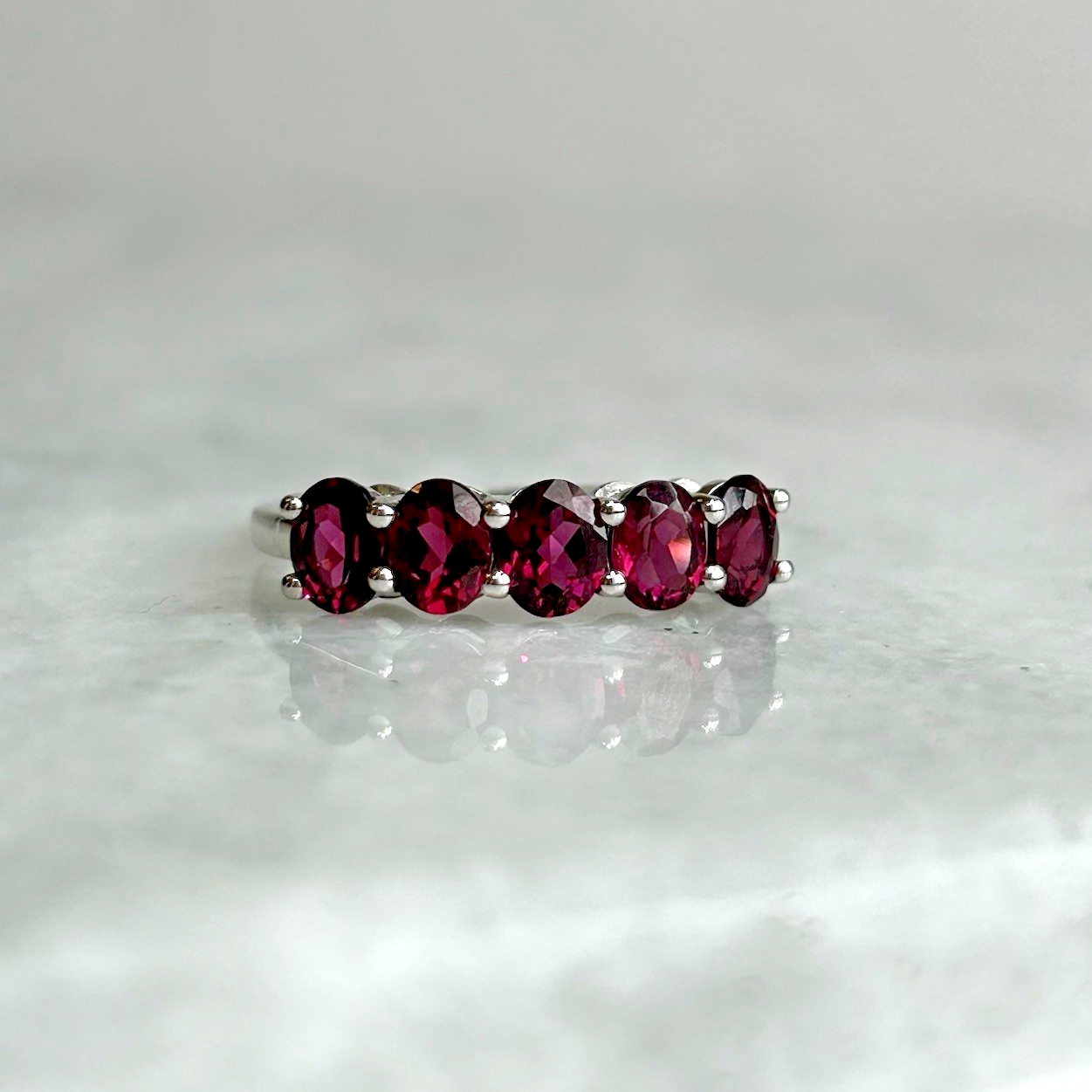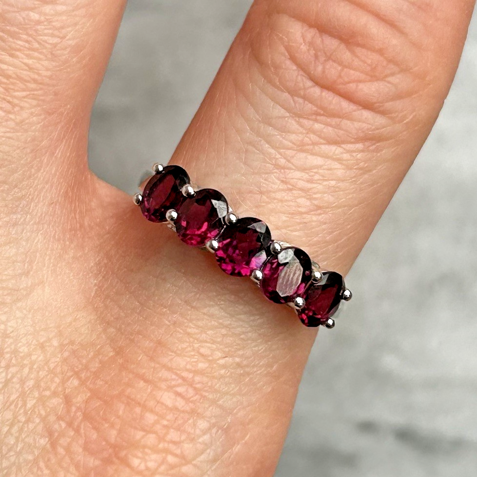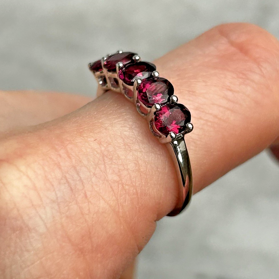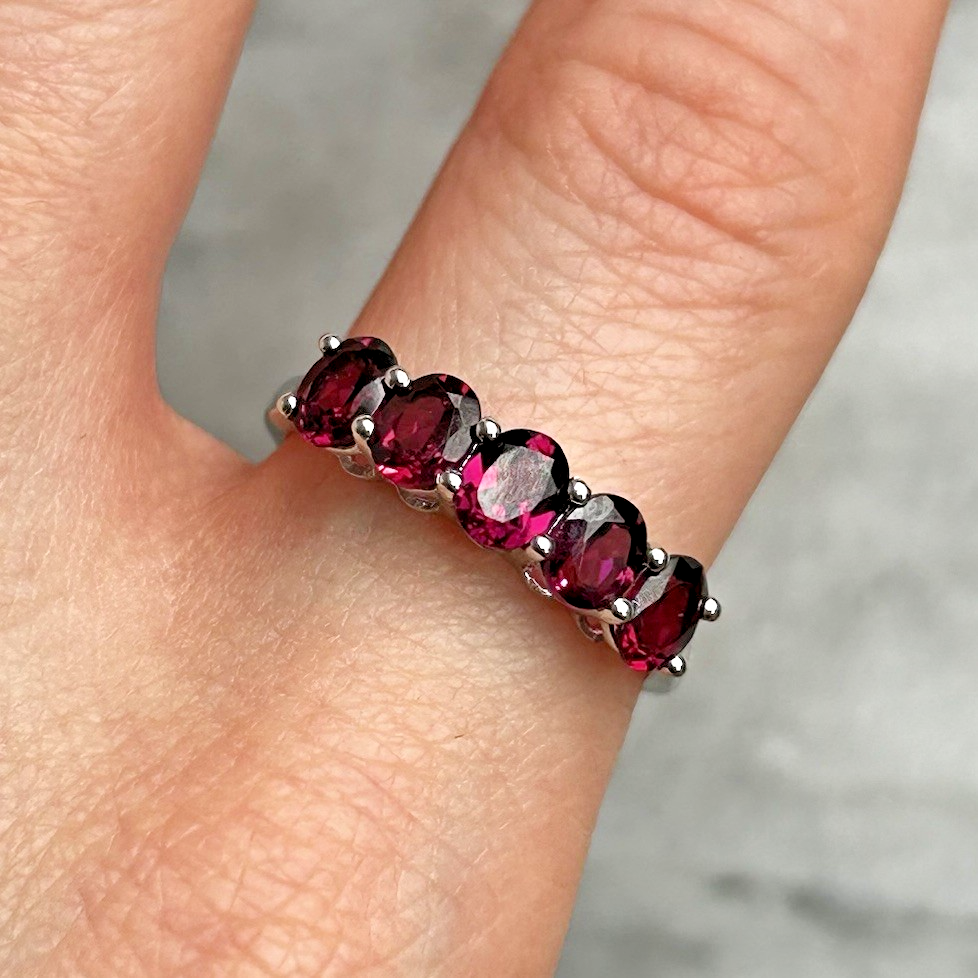 A stunning gold ring showcasing a quintet of oval cut rhodolite garnet.