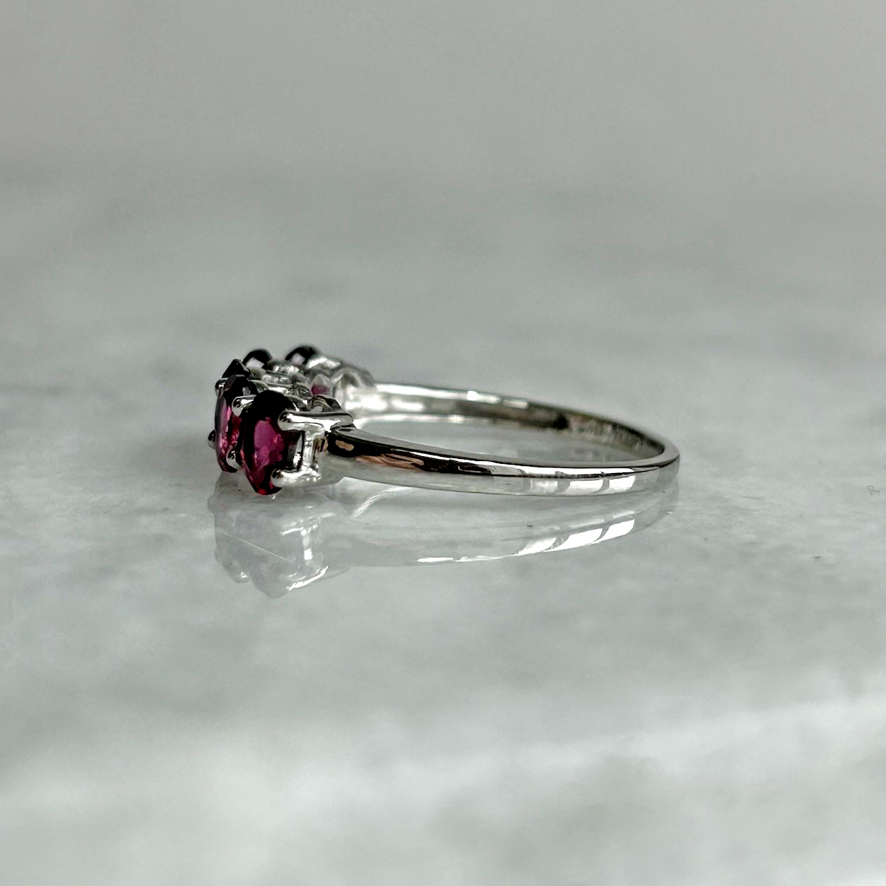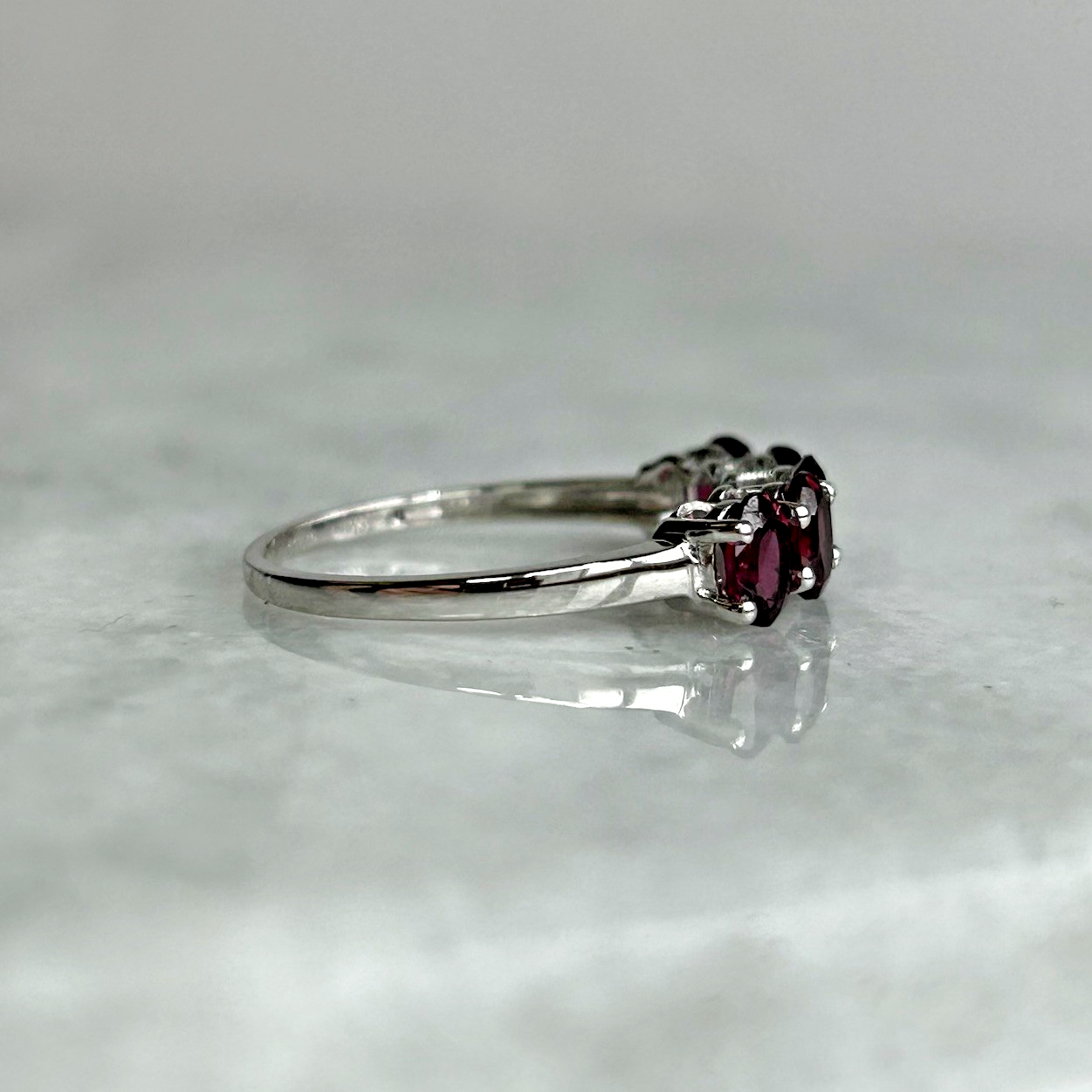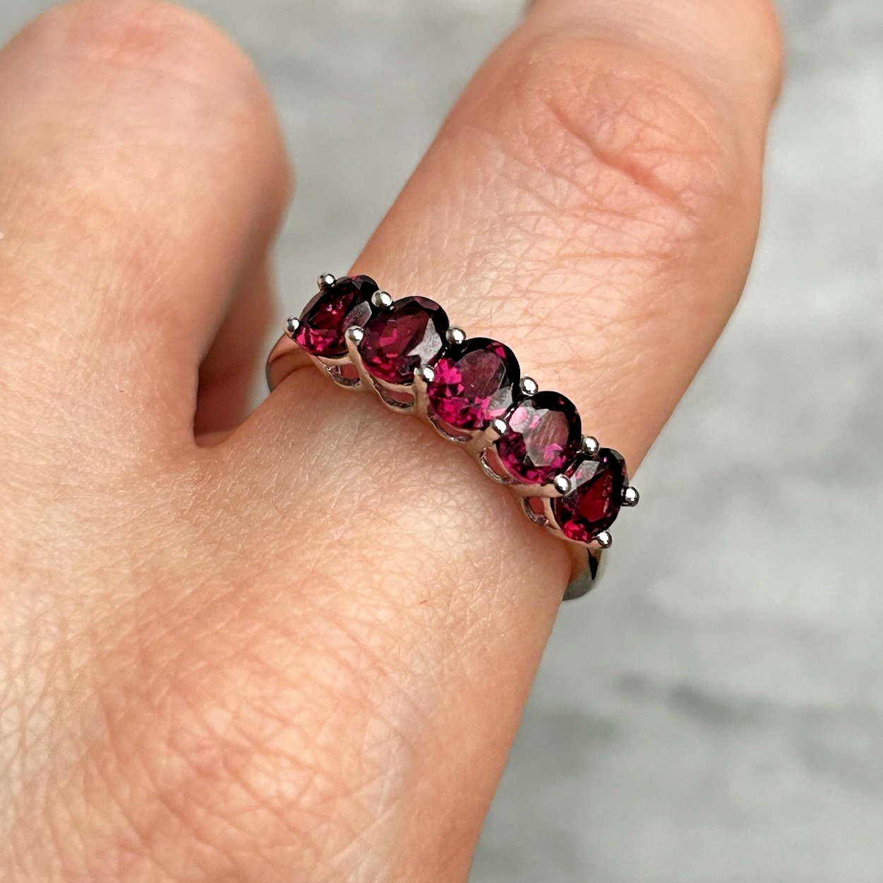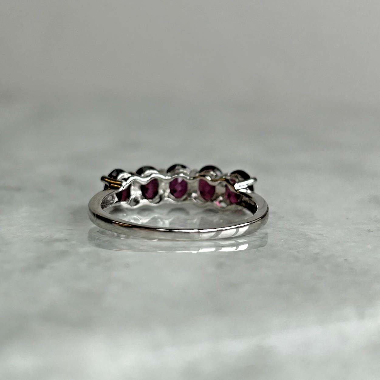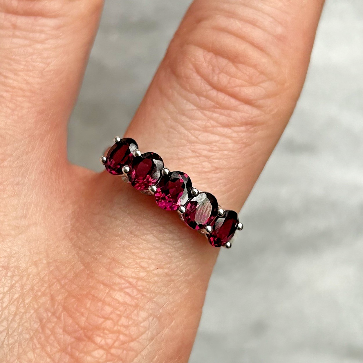 A stunning gold ring showcasing a quintet of oval cut rhodolite garnet.