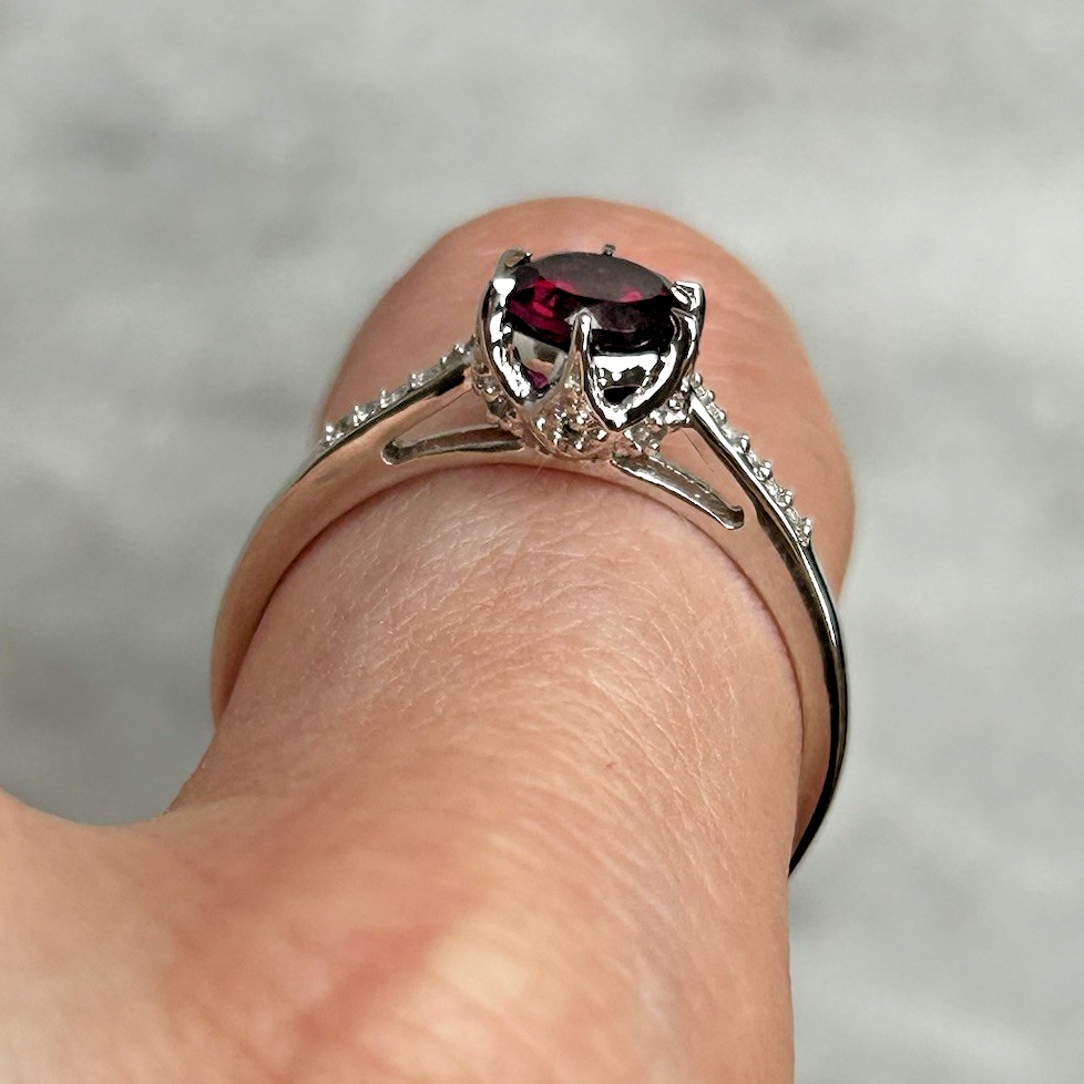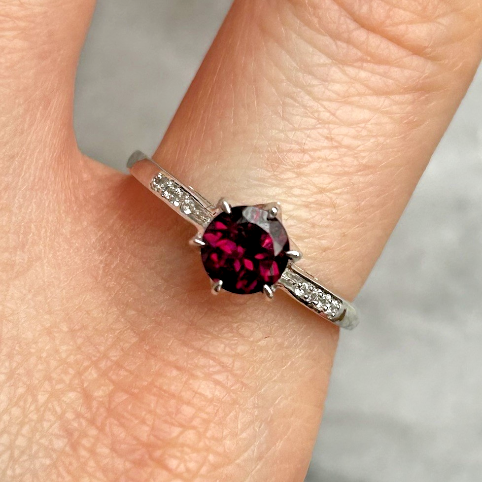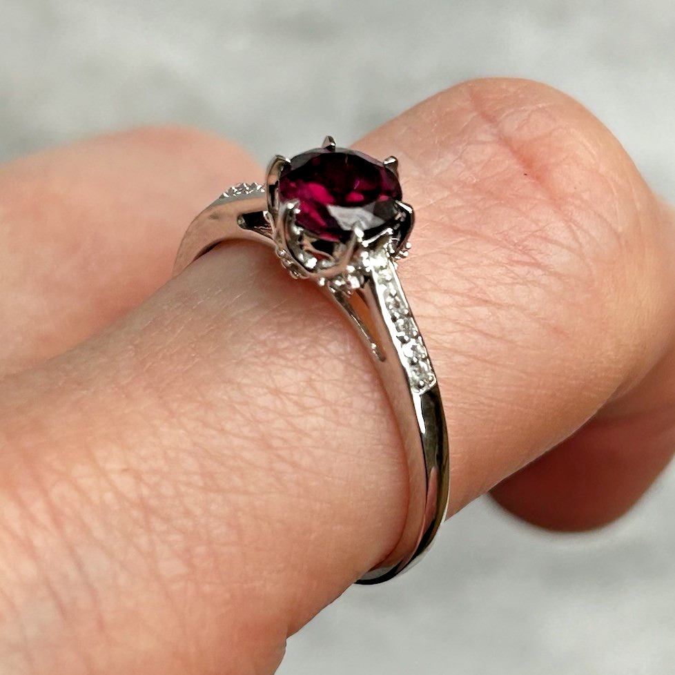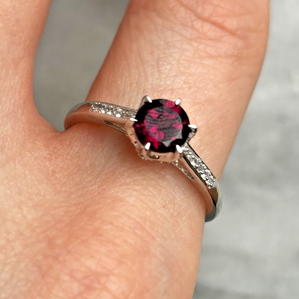 A gorgeous white gold ring showcasing a round cut rhodolite garnet, upon white zircon adorned shoulders.