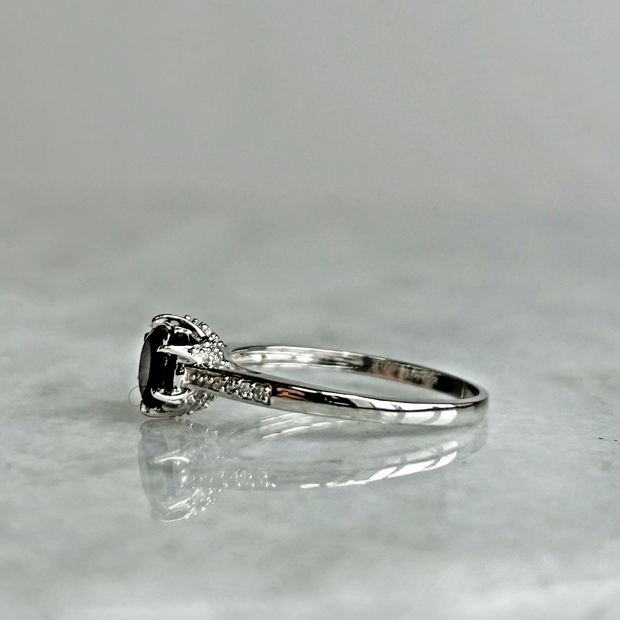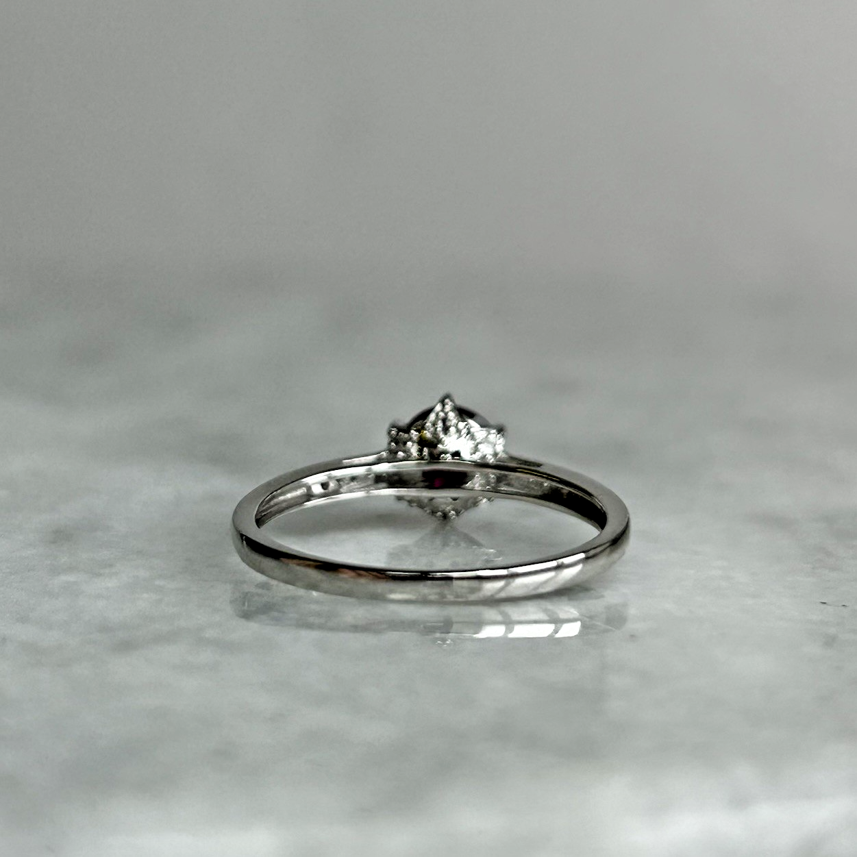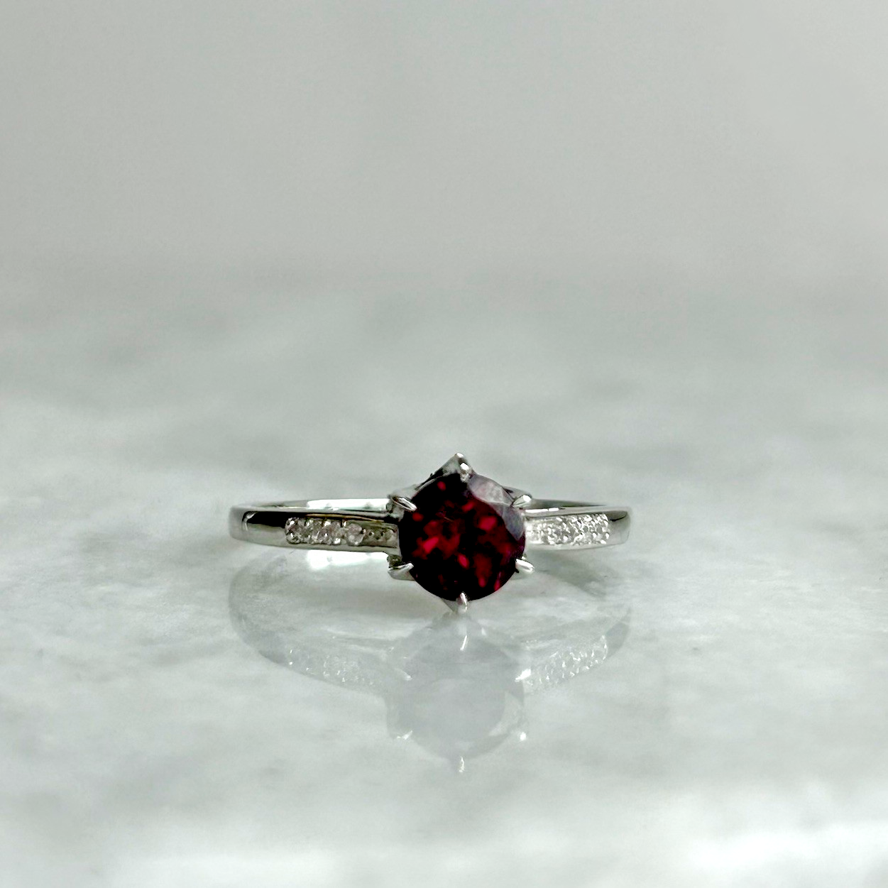 A gorgeous white gold ring showcasing a round cut rhodolite garnet, upon white zircon adorned shoulders.