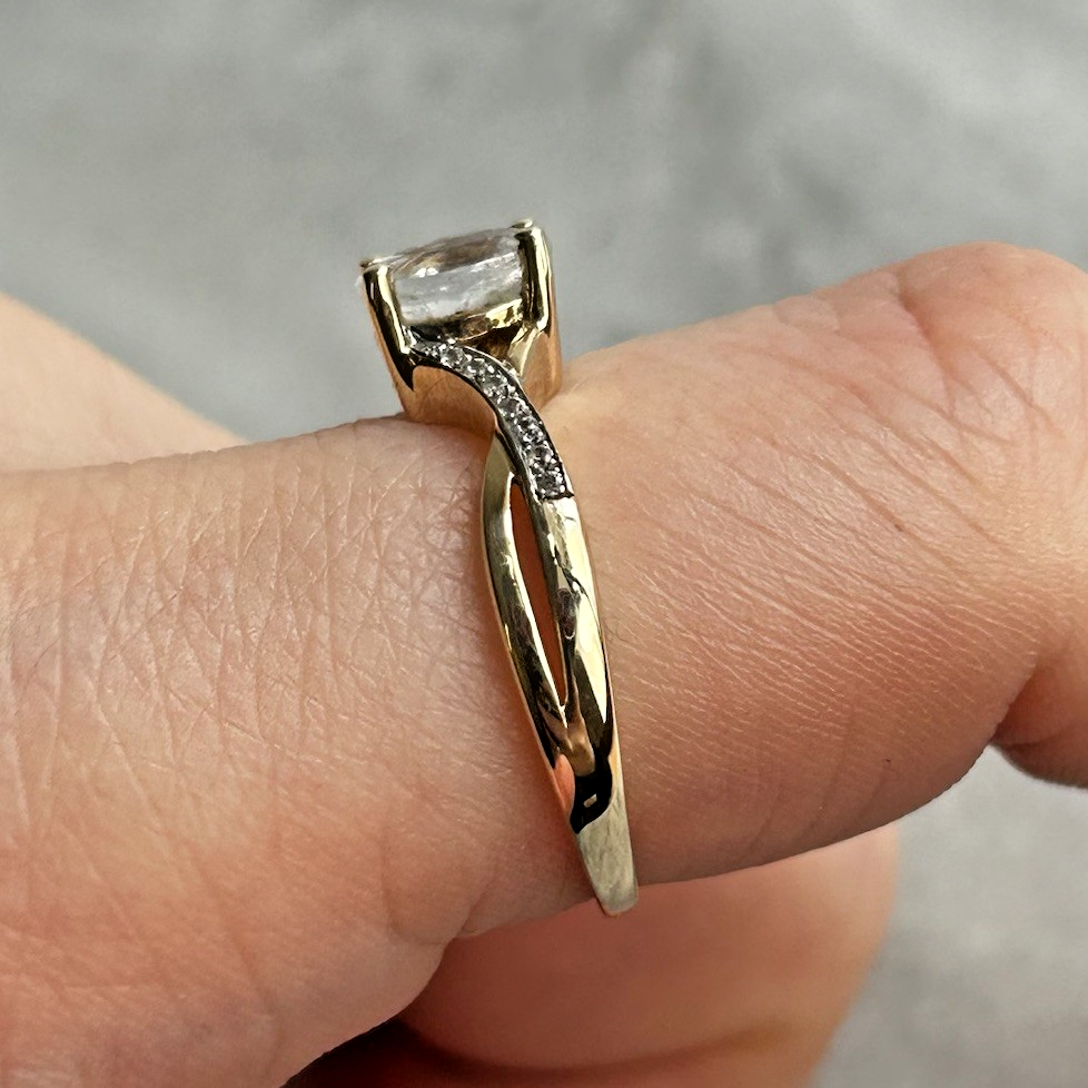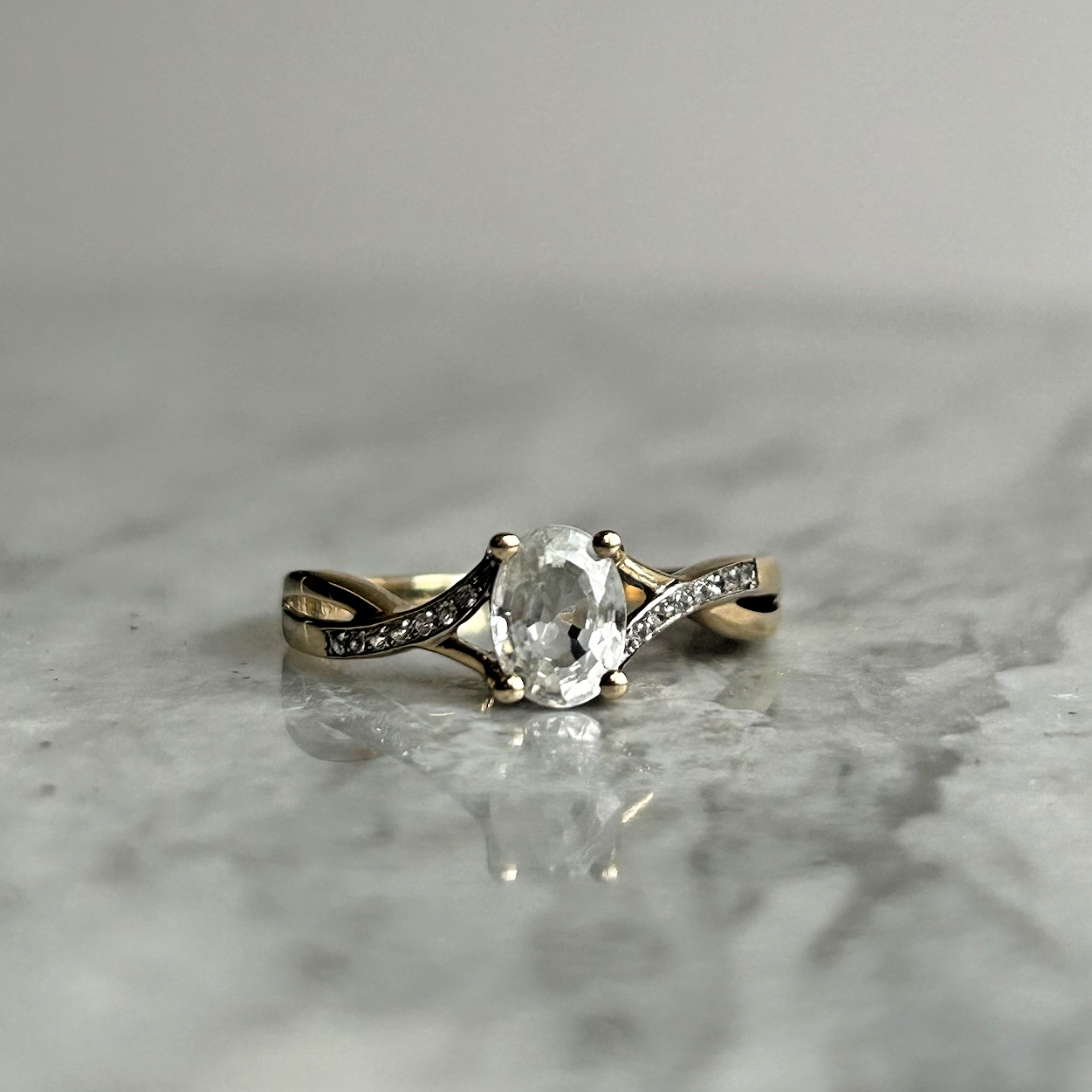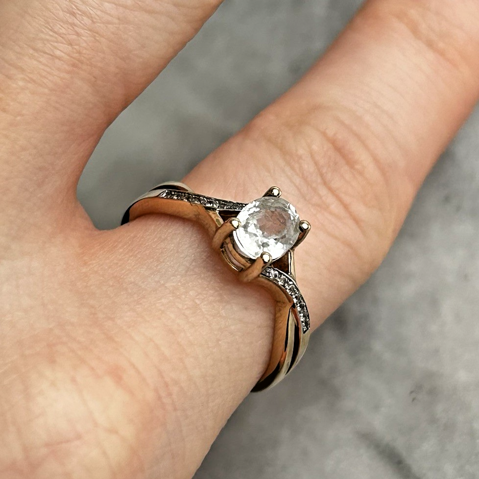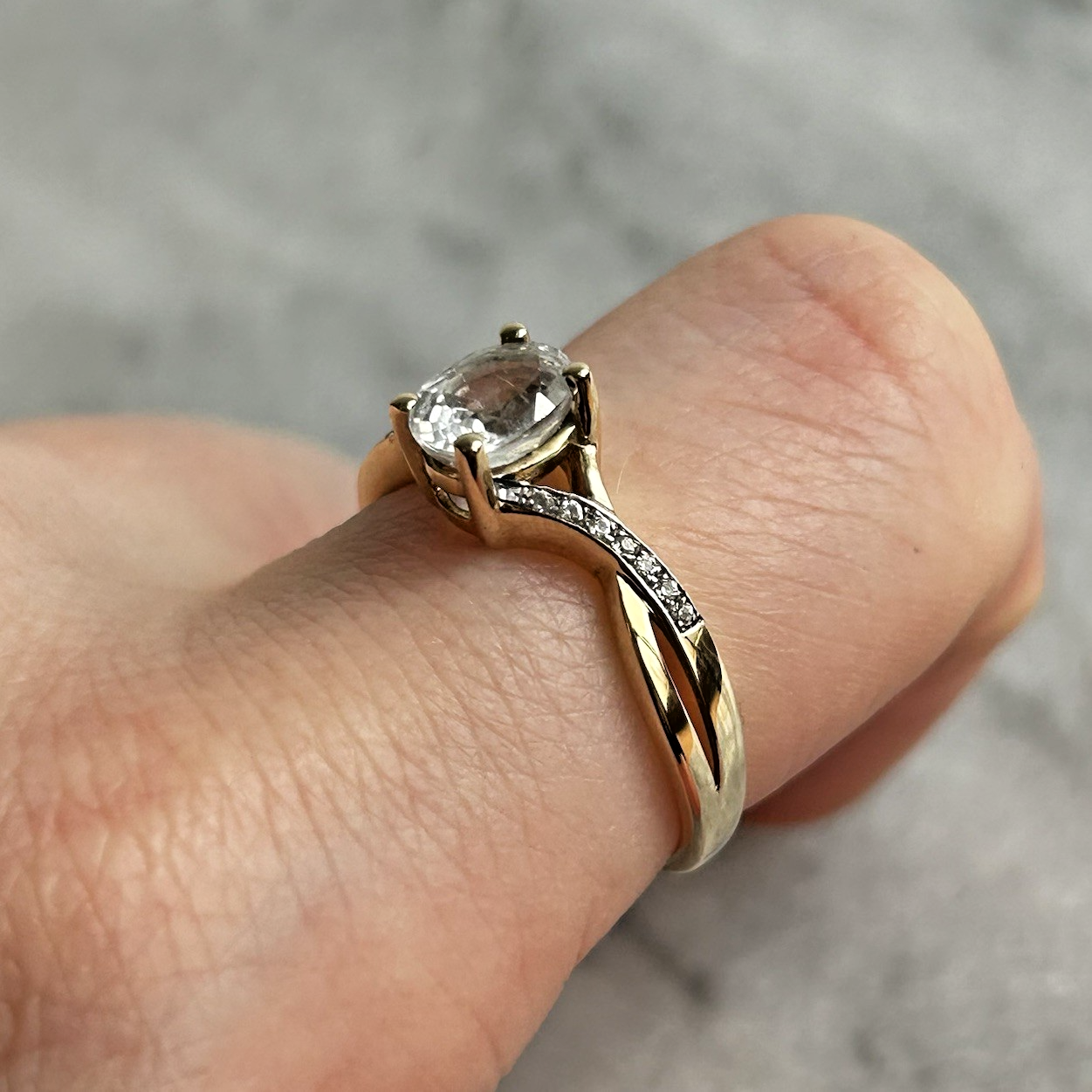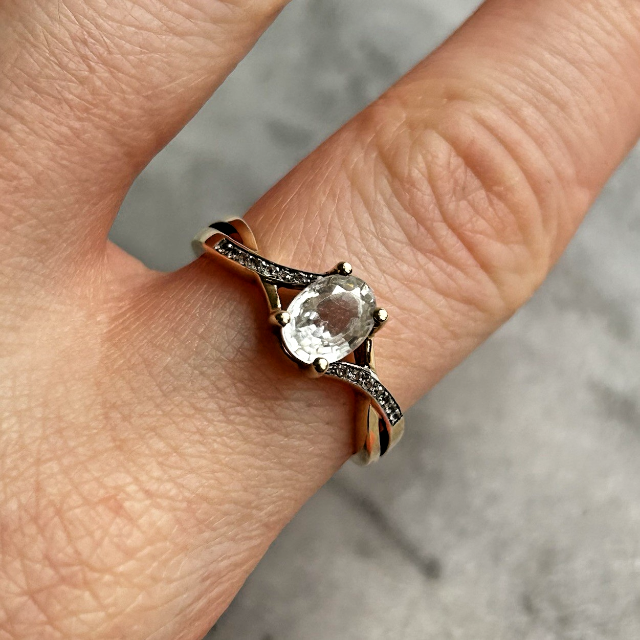 A beautiful gold twisted crossover style ring showcasing an oval cut white topaz, accented by petite cubic zirconia gemstones on the shoulders.