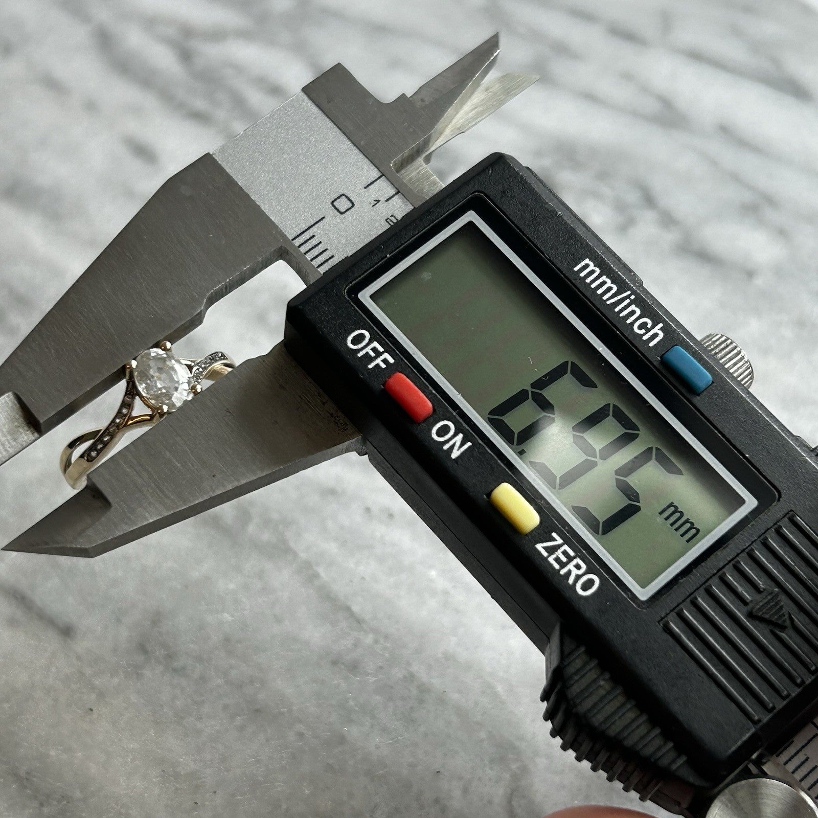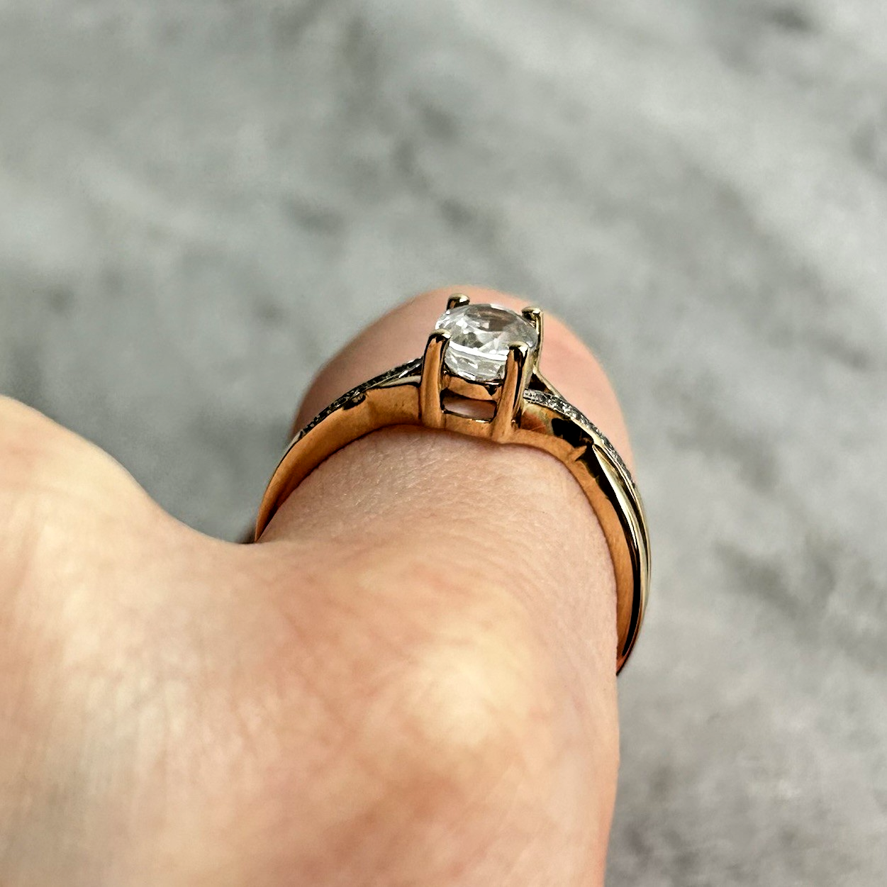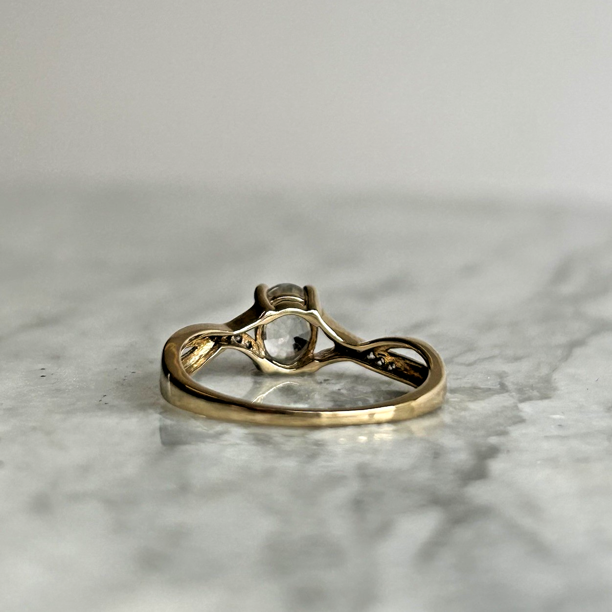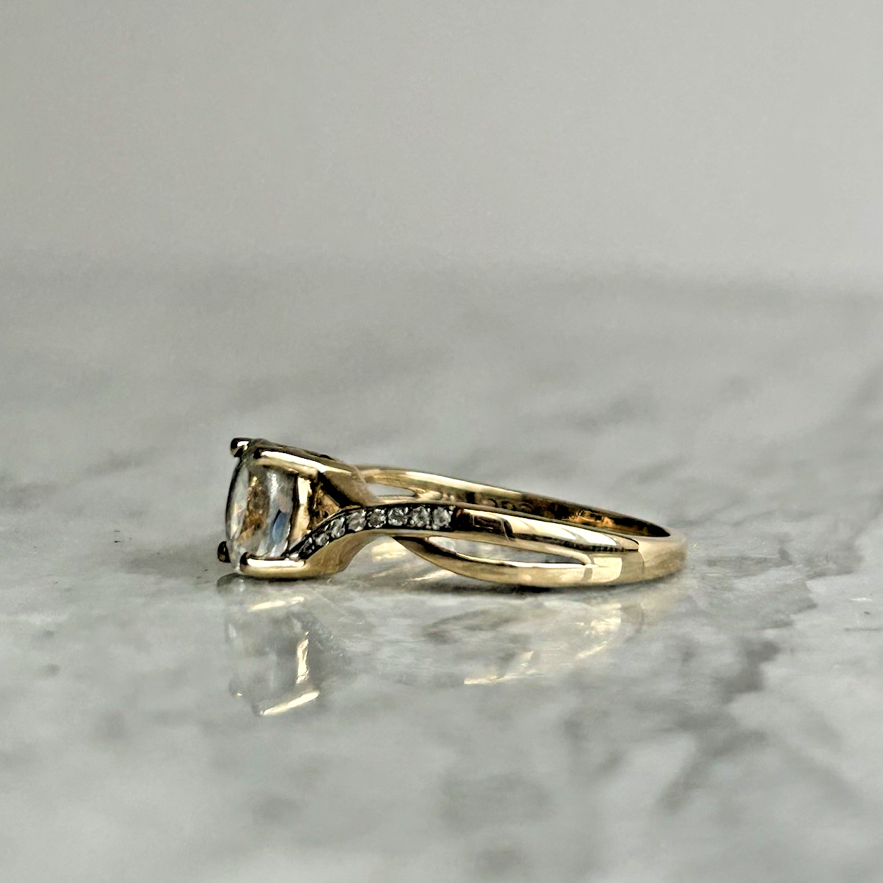 A beautiful gold twisted crossover style ring showcasing an oval cut white topaz, accented by petite cubic zirconia gemstones on the shoulders.