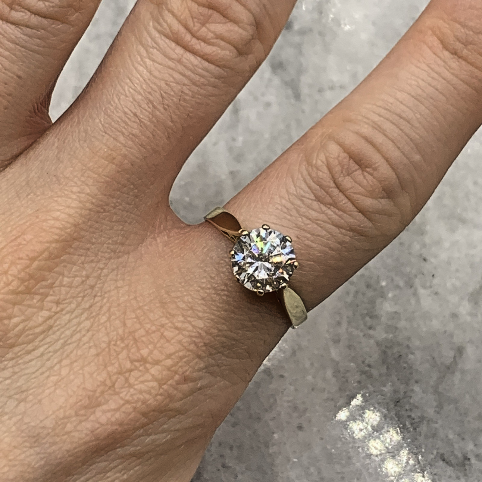 A stunning gold ring featuring an ornate round cut cubic zirconia gemstone.