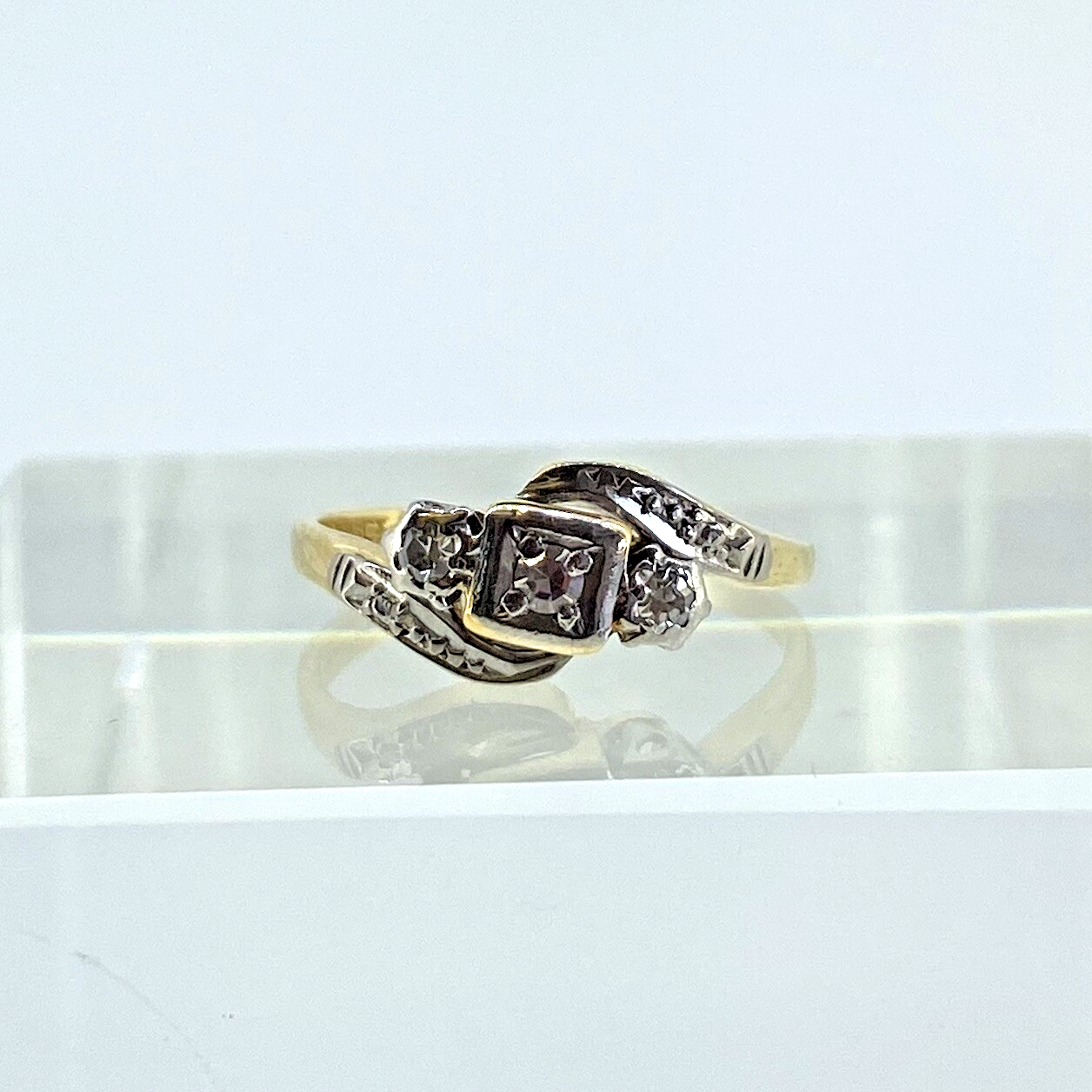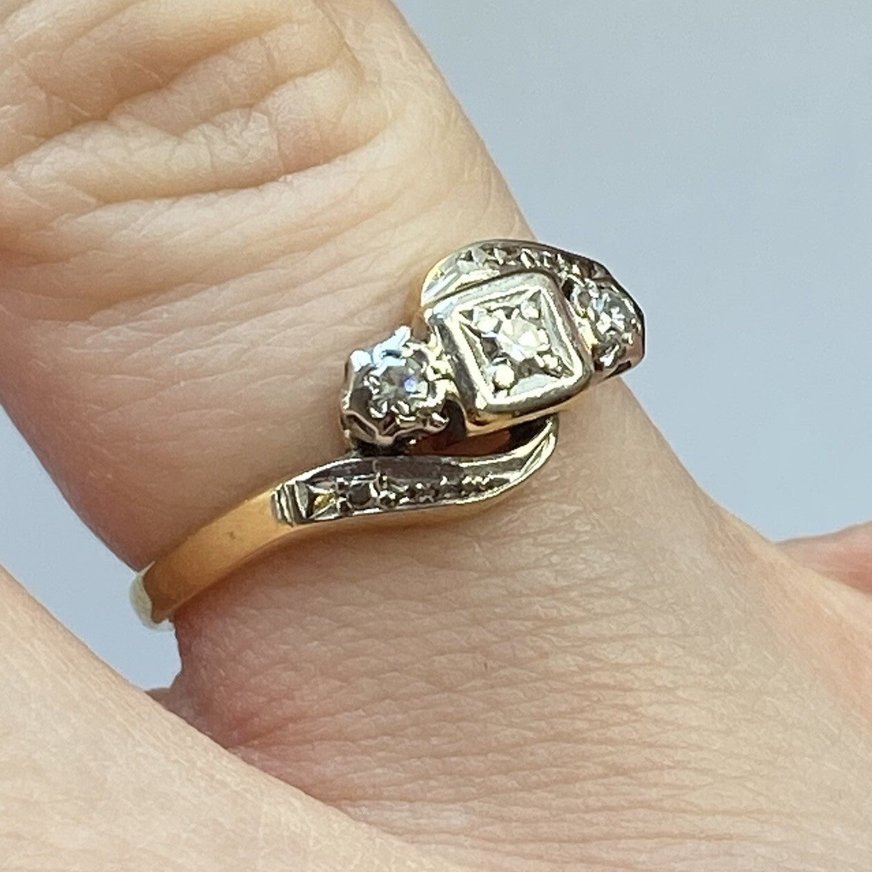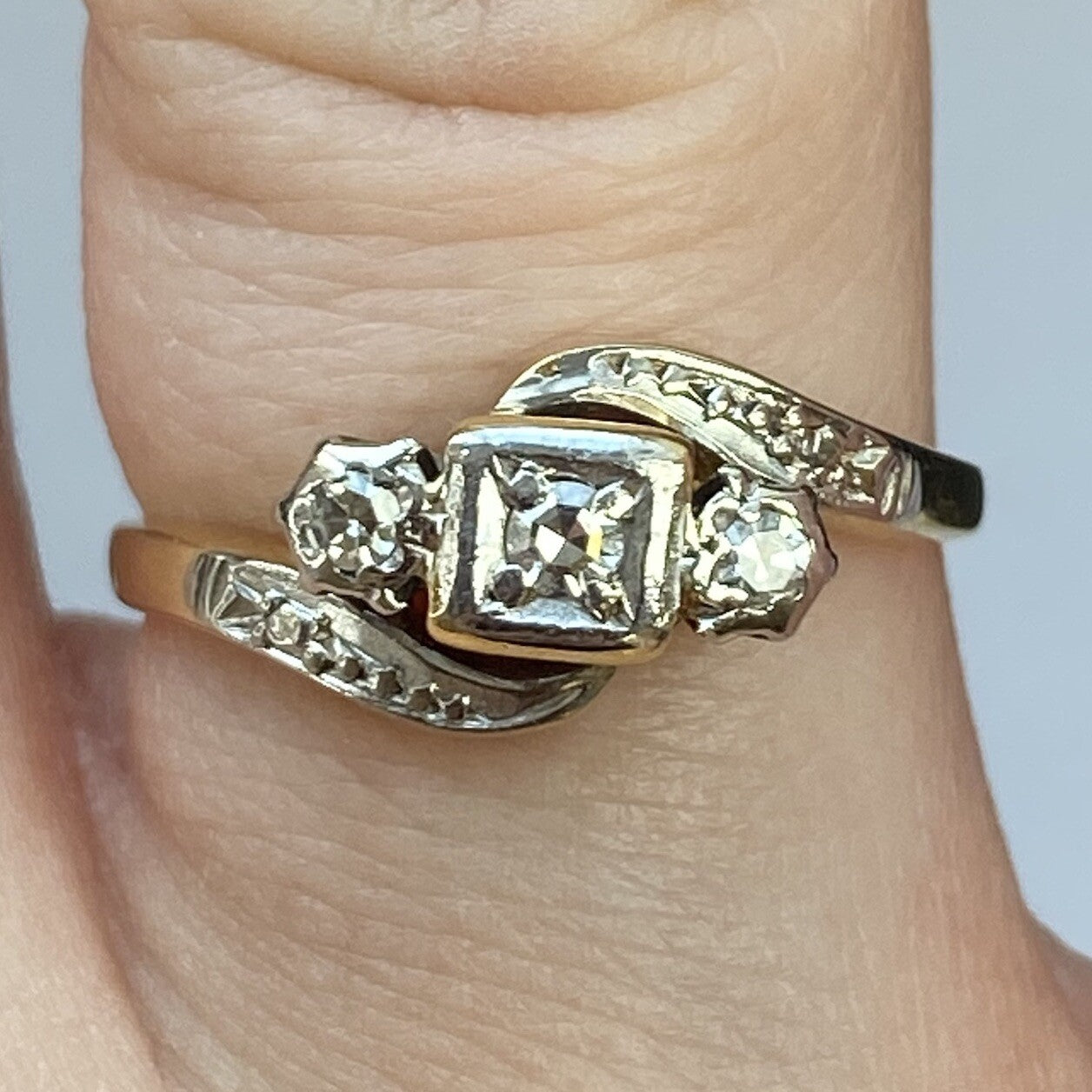 A gorgeous gold antique art deco style ring featuring a trilogy of platinum set diamonds in a bypass formation. All stones natural. Diamonds approx. .20ct combined.
