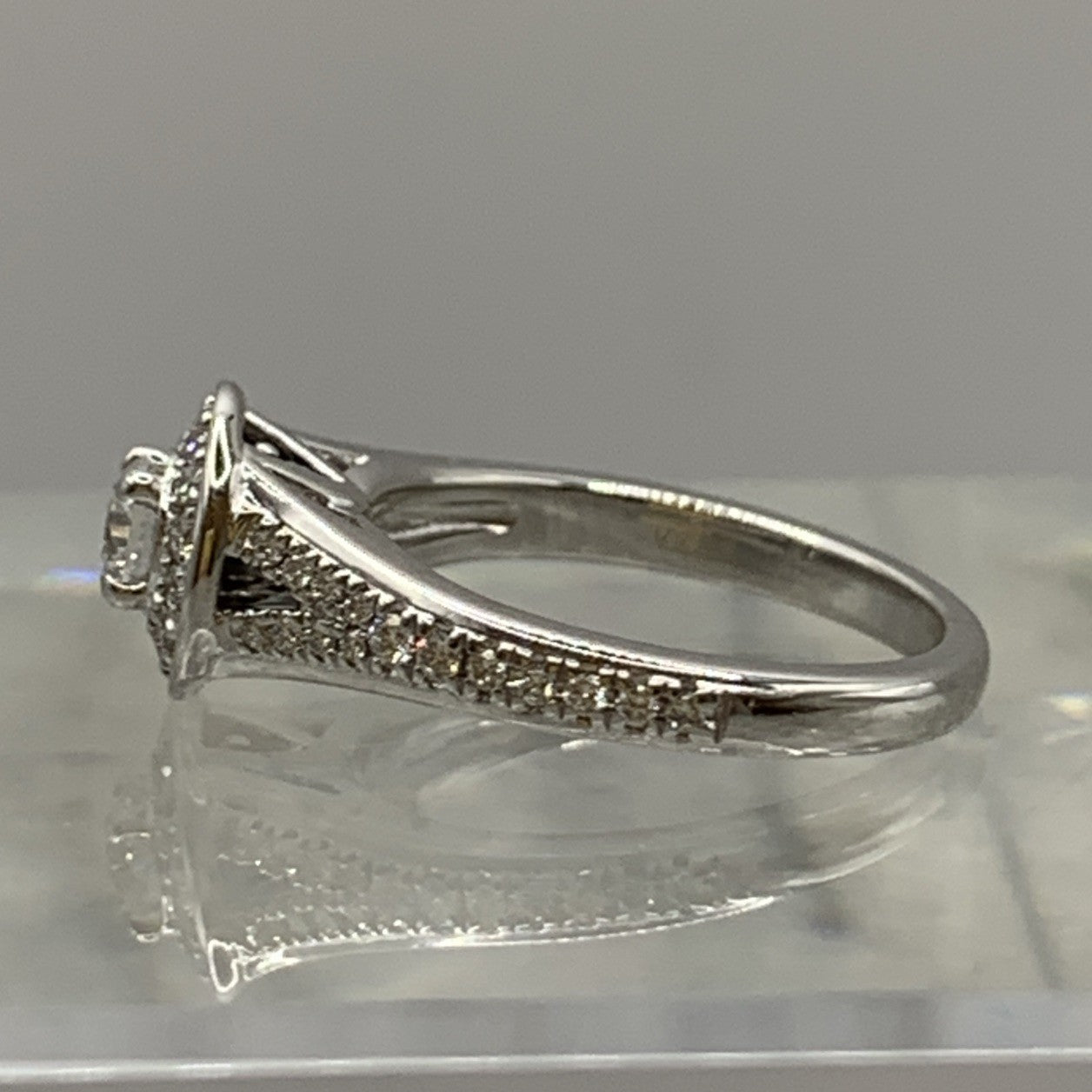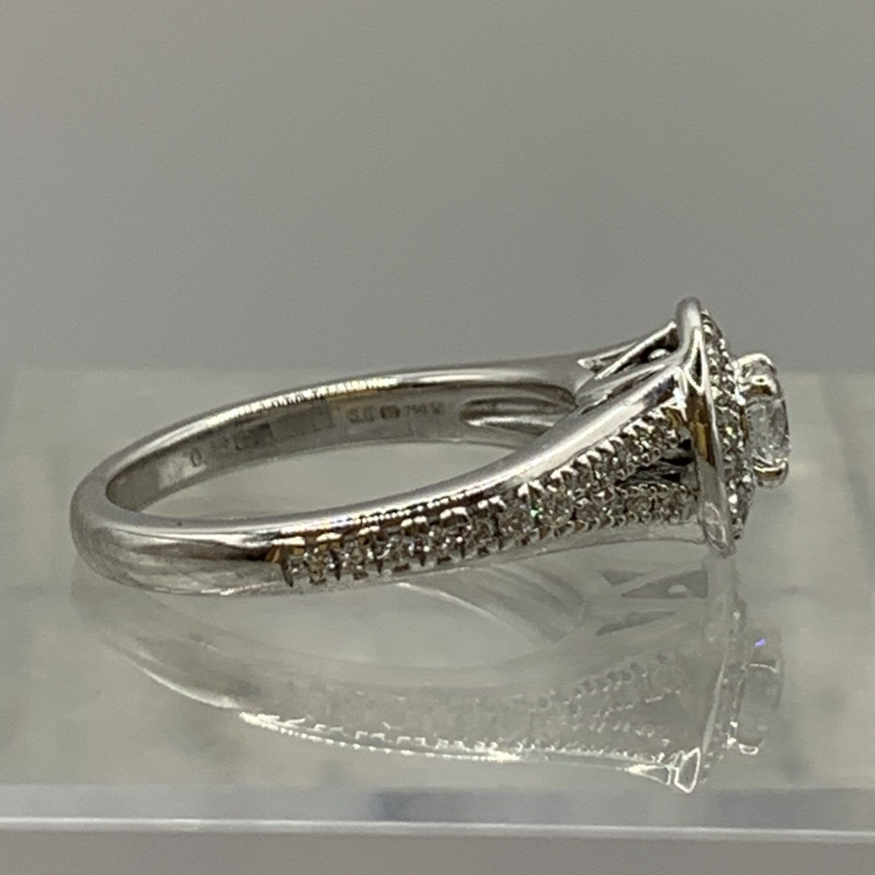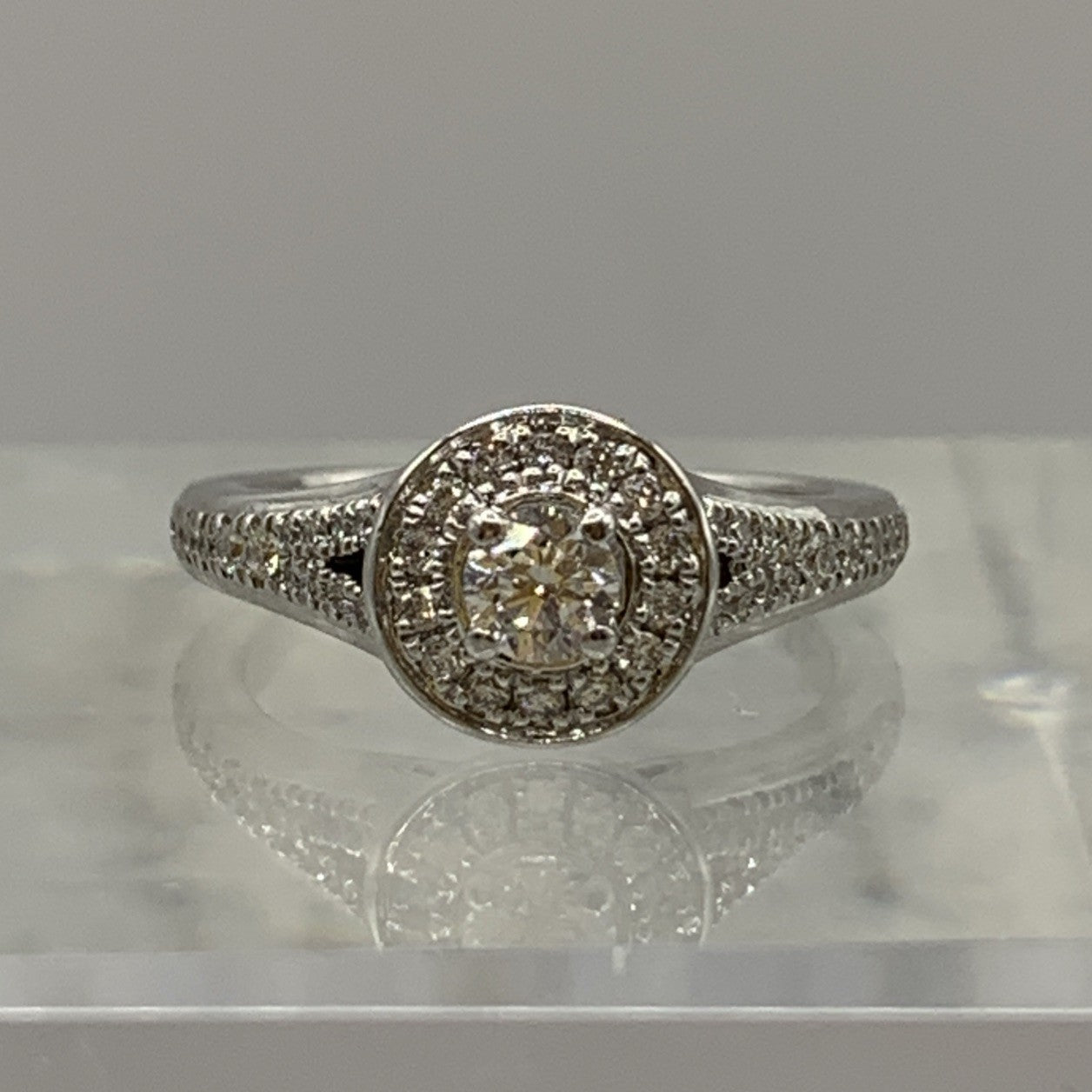 A stunning 18ct white gold ring showcasing a round cut diamond accented by a halo of additional petite diamond, extending onto the shoulders, as a whole amounting to .45ct.