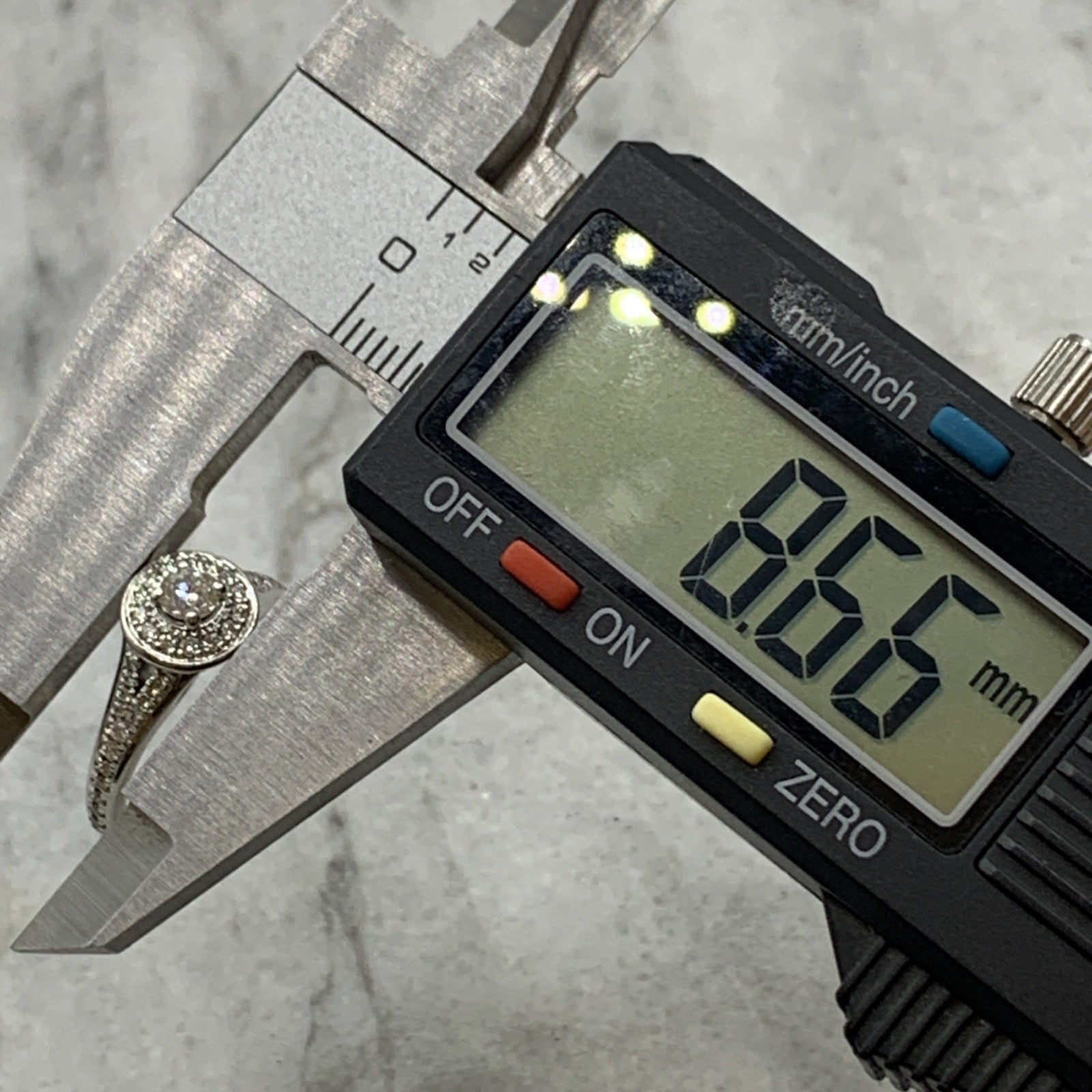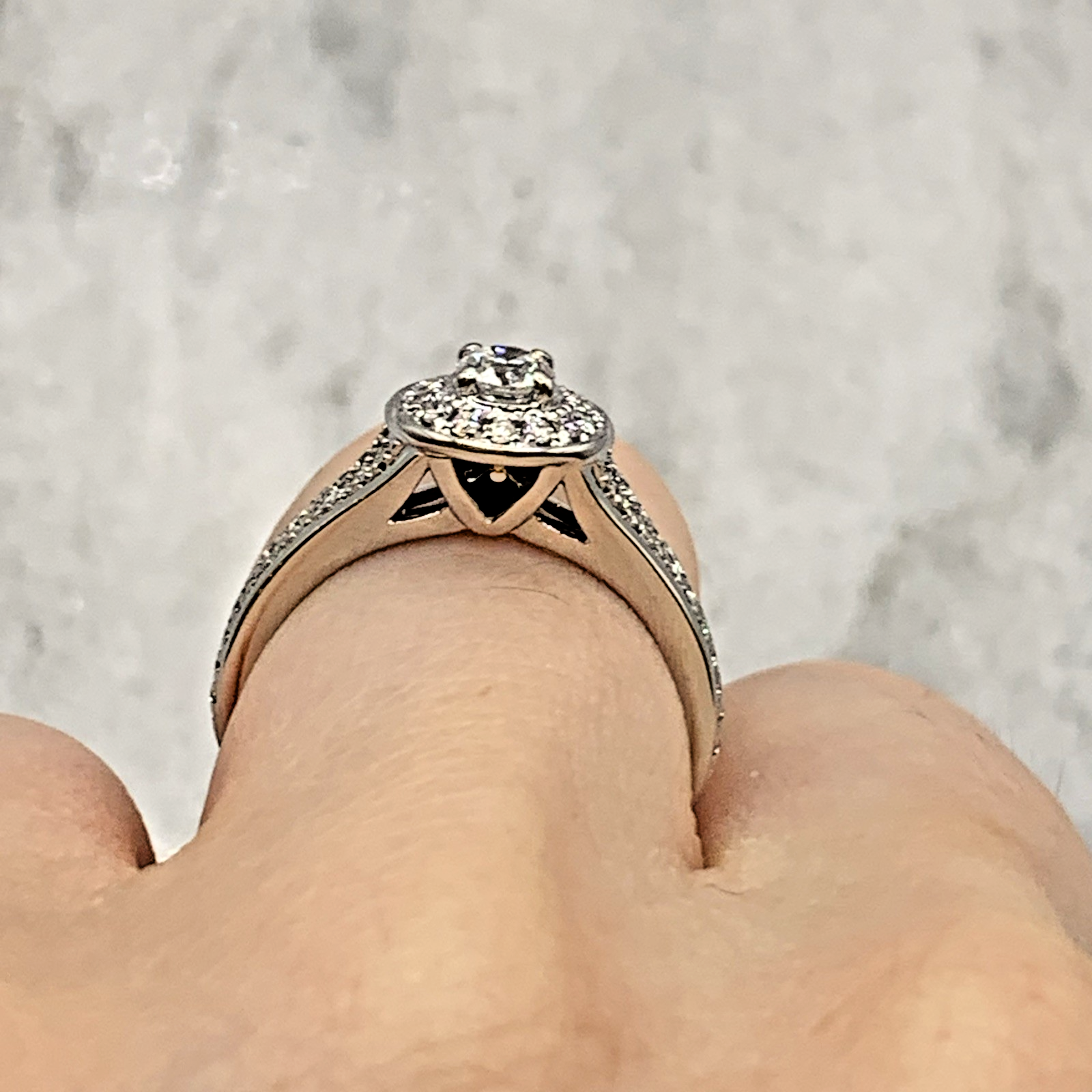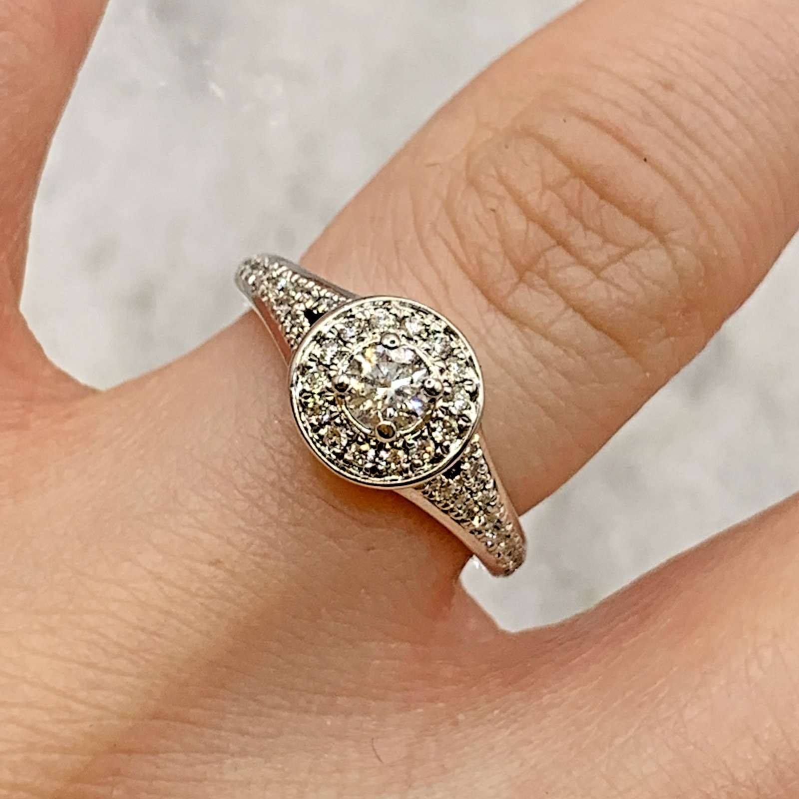 A stunning 18ct white gold ring showcasing a round cut diamond accented by a halo of additional petite diamond, extending onto the shoulders, as a whole amounting to .45ct.