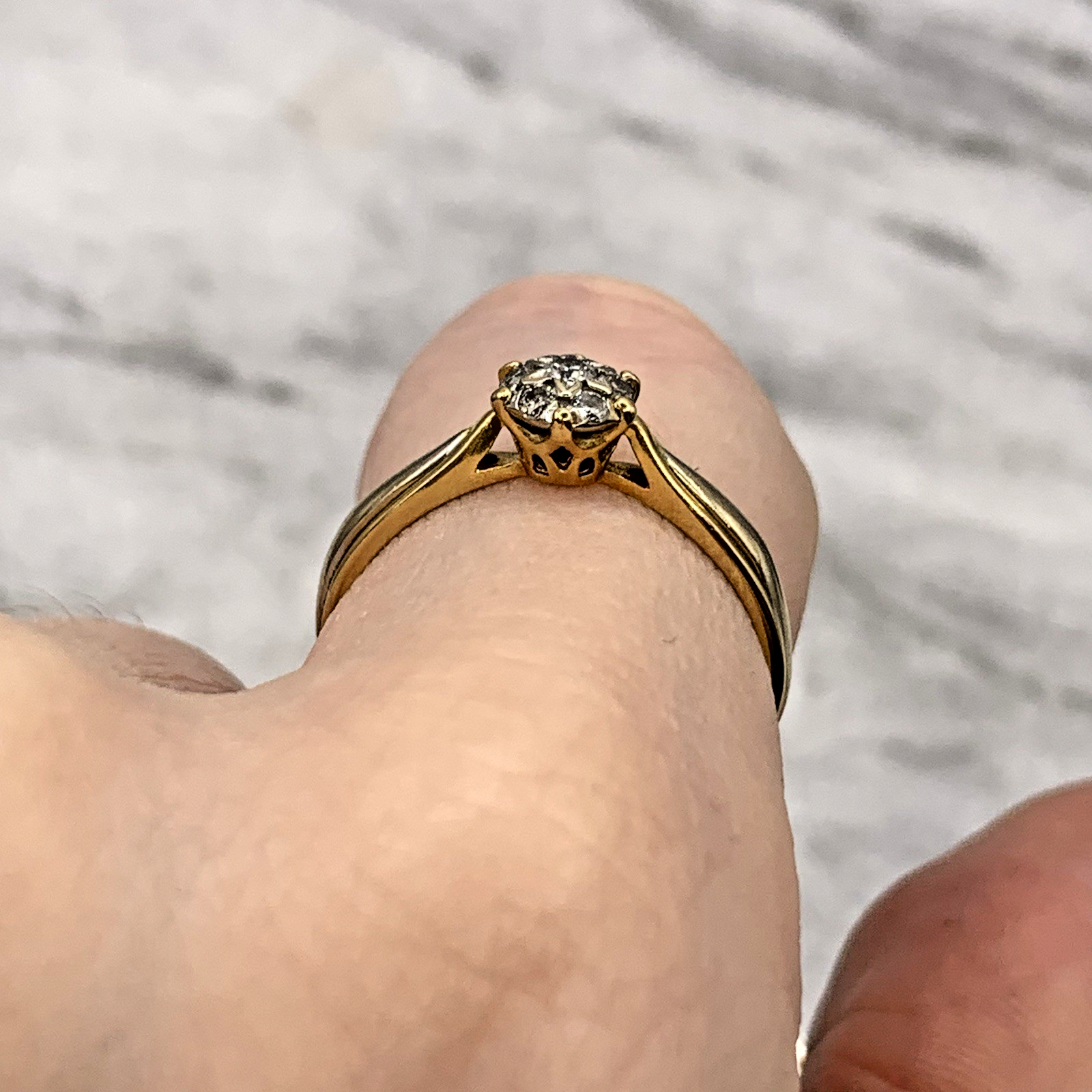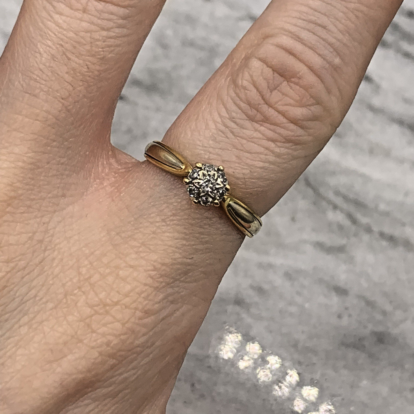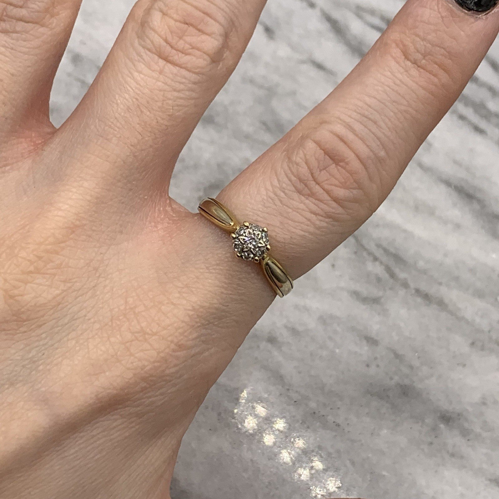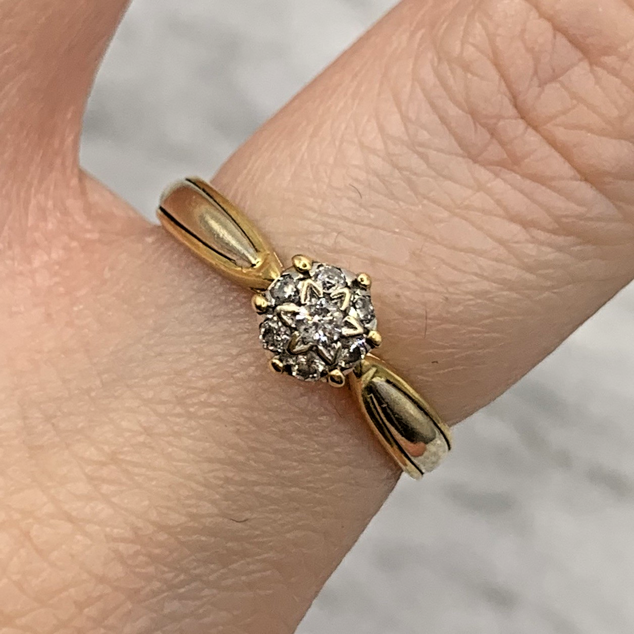 A beautiful gold ring featuring a cluster of diamonds at 0.15ct. All stones natural. A timeless piece from circa 1976.