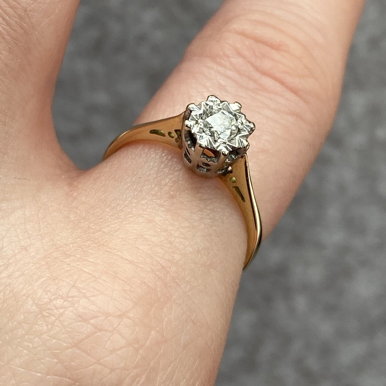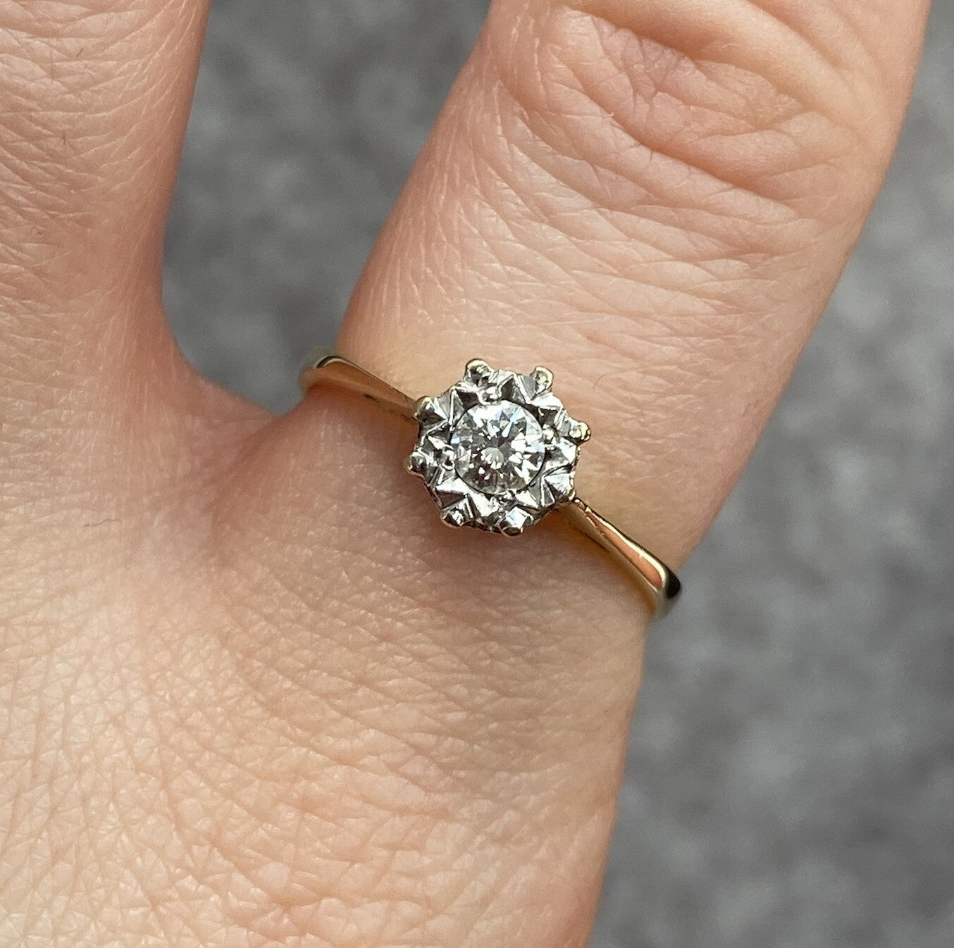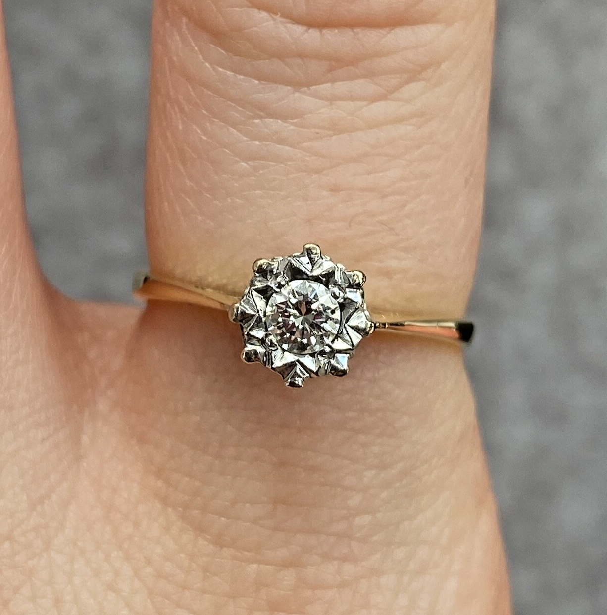 A charming gold solitaire ring featuring a single round cut diamond 0.14ctw in an illusion setting.