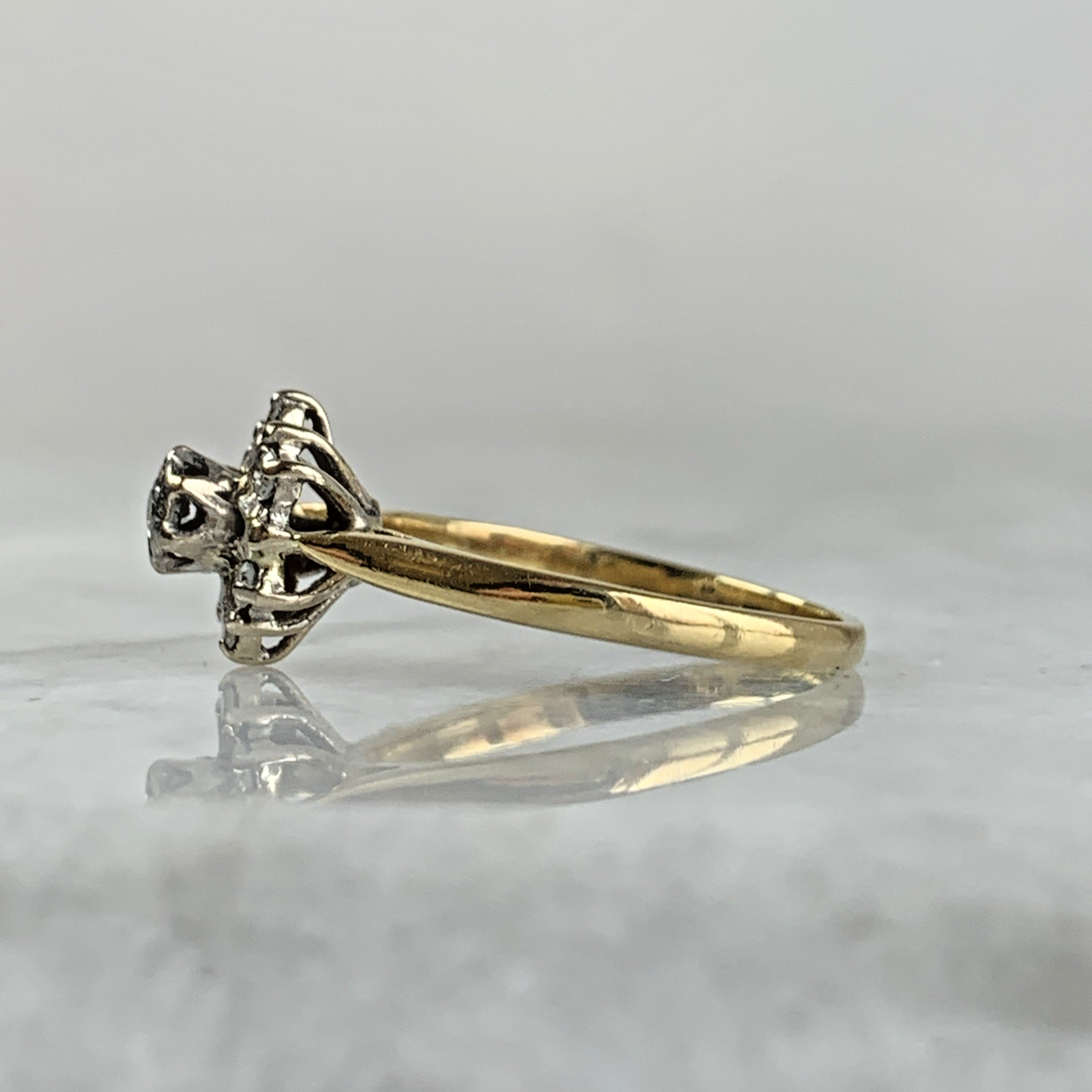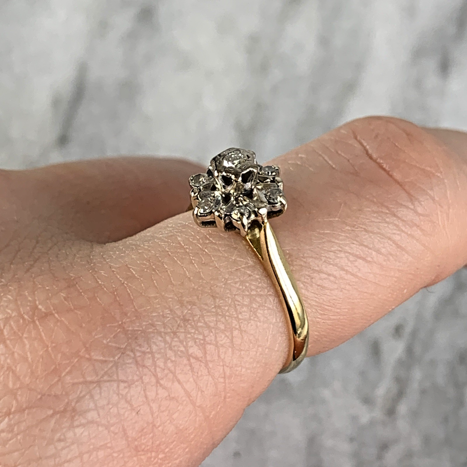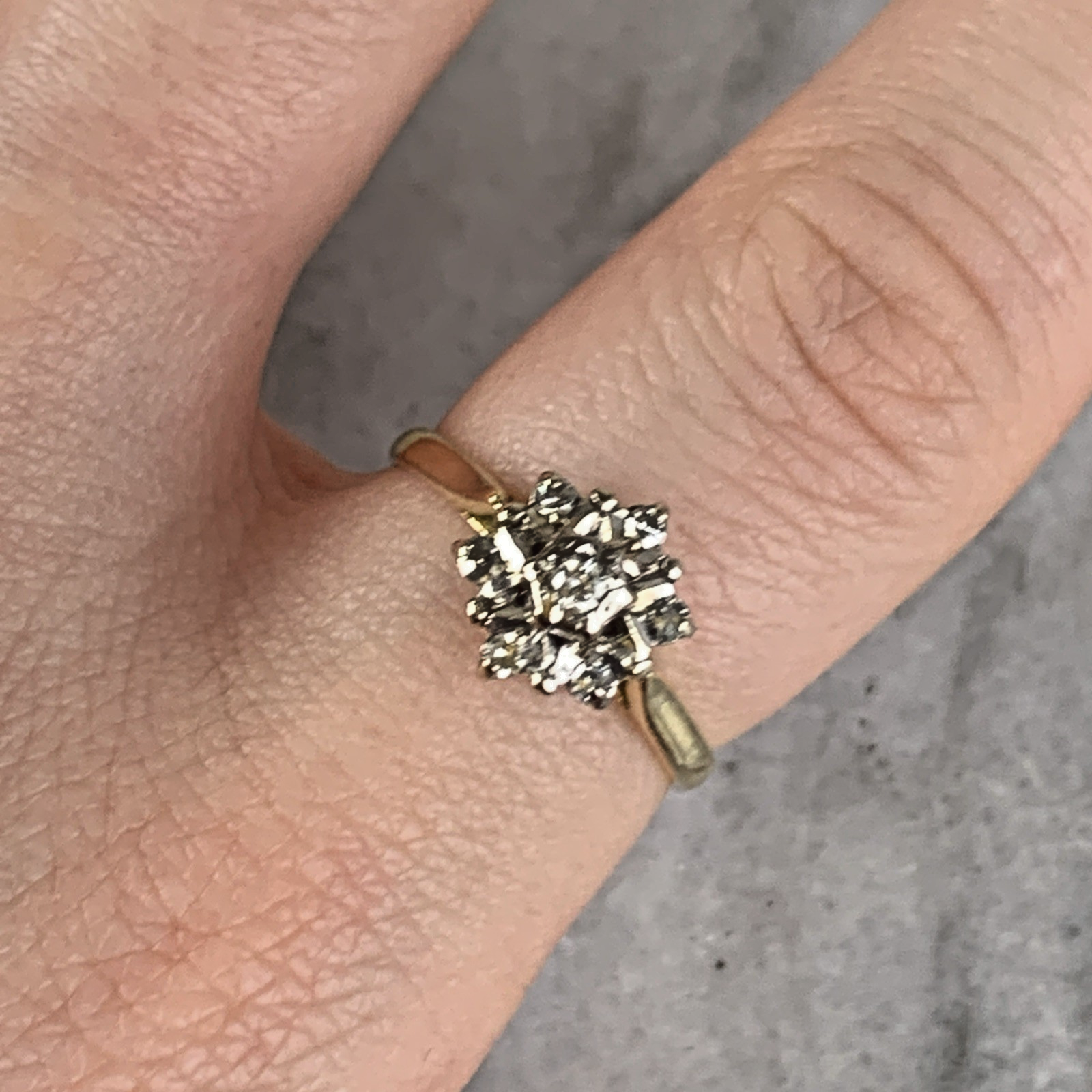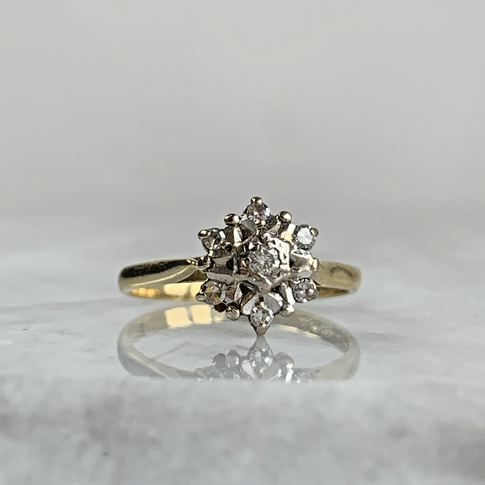 A lovely gold ring showcasing a tiered daisy flower style cluster of illusion set diamonds.