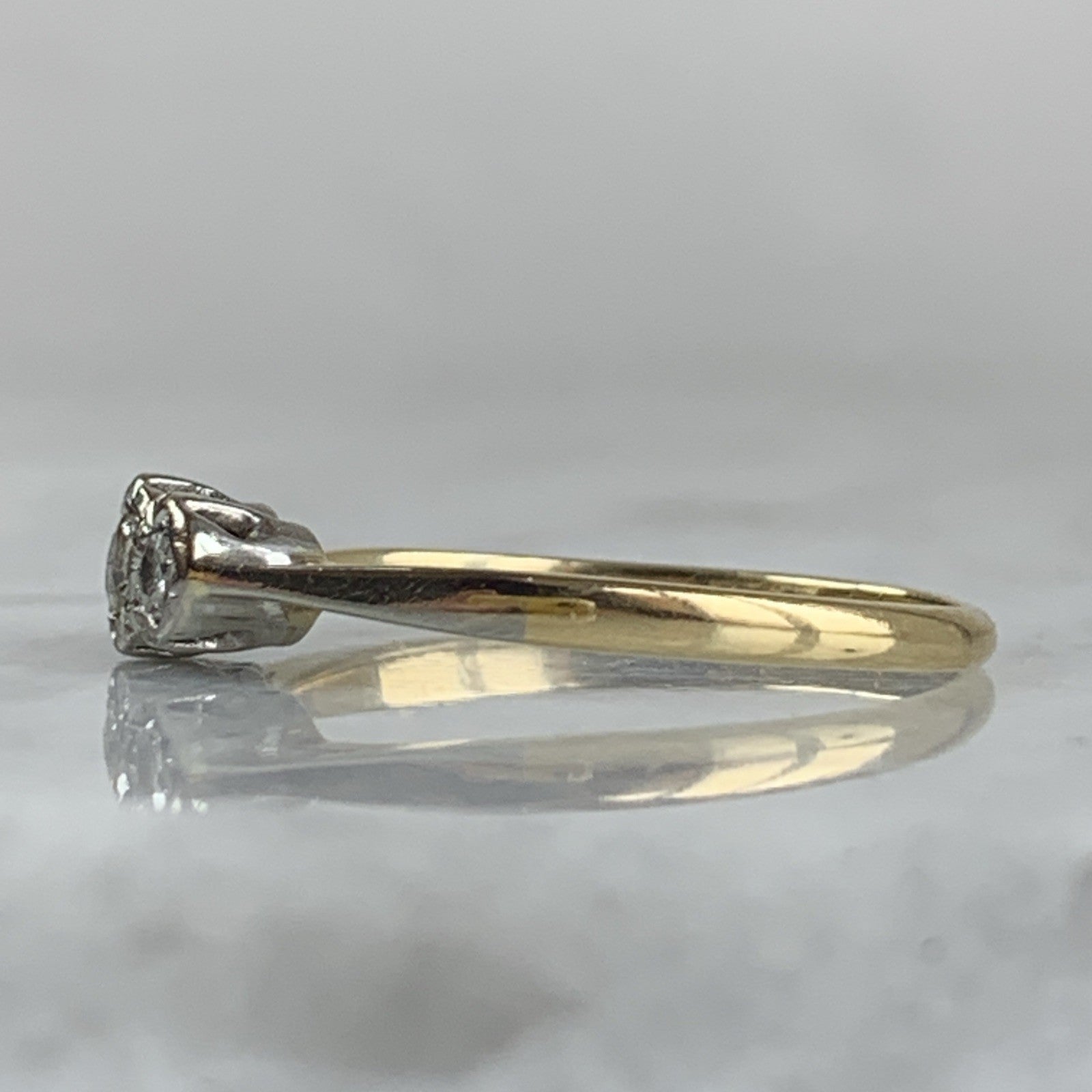 A beautiful gold ring featuring a trilogy of round cut diamonds in a platinum setting.