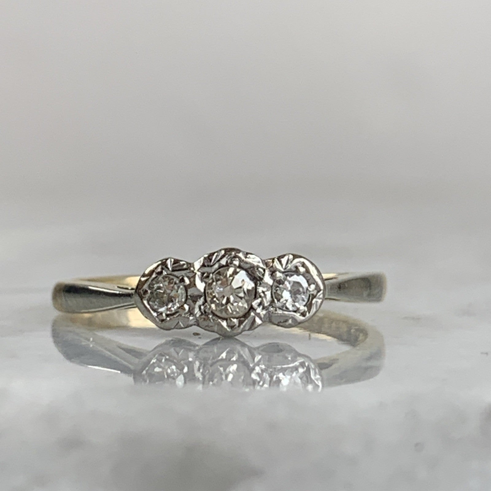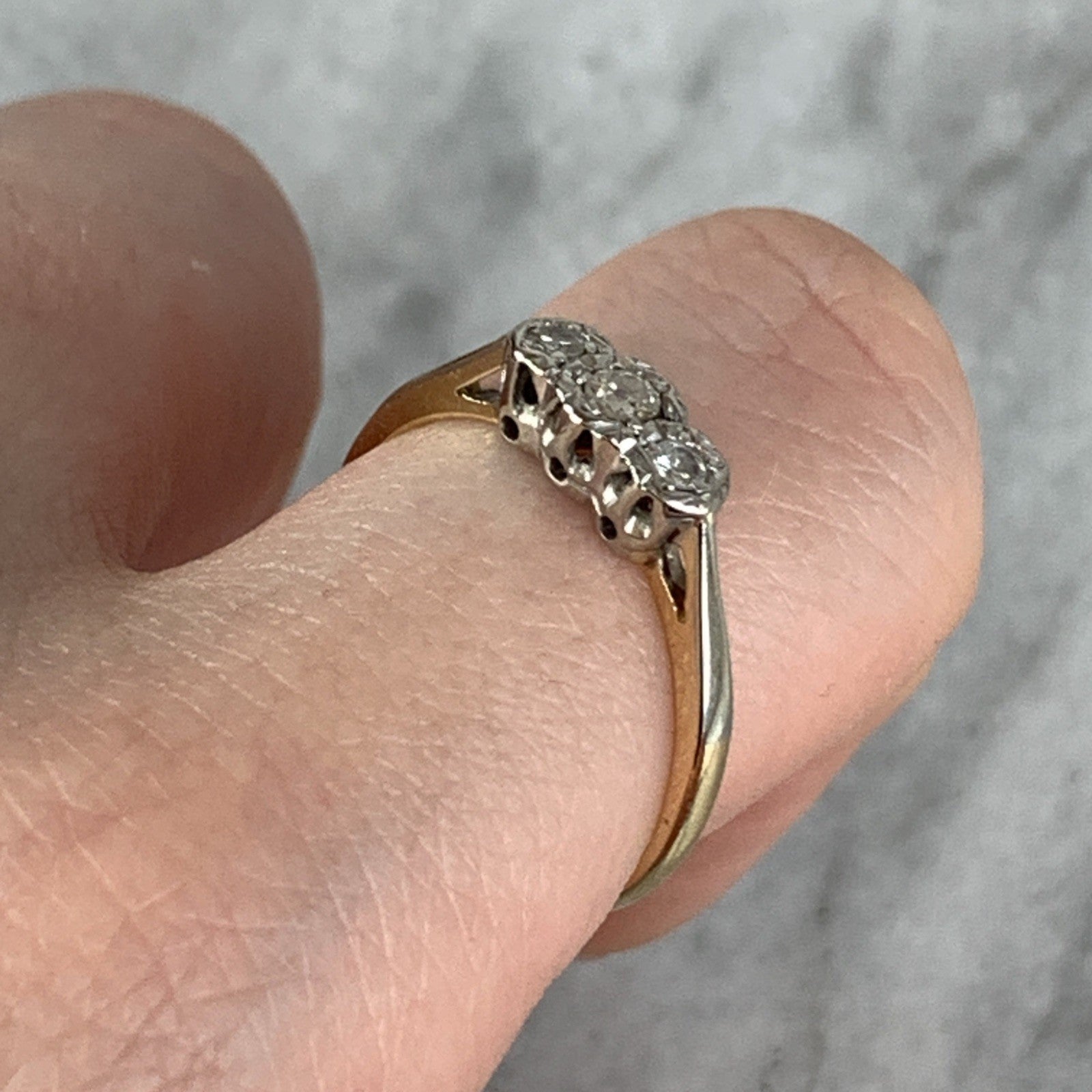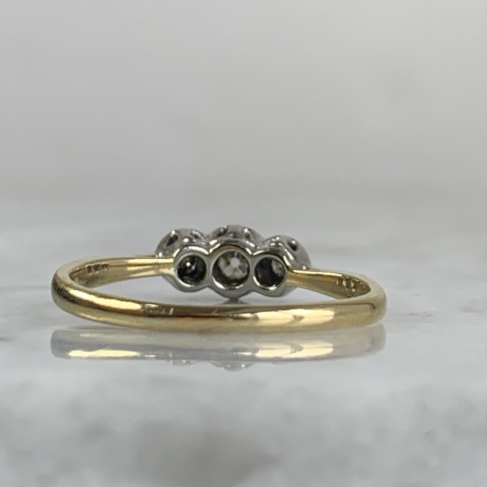 18 ct Gold Diamond Ring Trilogy Platinum Set in 750 Yellow Gold - Size P