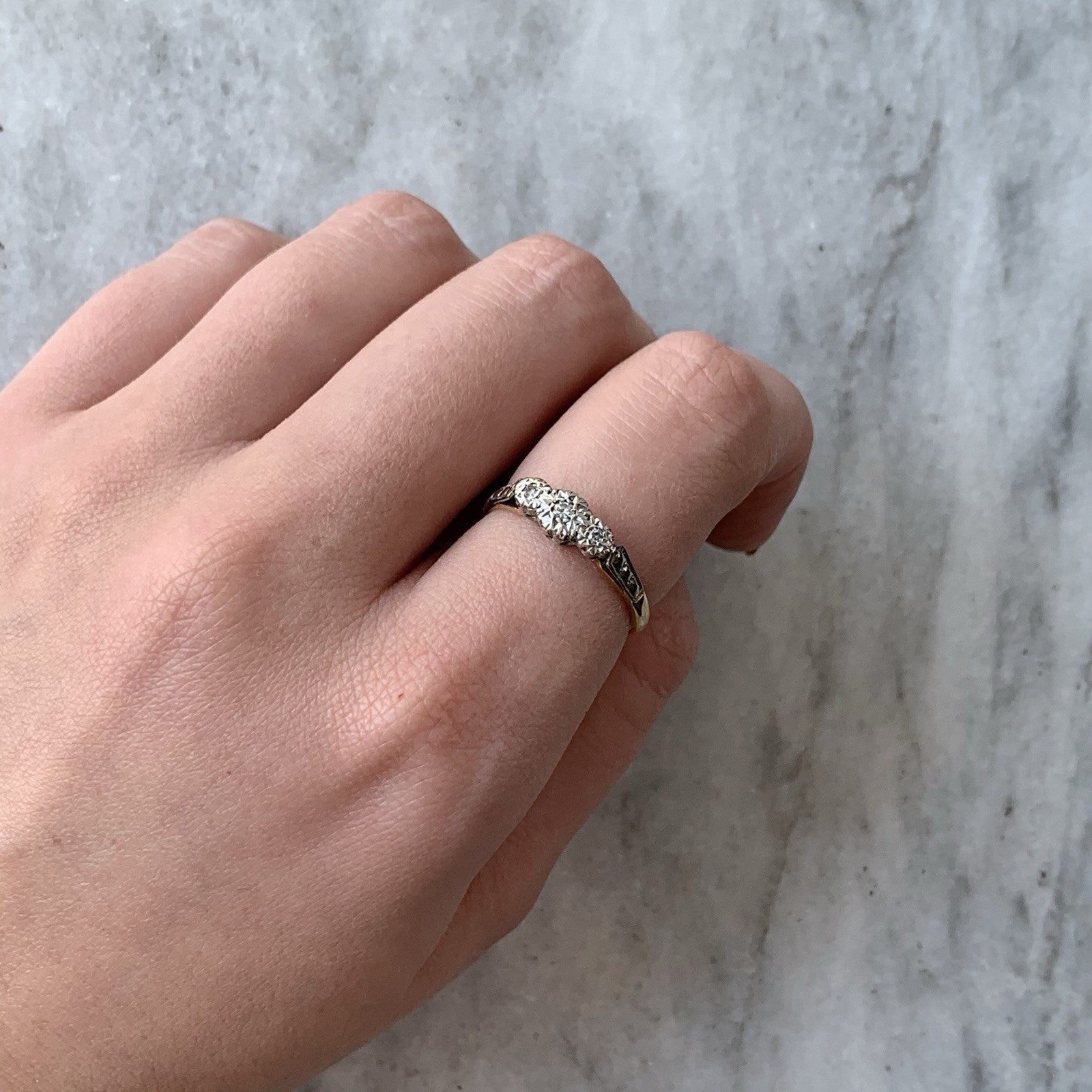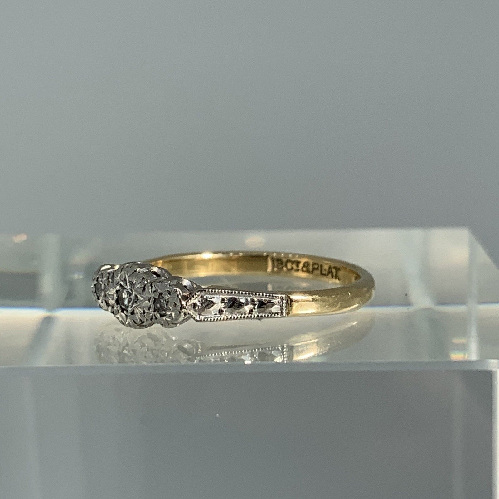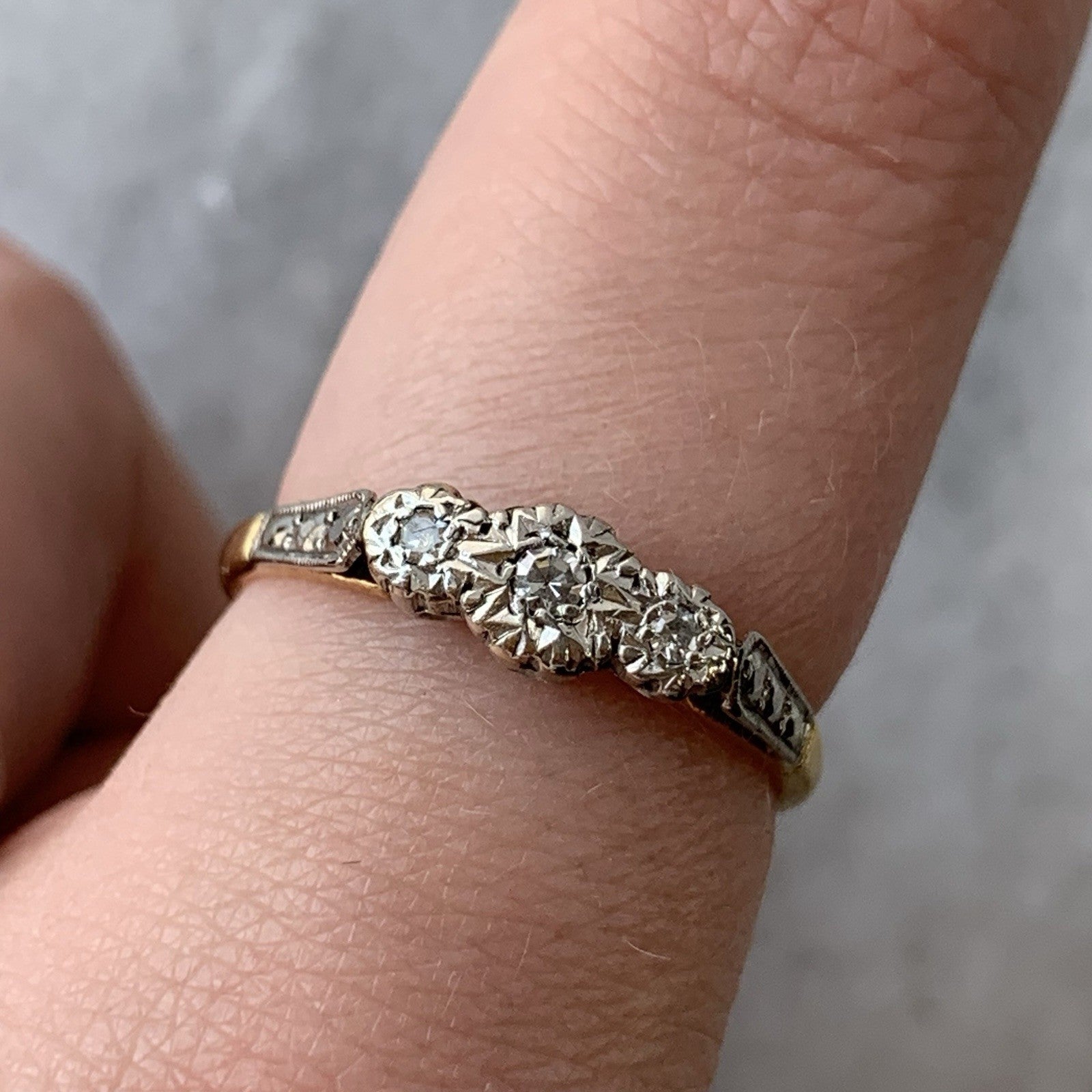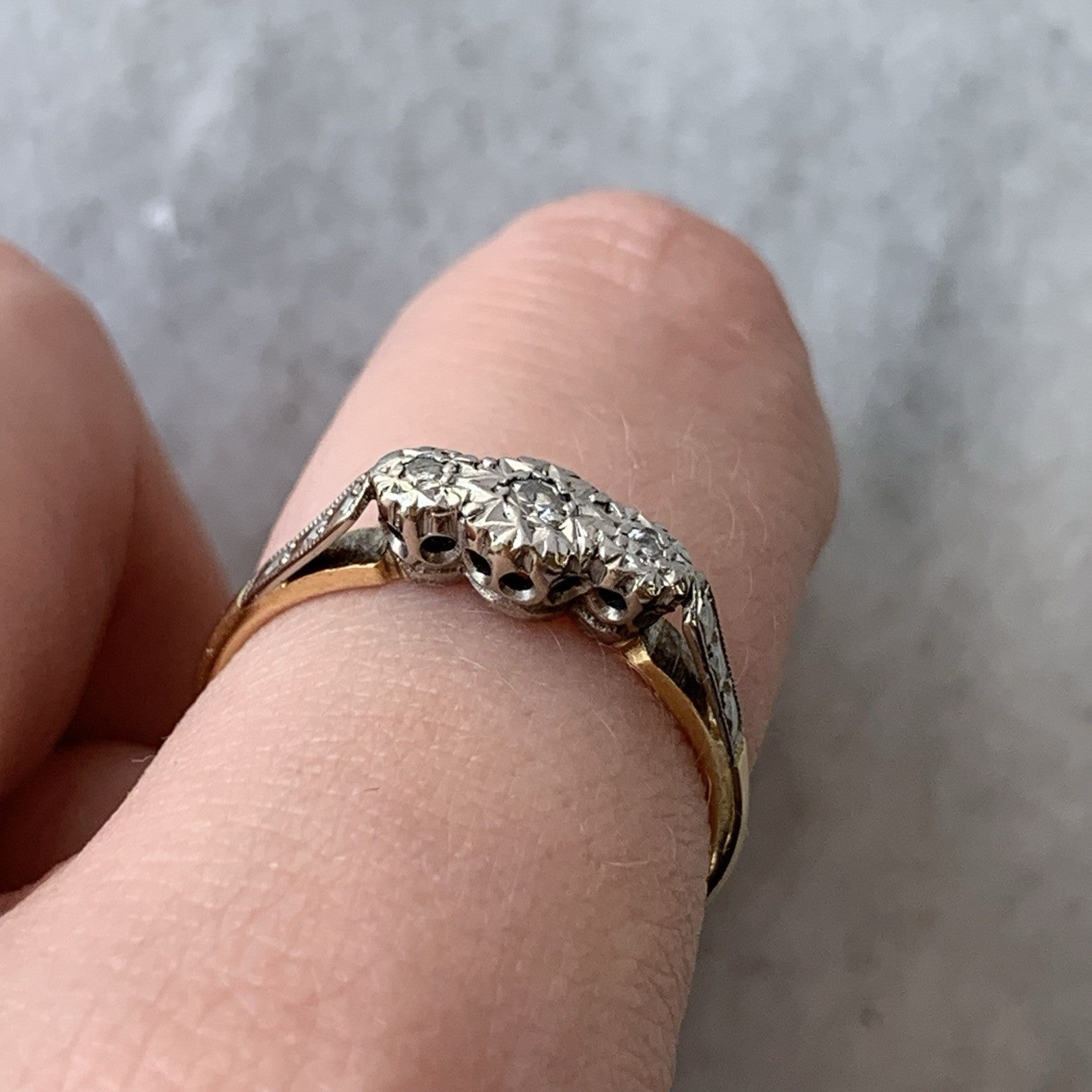 A beautiful antique ring featuring a trilogy of diamonds in a platinum setting.