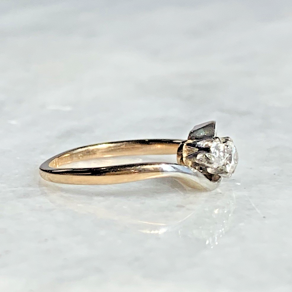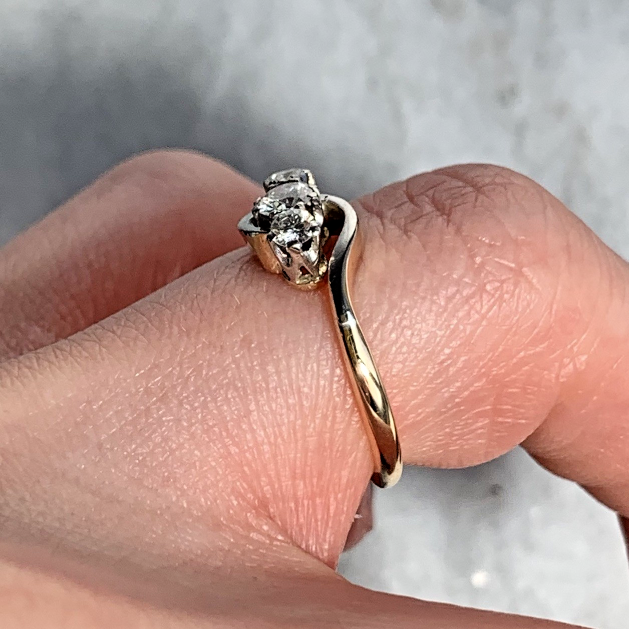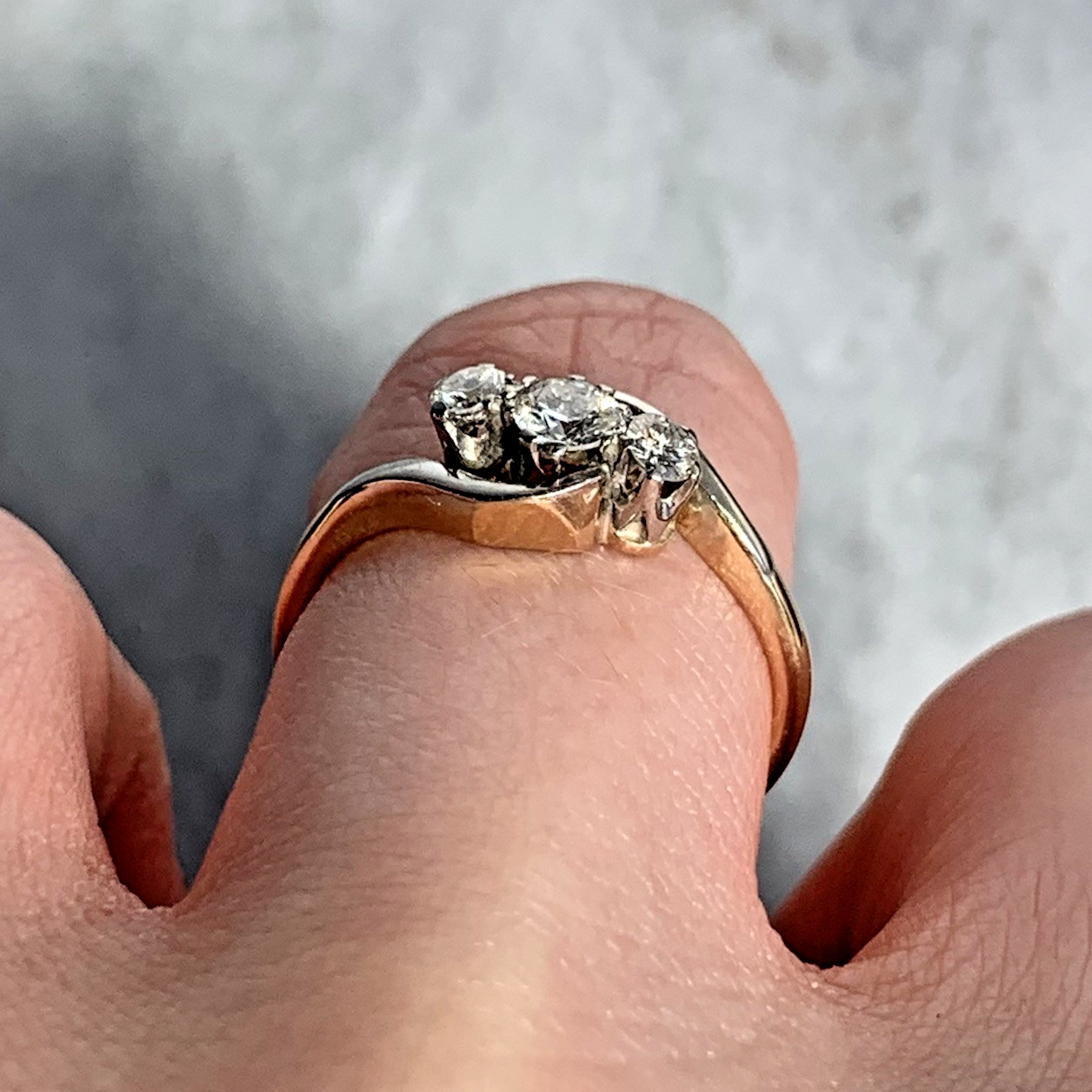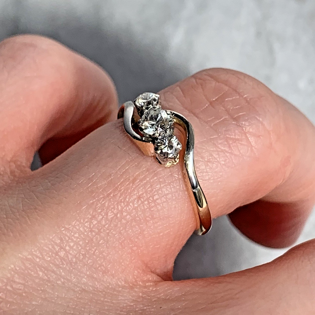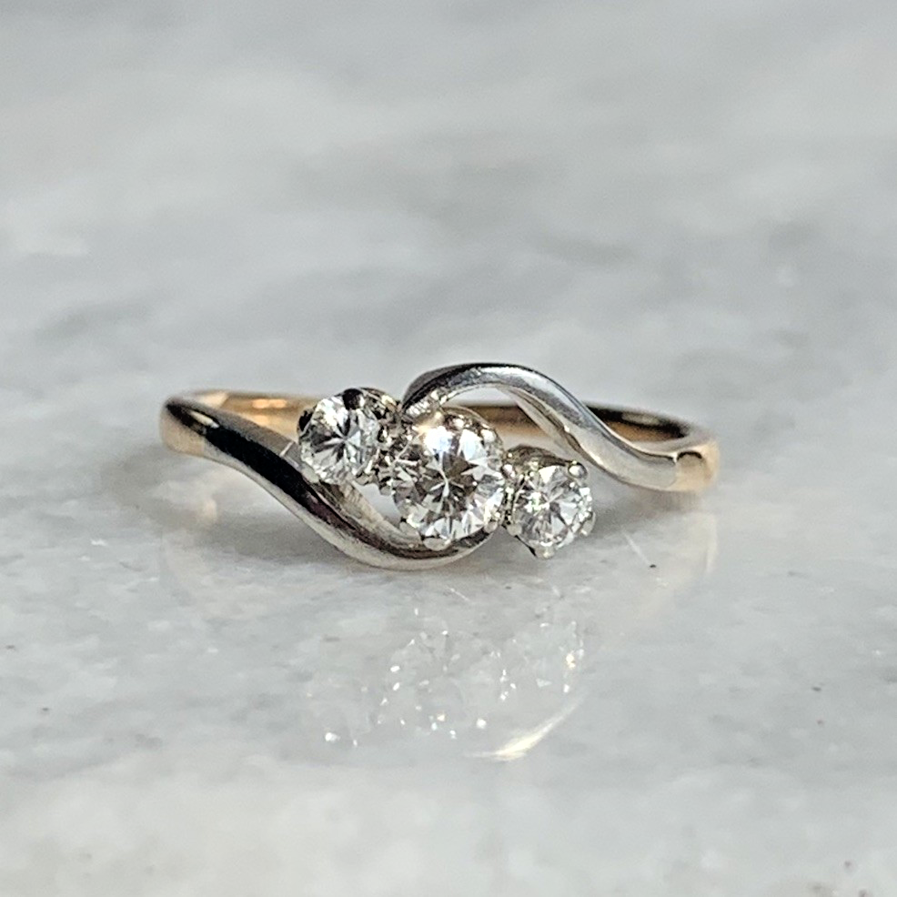 A beautiful gold bypass style ring showcasing a trilogy of round cut diamonds set in platinum.
