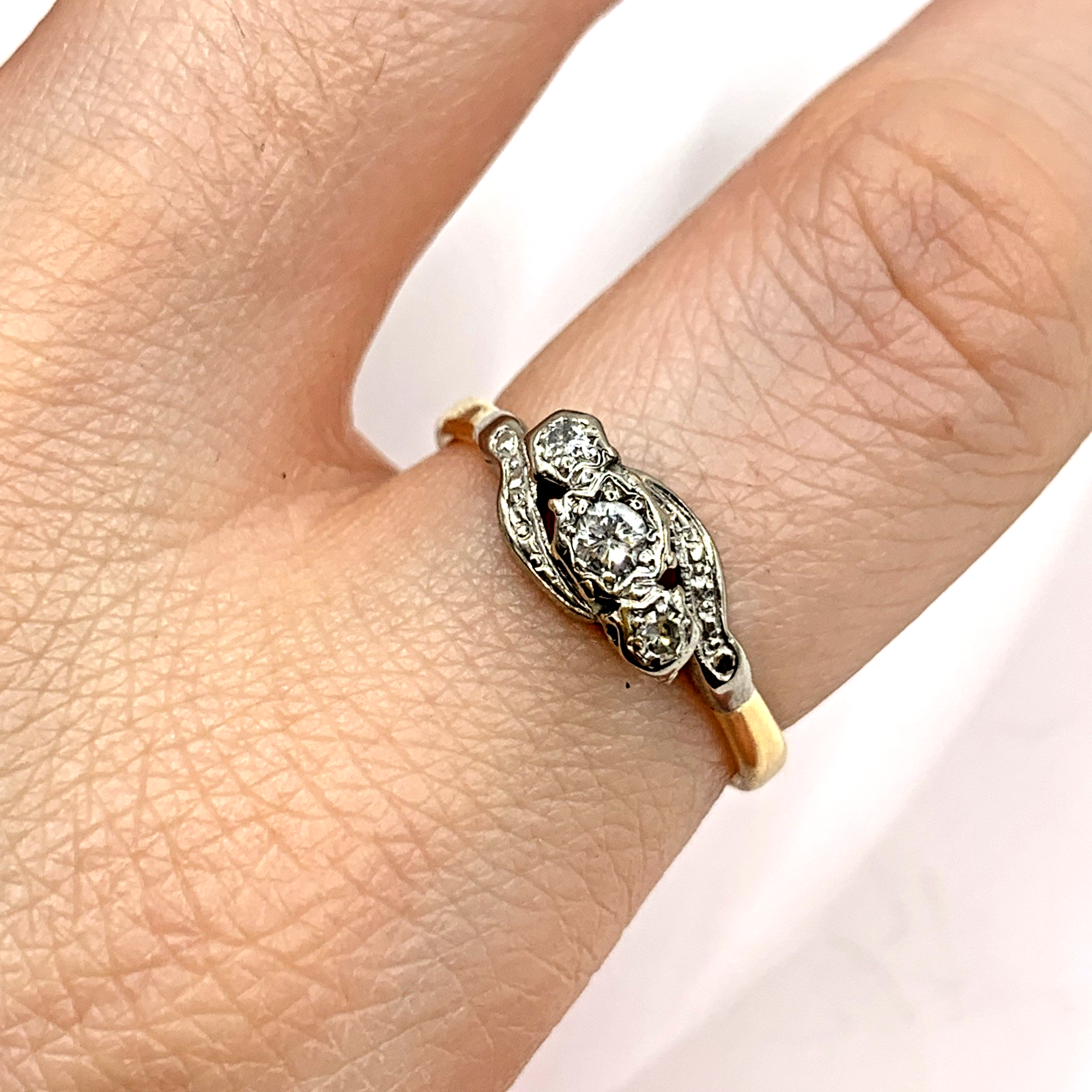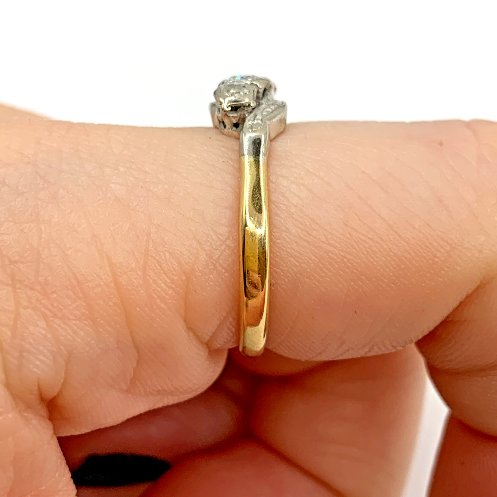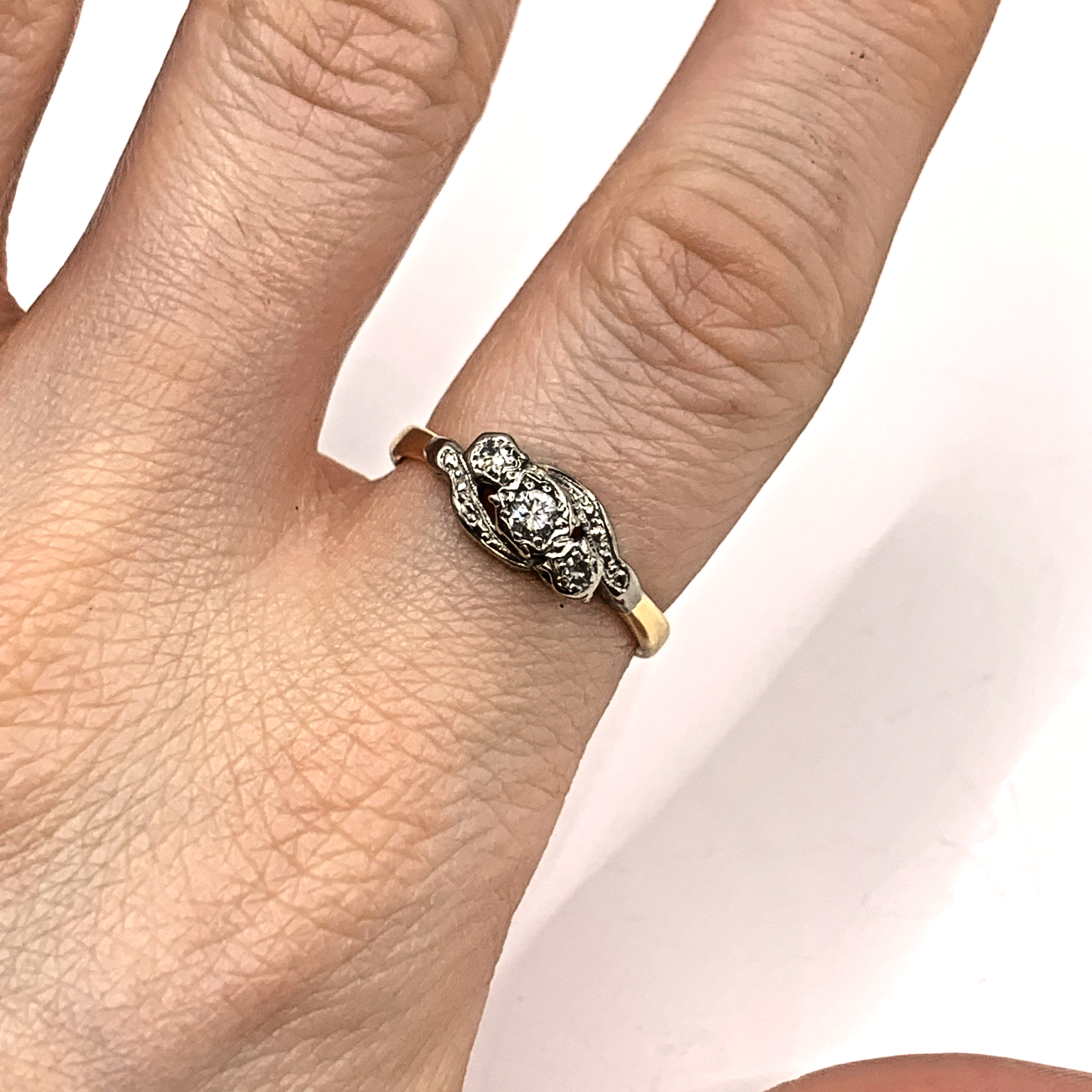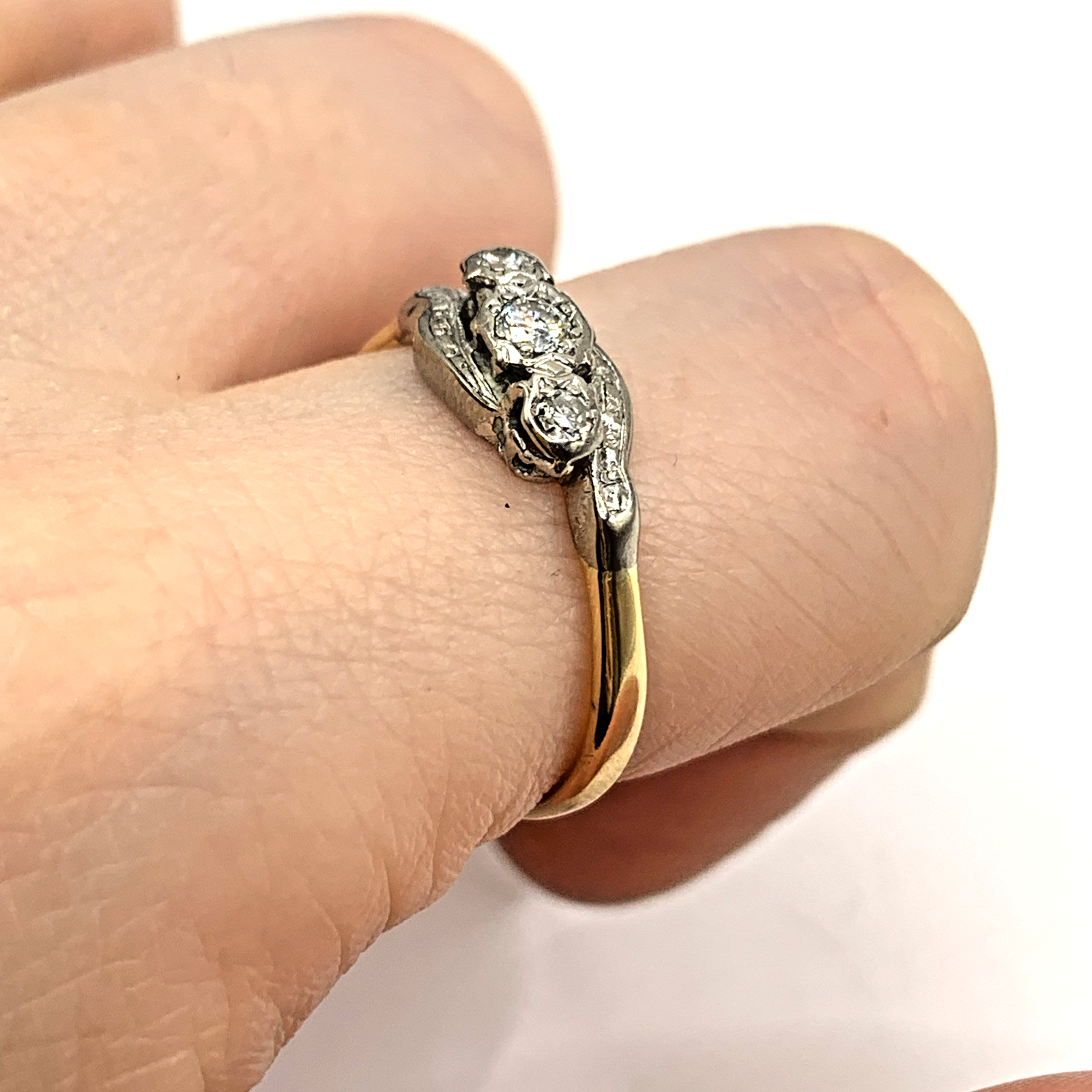 A beautiful gold twist style ring featuring a trilogy of platinum set diamonds.