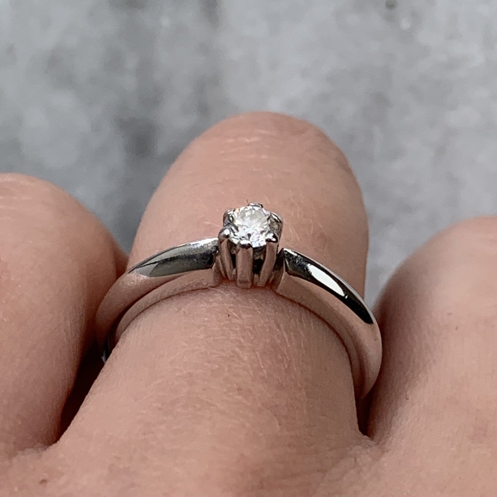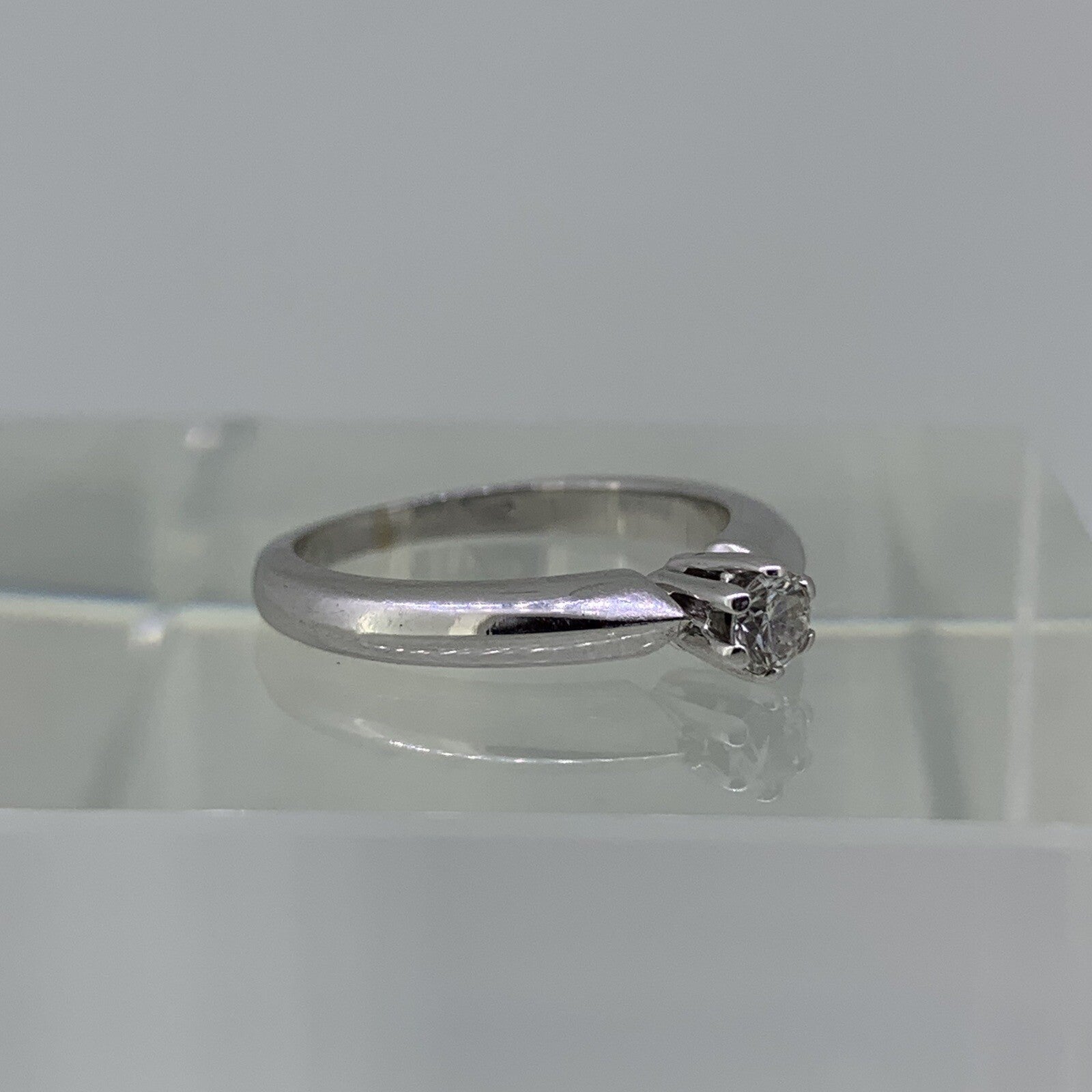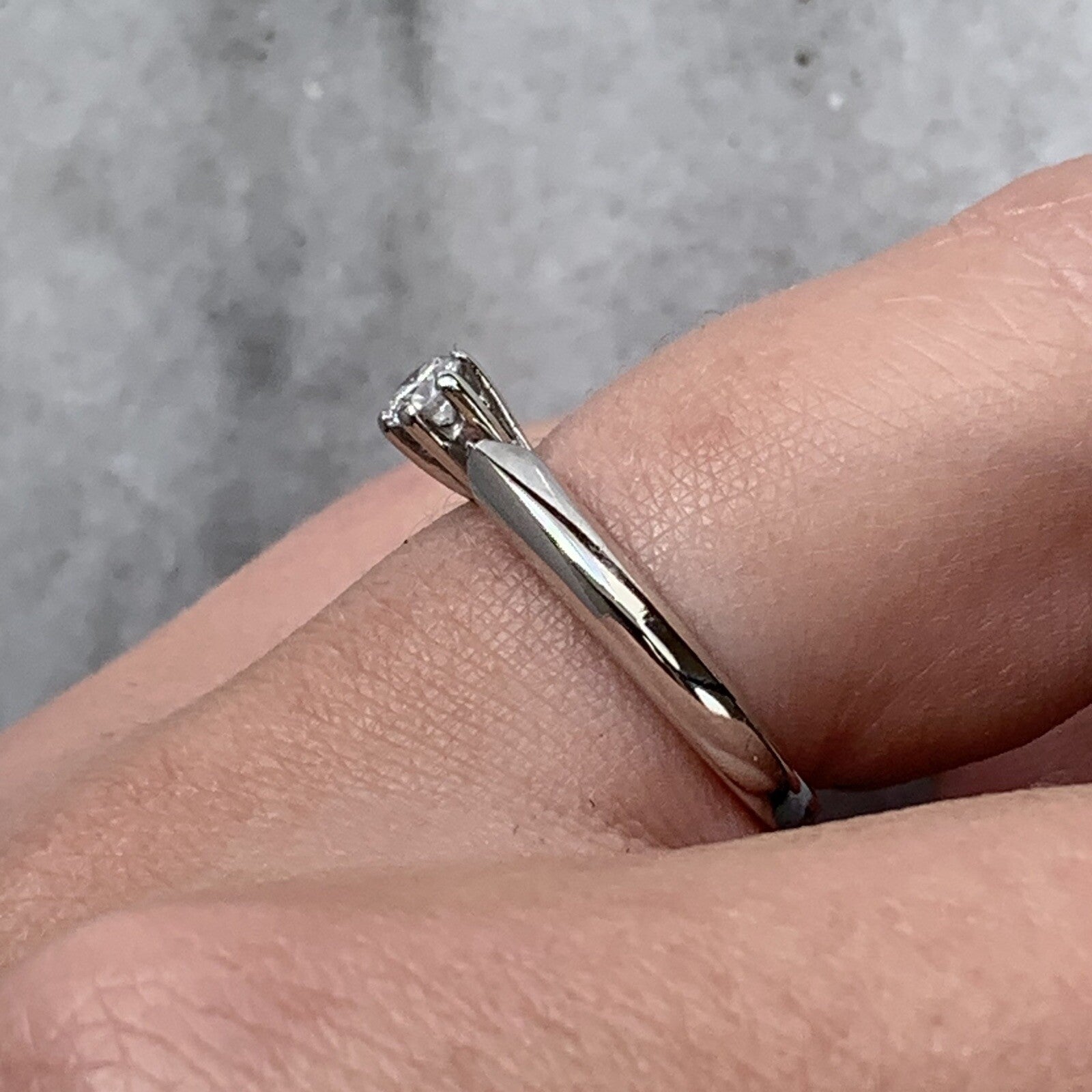 A beautiful solitaire engagement style ring with a natural round cut diamond at .15ct set upon a thick-shouldered shank.