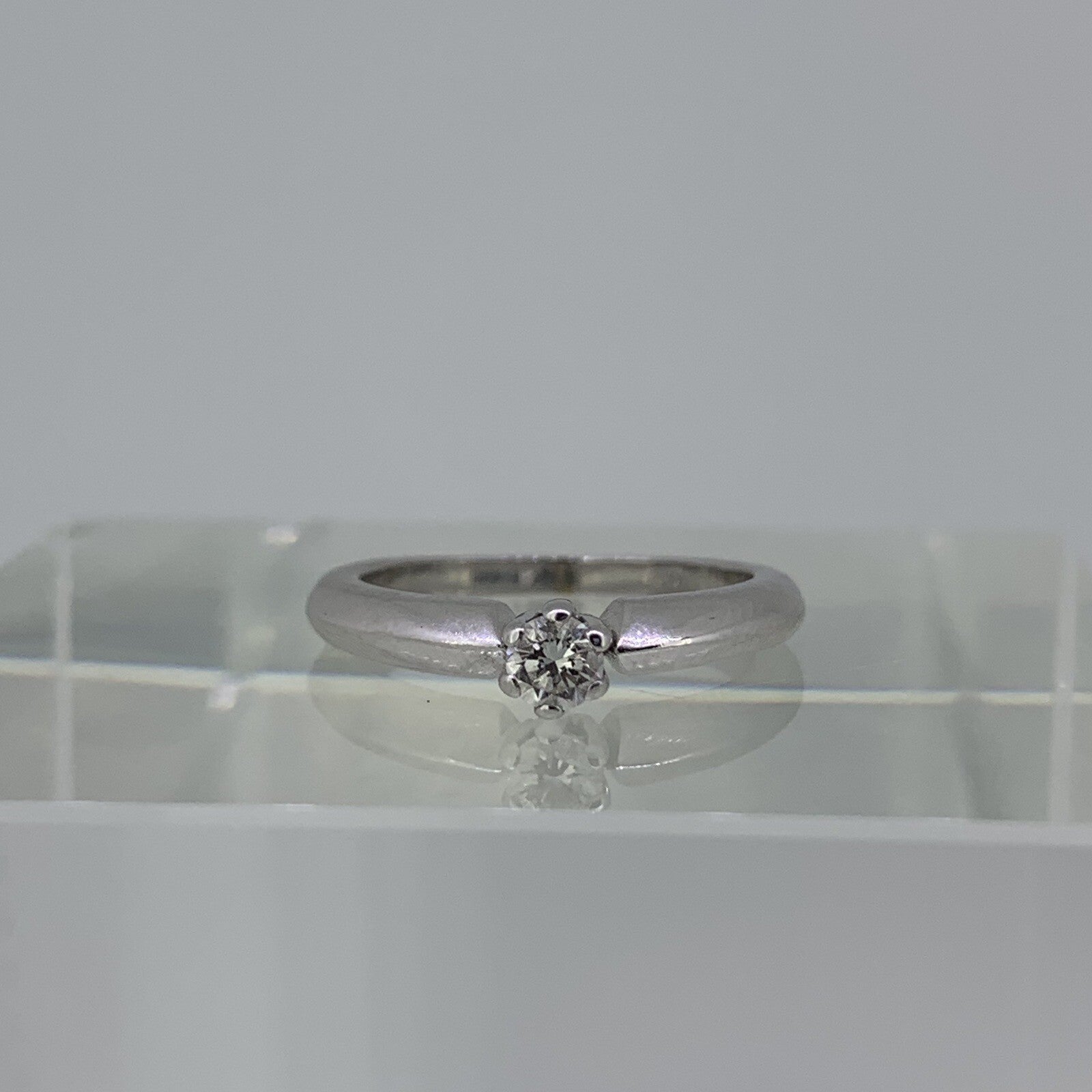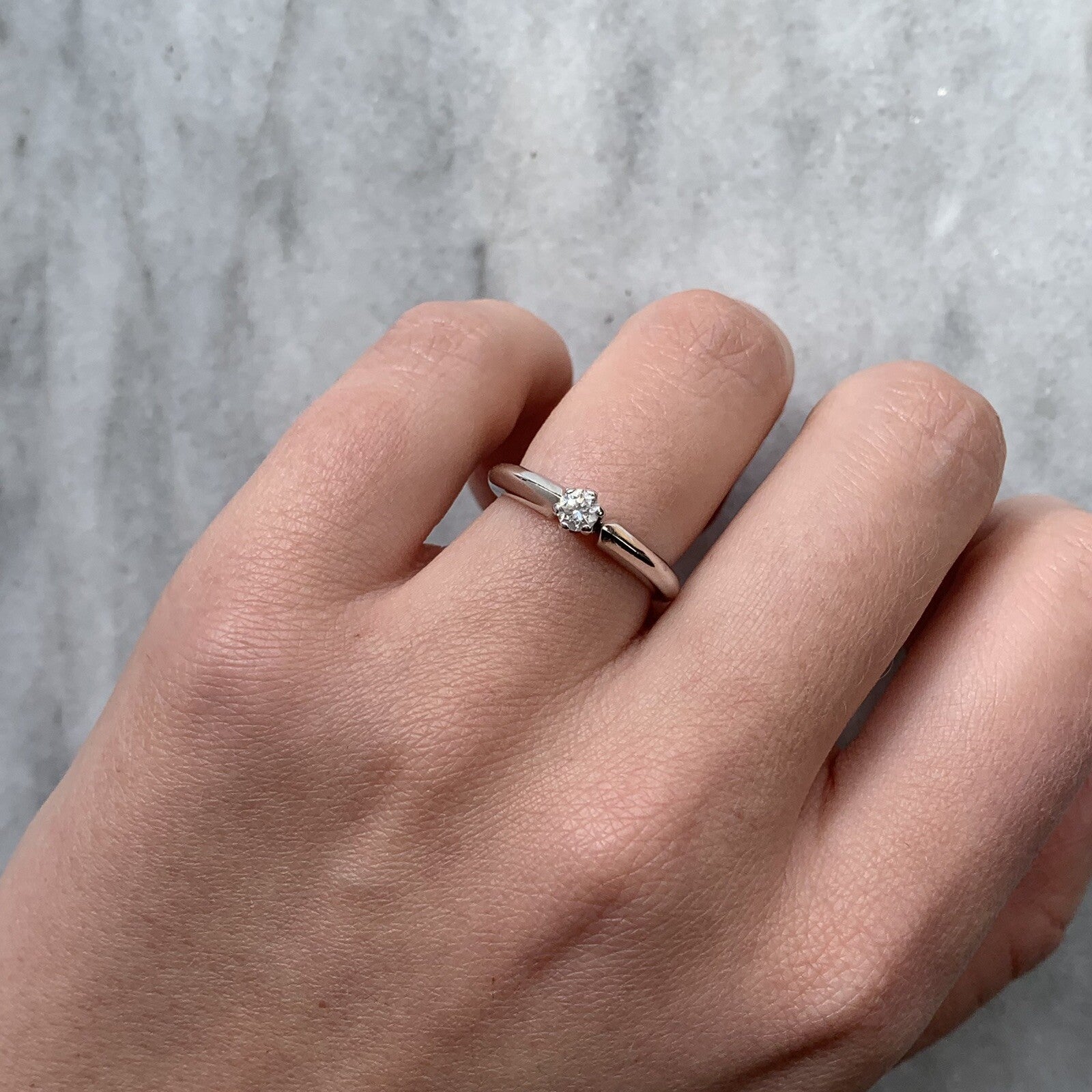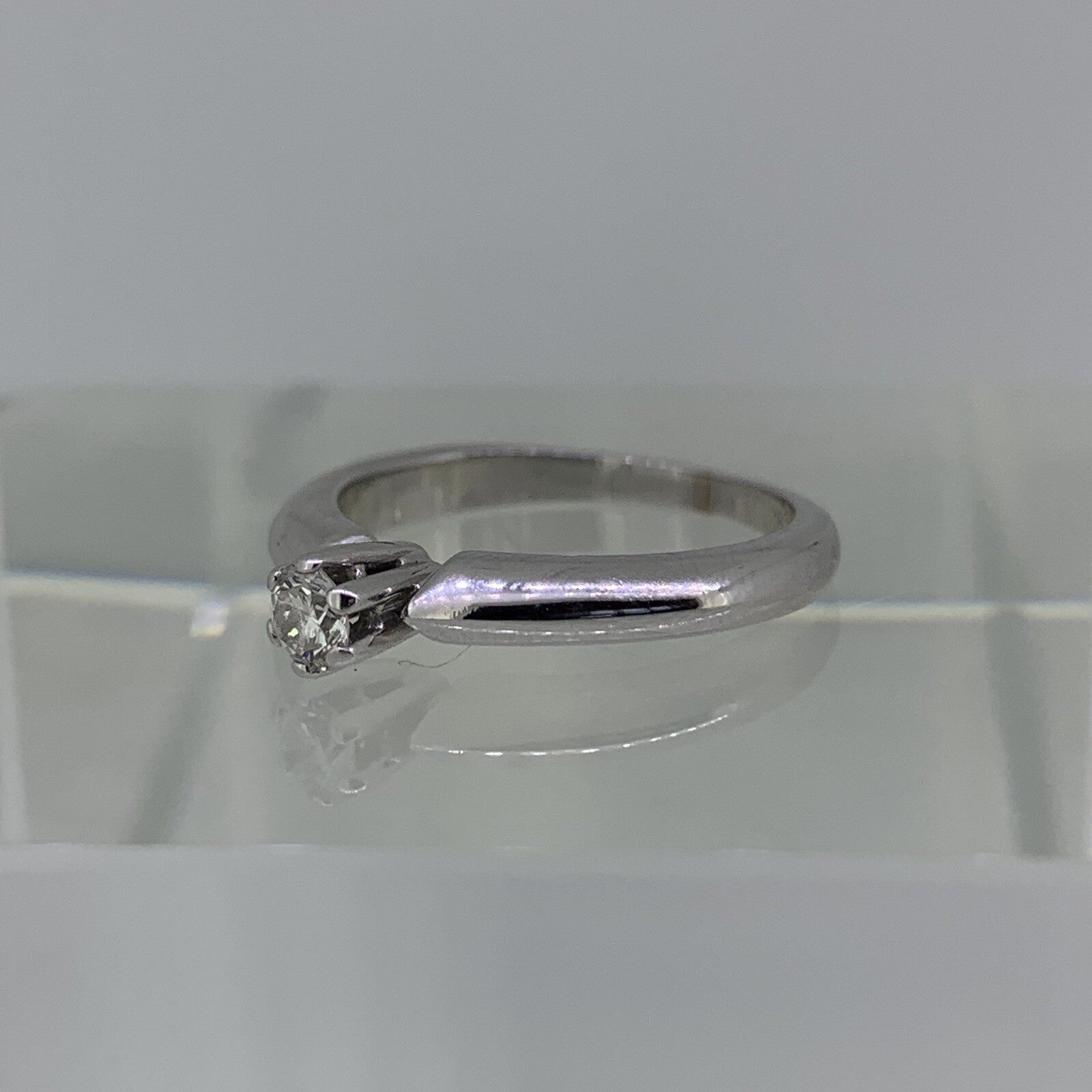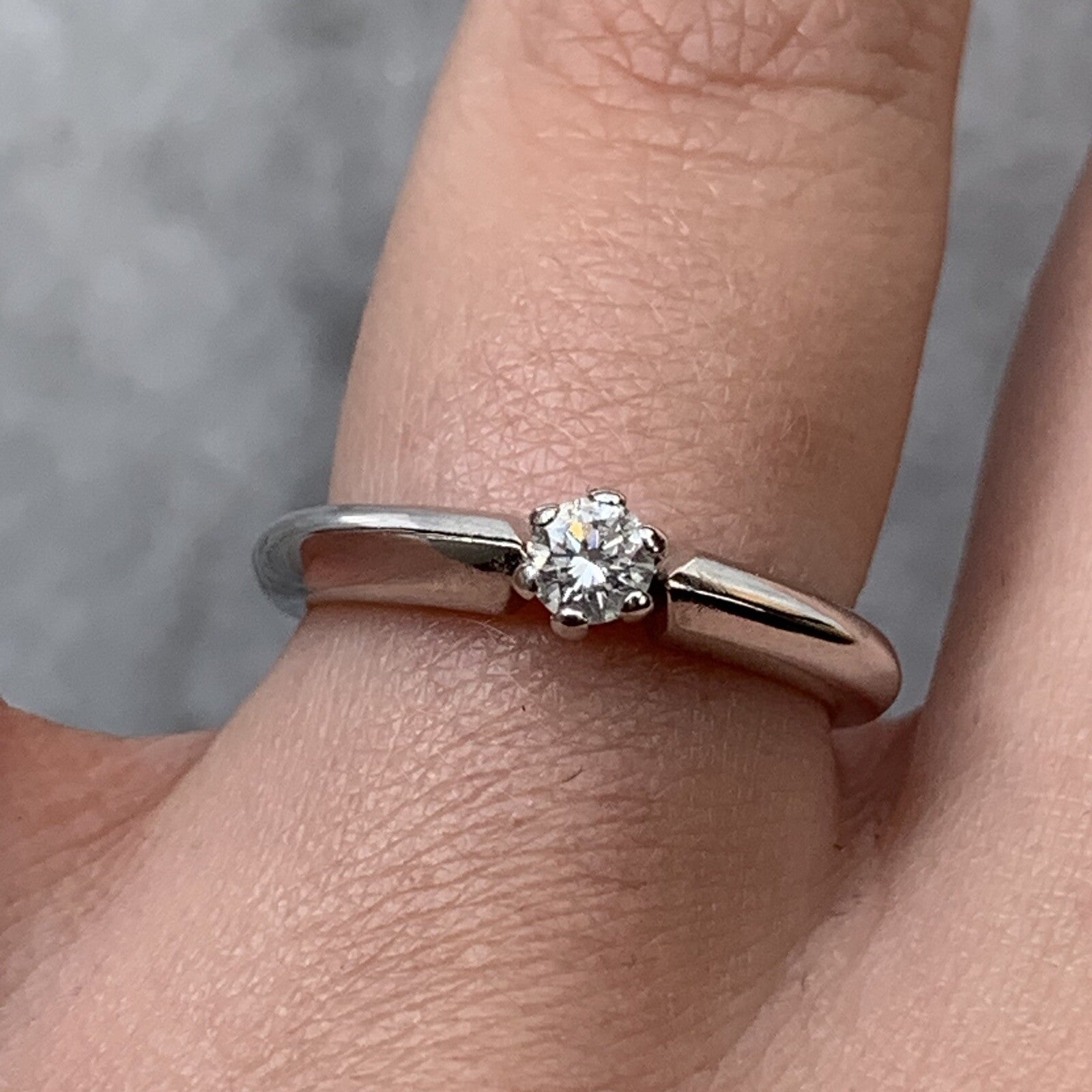 A beautiful solitaire engagement style ring with a natural round cut diamond at .15ct set upon a thick-shouldered shank.