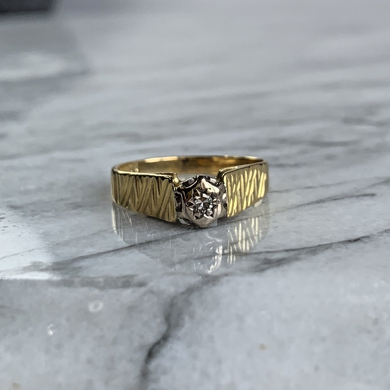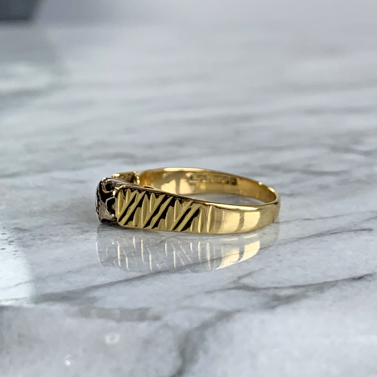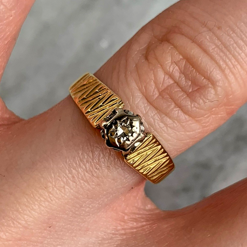 18 ct Gold Ring Diamond Solitaire Textured Shoulder - Size M