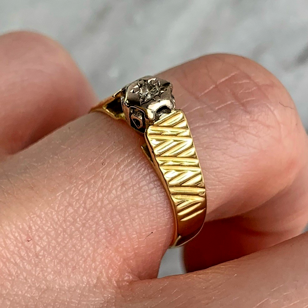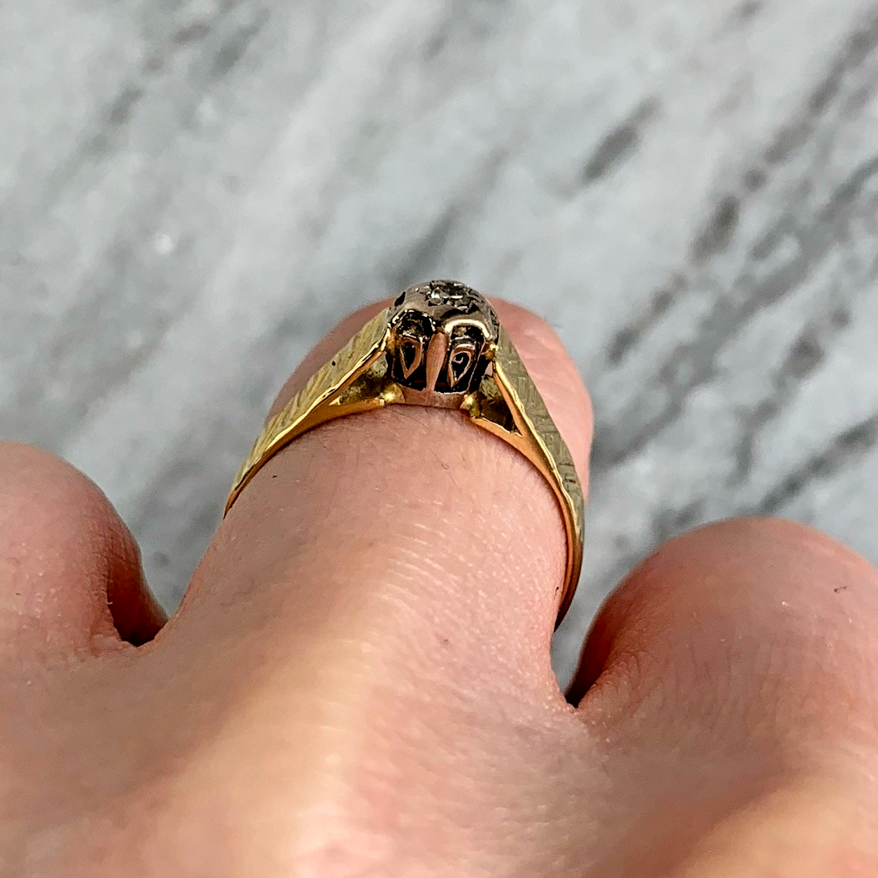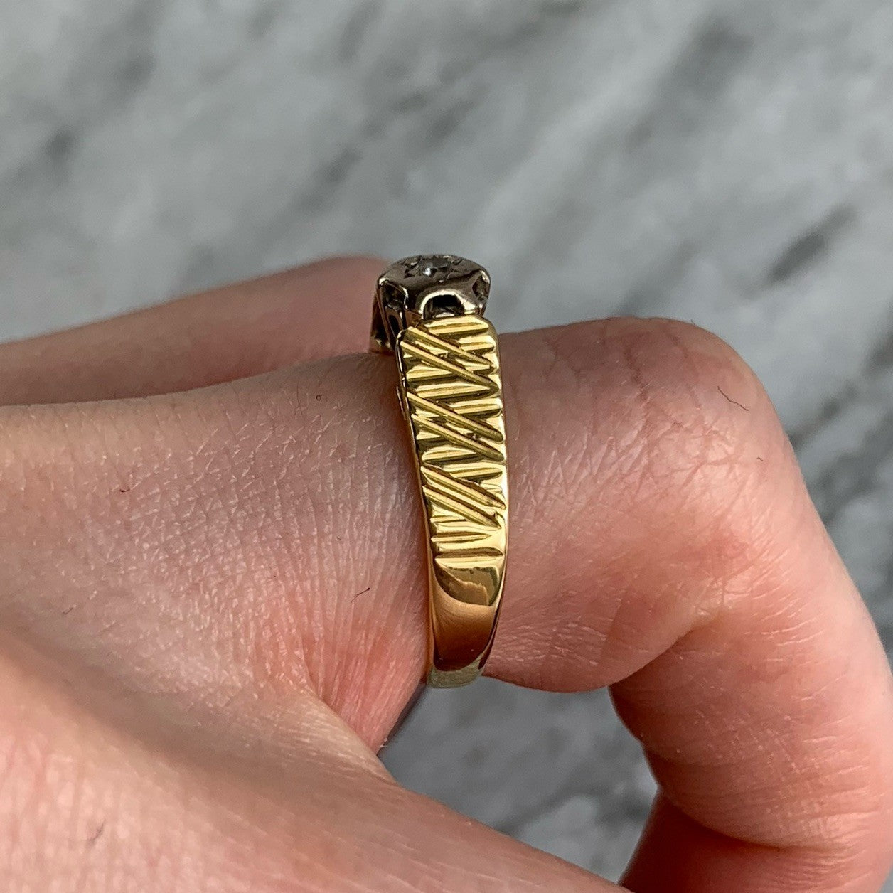 18 ct Gold Ring Diamond Solitaire Textured Shoulder - Size M