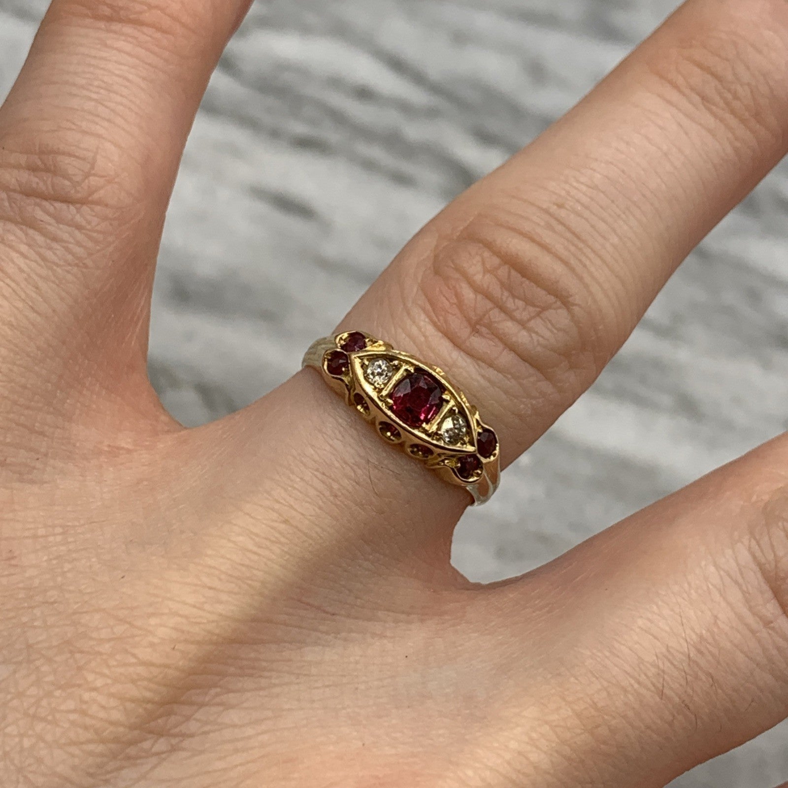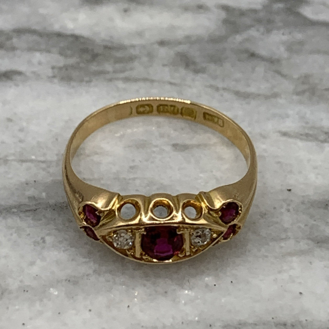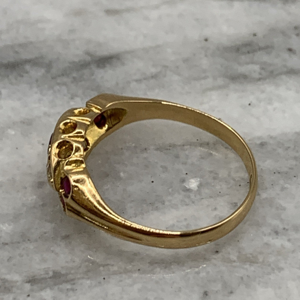 A stunning vintage gold boat style ring featuring round cut rubies accented by a pair of diamonds.