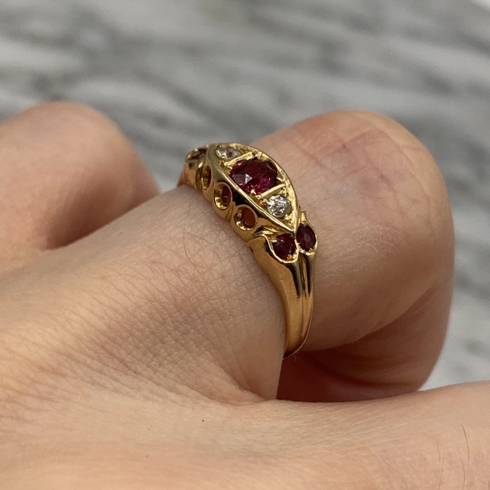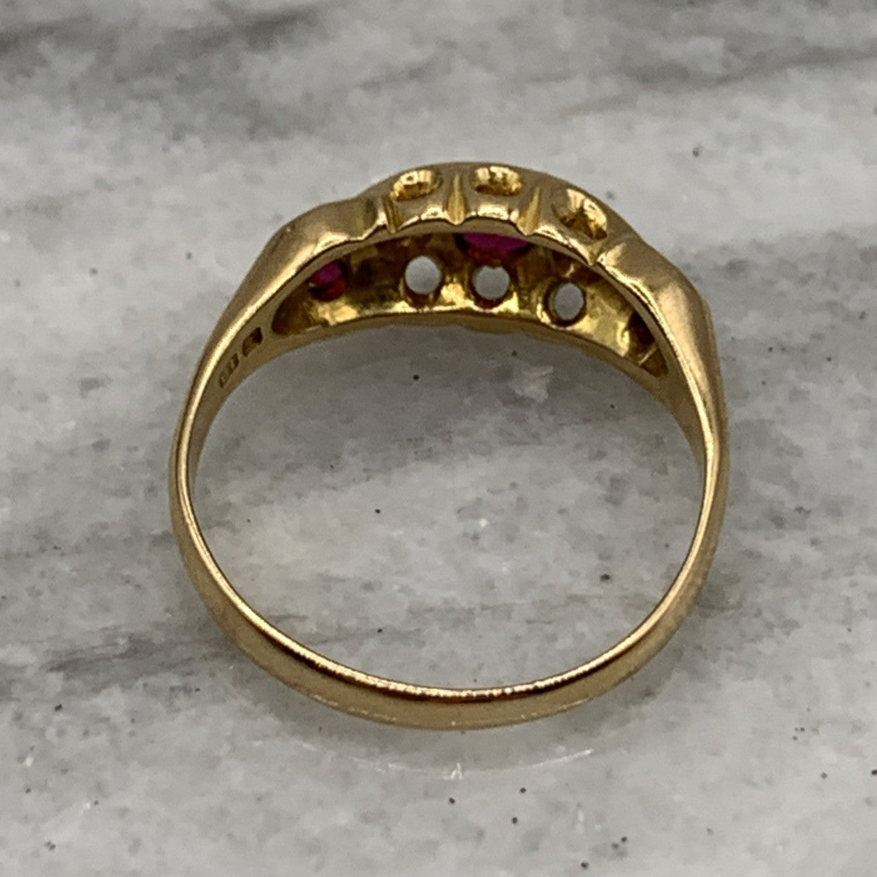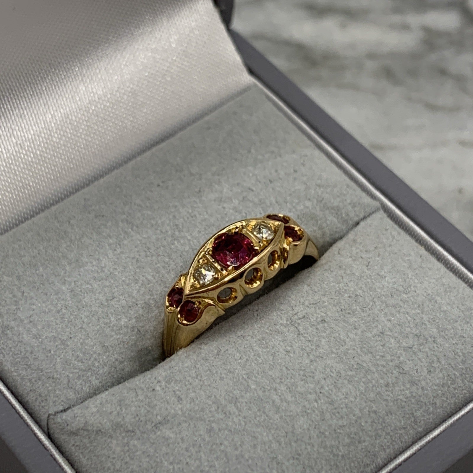 18 ct Gold Ruby & Diamond Antique Boat Ring 750 Yellow Gold - Size J 1/2