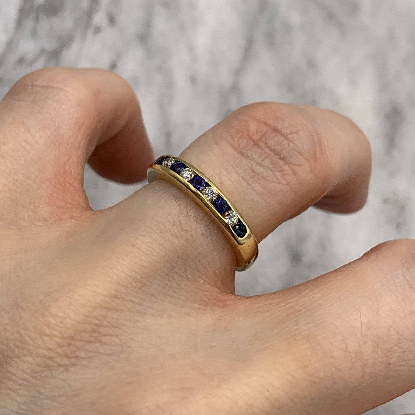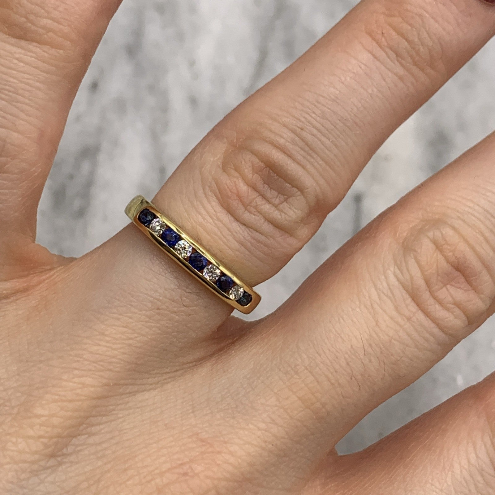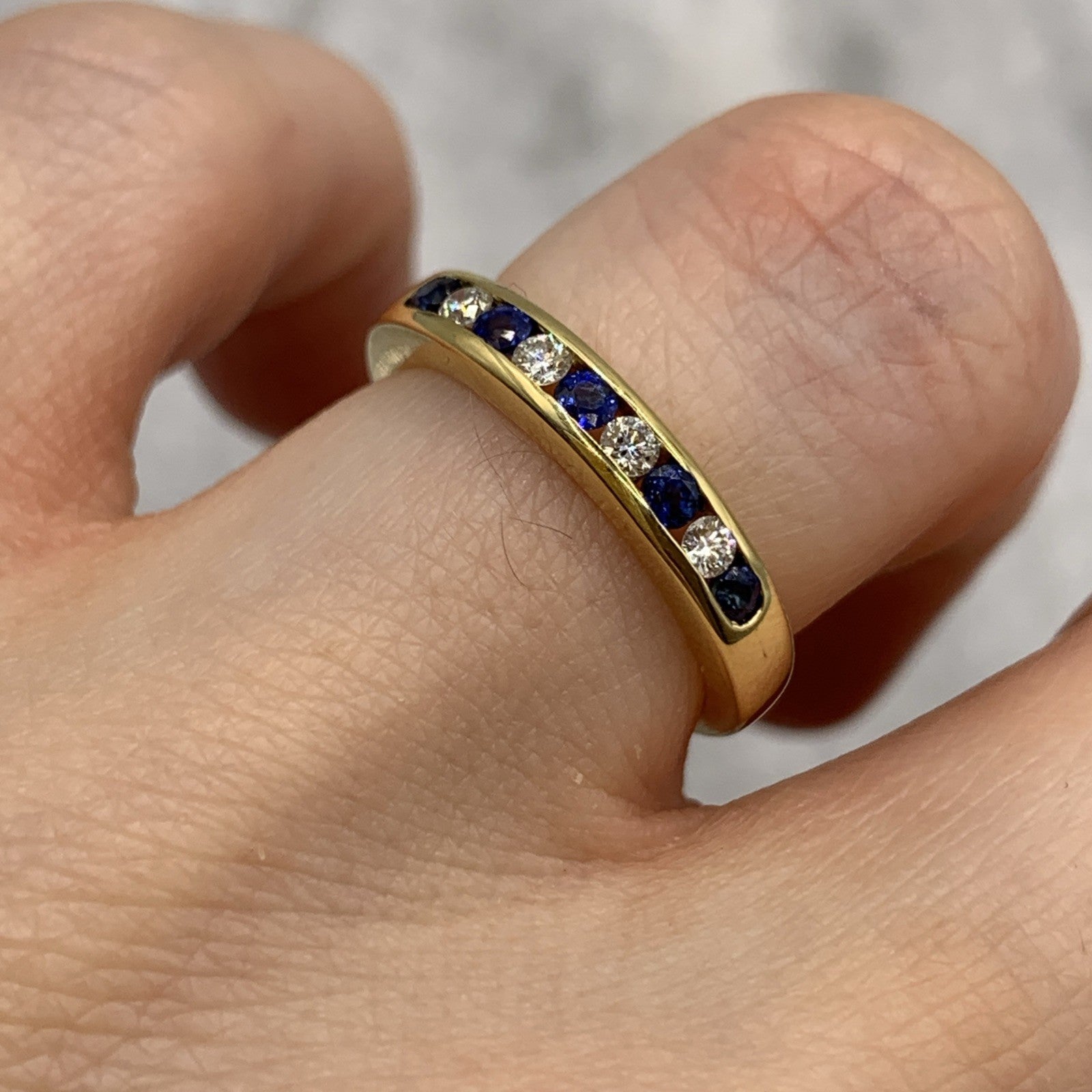 - A stunning gold band ring featuring a channel of alternating diamonds and sapphires.