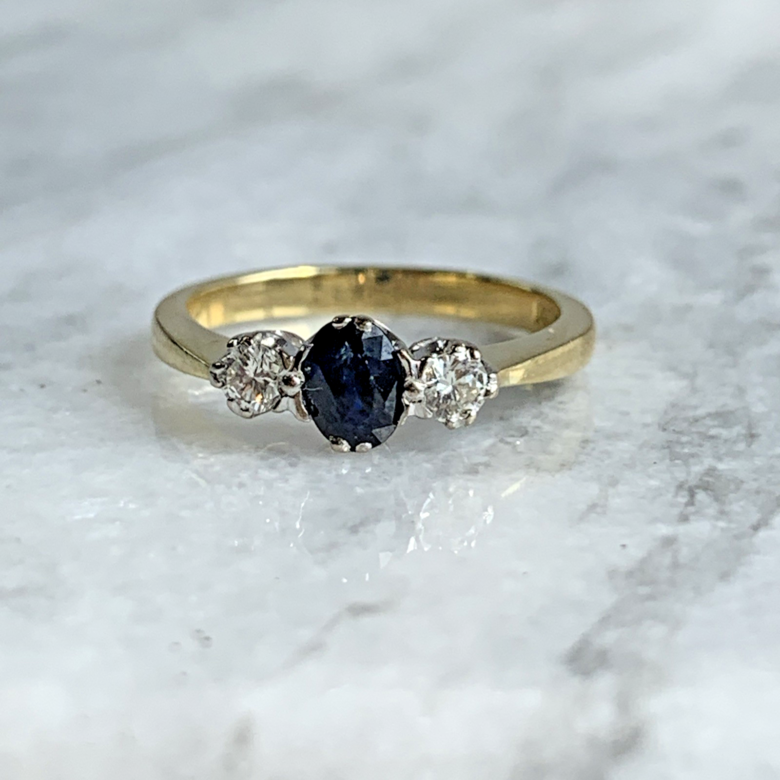 A lovely gold ring showcasing an oval cut sapphire flanked by a duo of diamonds.